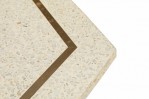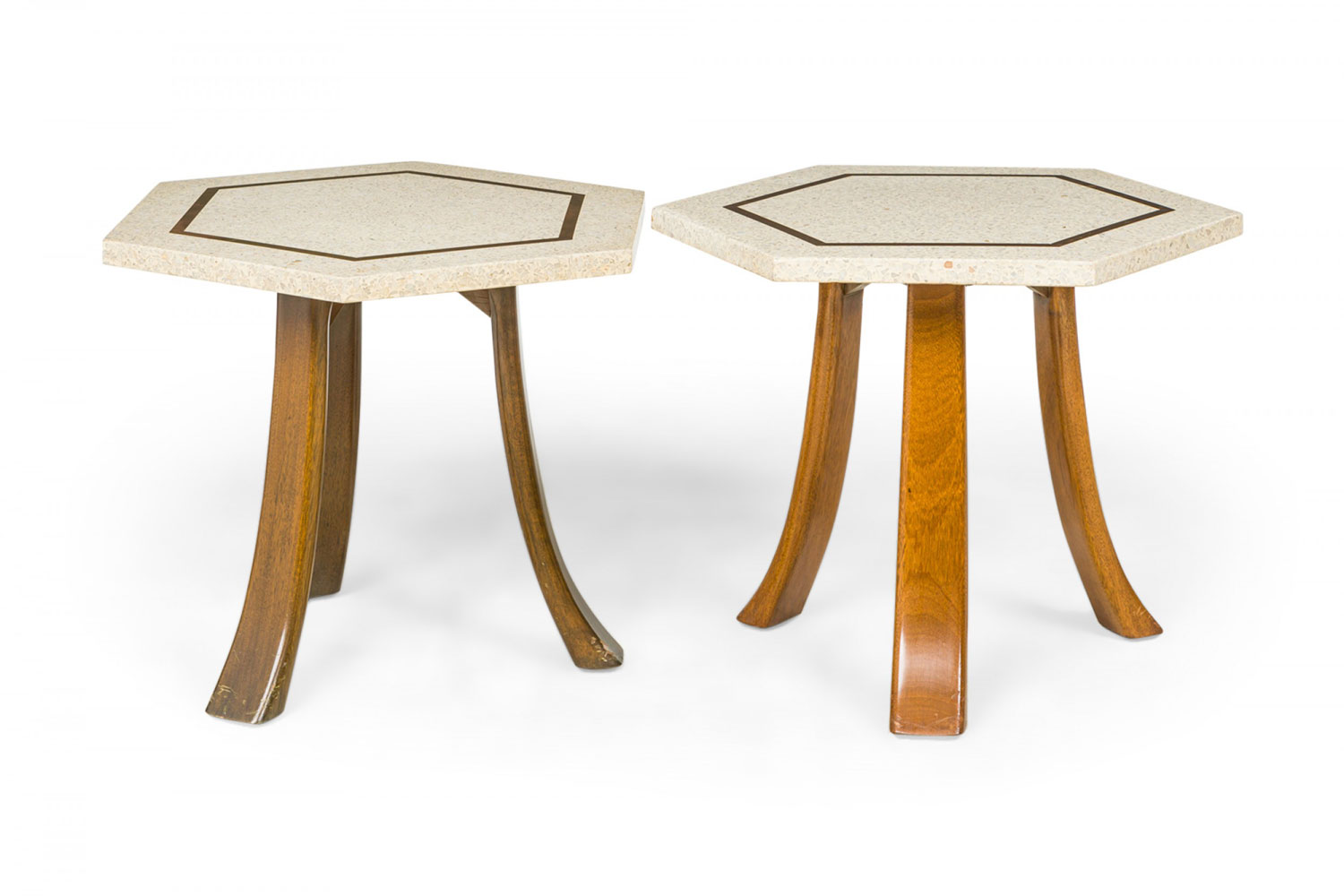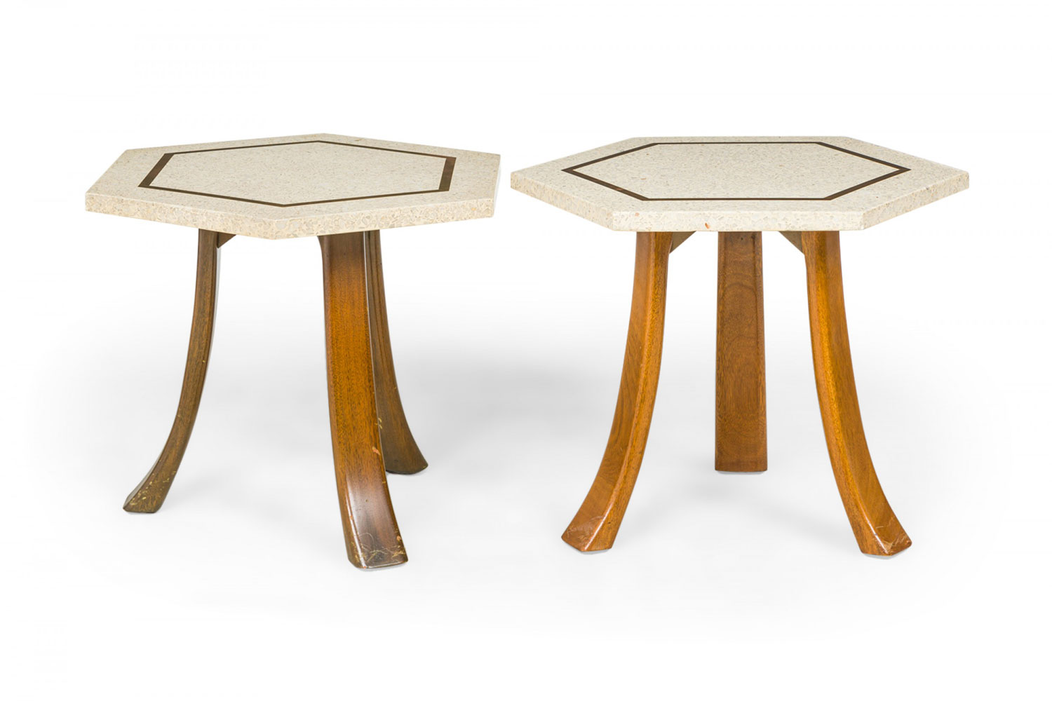 2 American Mid-Century end / side tables with hexagonal white terrazzo tops with a bronze inlaid hexagonal design supported on three curved wooden legs. (HARVEY PROBBER)(PRICED AS PAIR)(Similar tables: DUF0356A-E)