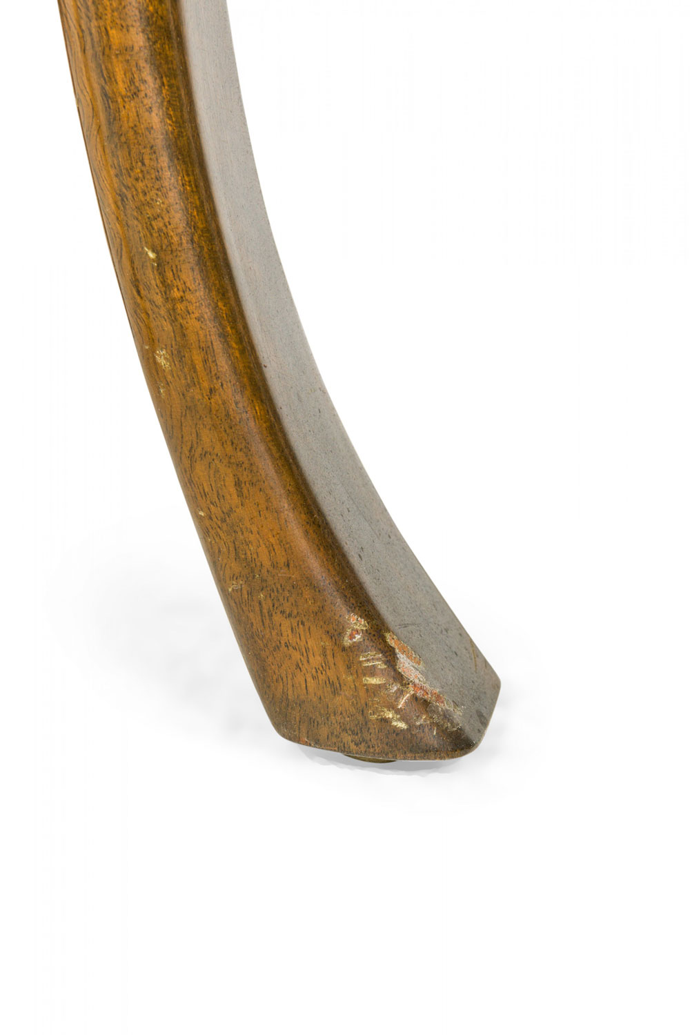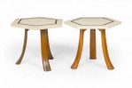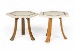 2 American Mid-Century end / side tables with hexagonal white terrazzo tops with a bronze inlaid hexagonal design supported on three curved wooden legs. (HARVEY PROBBER)(PRICED AS PAIR)(Similar tables: DUF0356A-E).