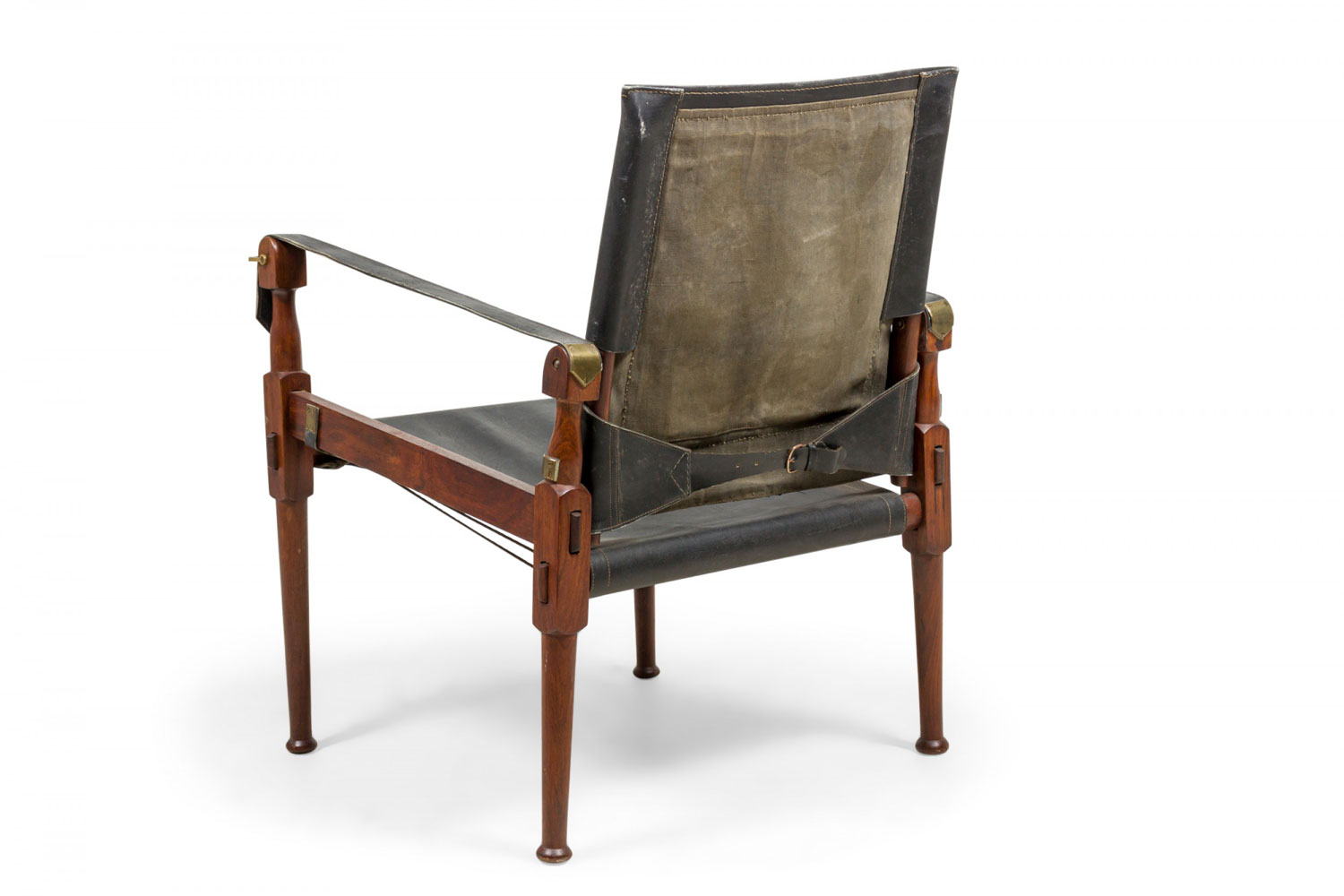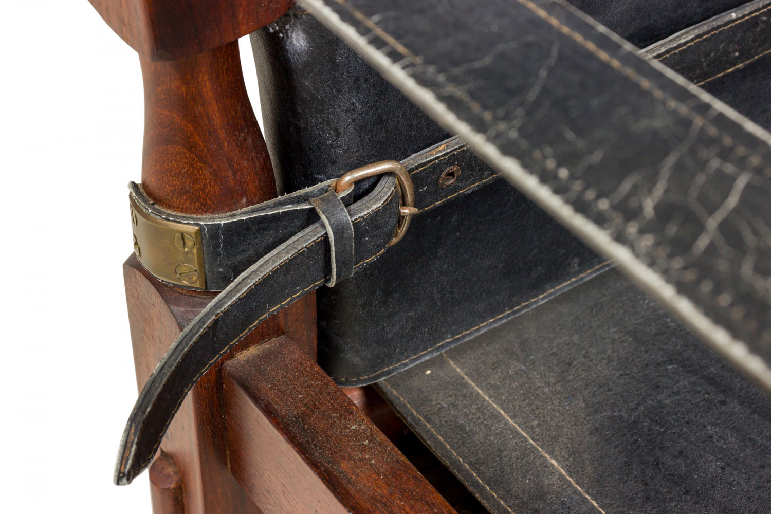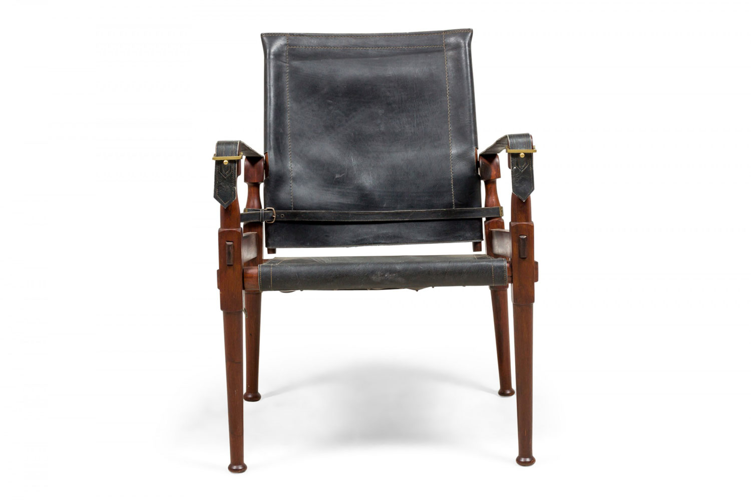 PAIR of Pakistani Mid-Century 'Roorkee' safari campaign chairs with carved walnut frames and black leather sling seats, backs and arms that collapse down to a portable form. (M. HAYAT & BROS LTD)(PRICED AS PAIR).