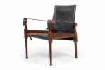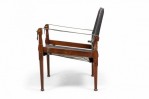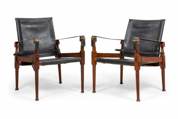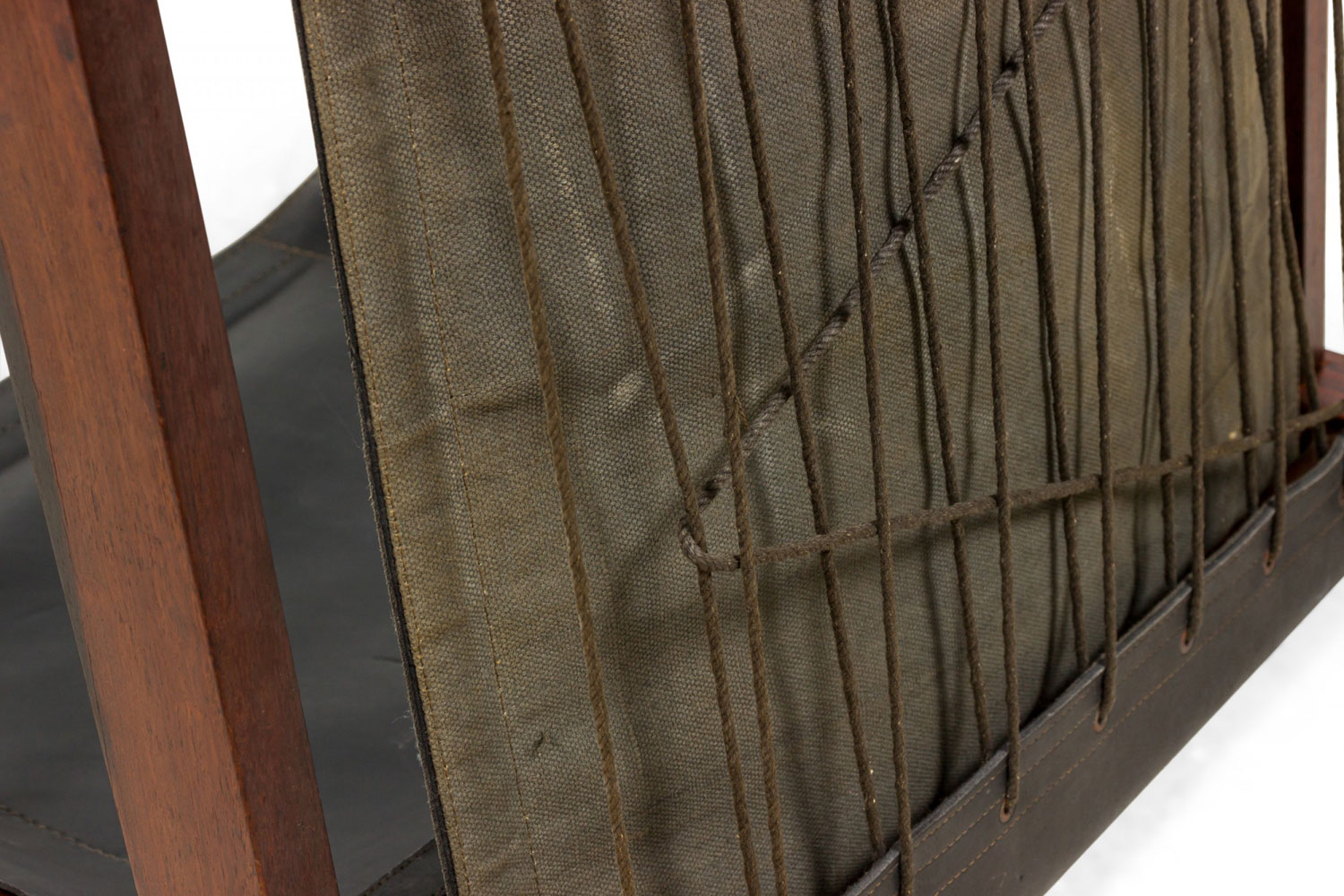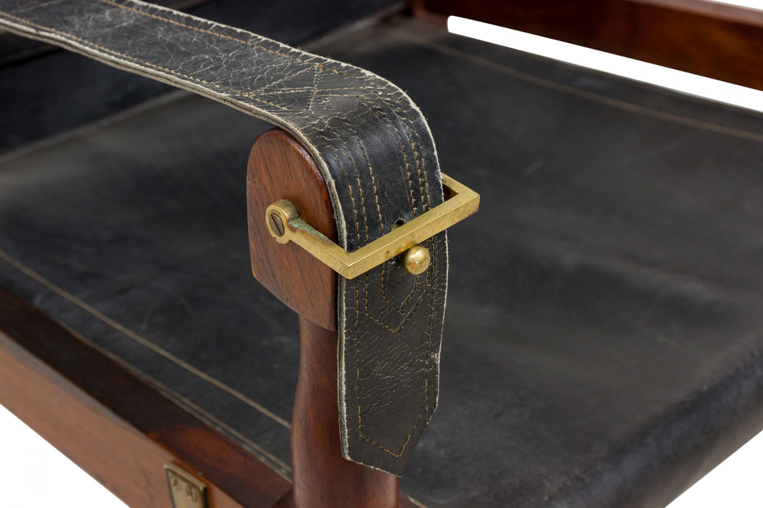 PAIR of Pakistani Mid-Century 'Roorkee' safari campaign chairs with carved walnut frames and black leather sling seats, backs and arms that collapse down to a portable form. (M. HAYAT & BROS LTD)(PRICED AS PAIR).