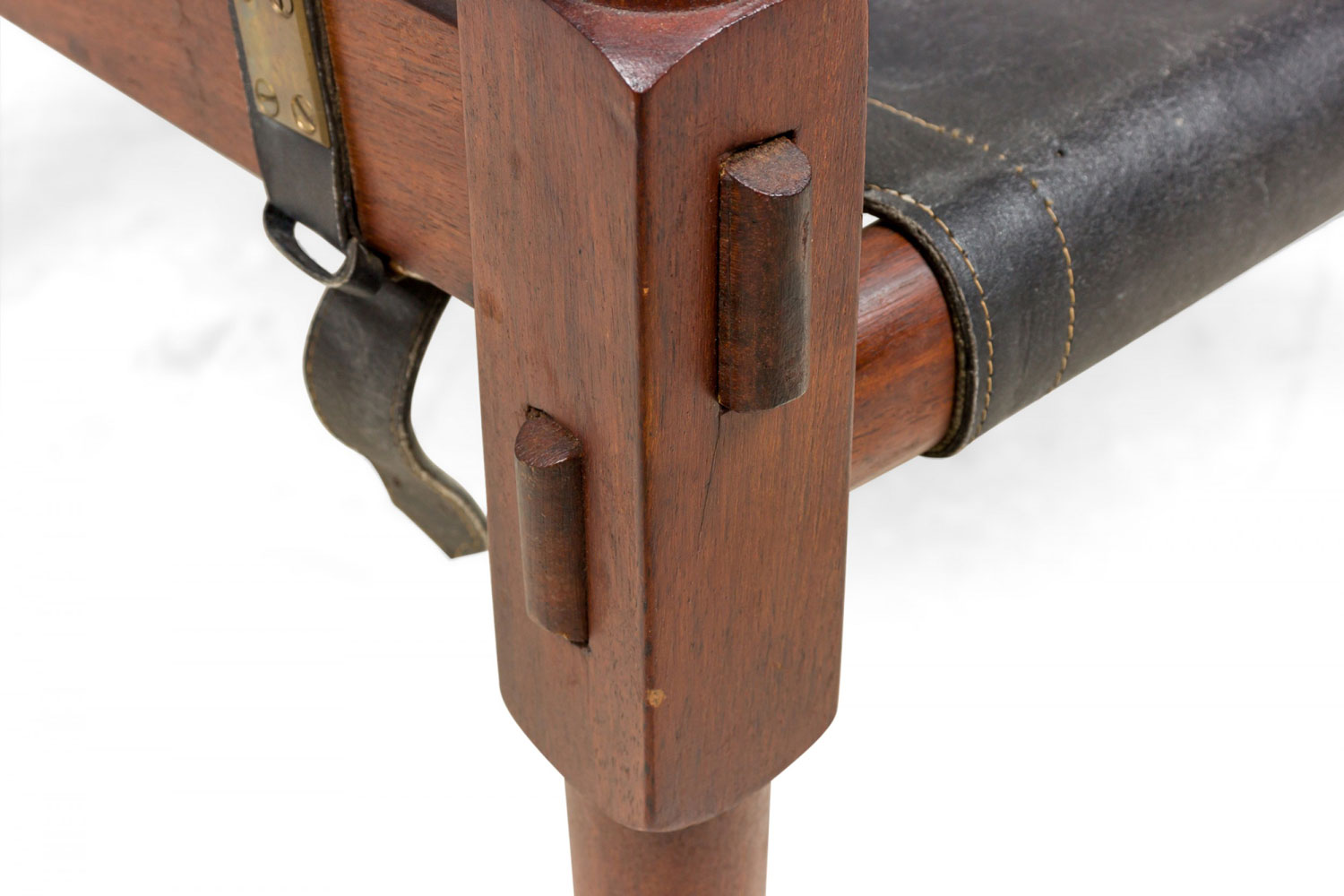 PAIR of Pakistani Mid-Century 'Roorkee' safari campaign chairs with carved walnut frames and black leather sling seats, backs and arms that collapse down to a portable form. (M. HAYAT & BROS LTD)(PRICED AS PAIR)