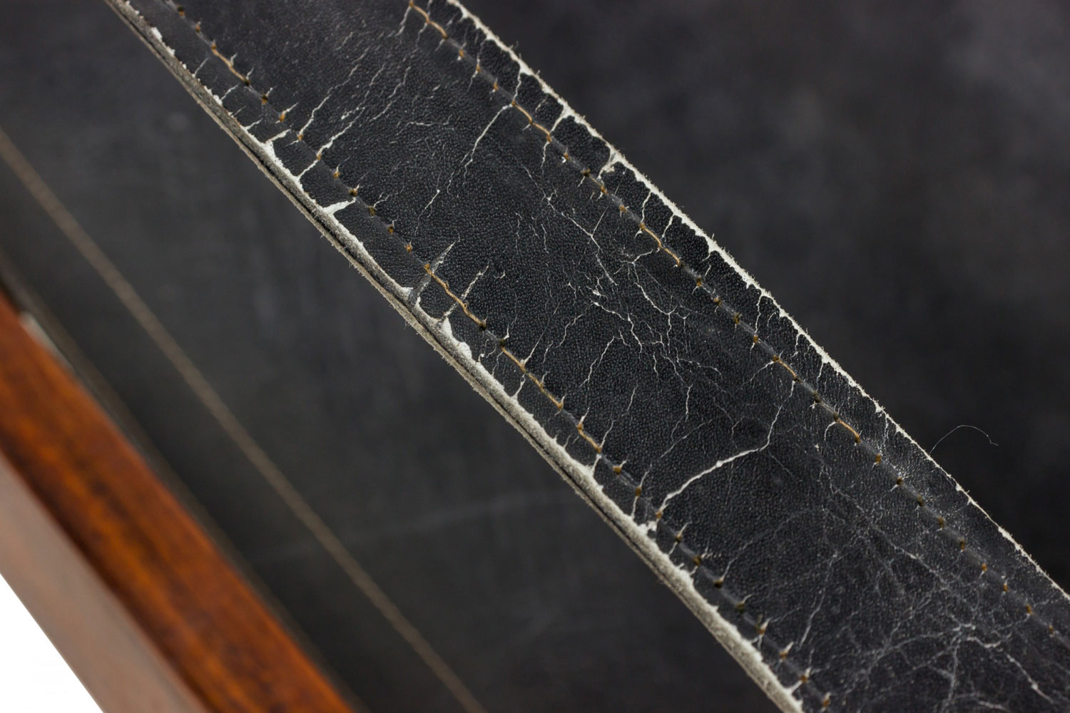 Style: Mid-Century Materials & Techniques: Leather, walnut, wood Category: Seating Good; Wear consistent with age and use