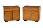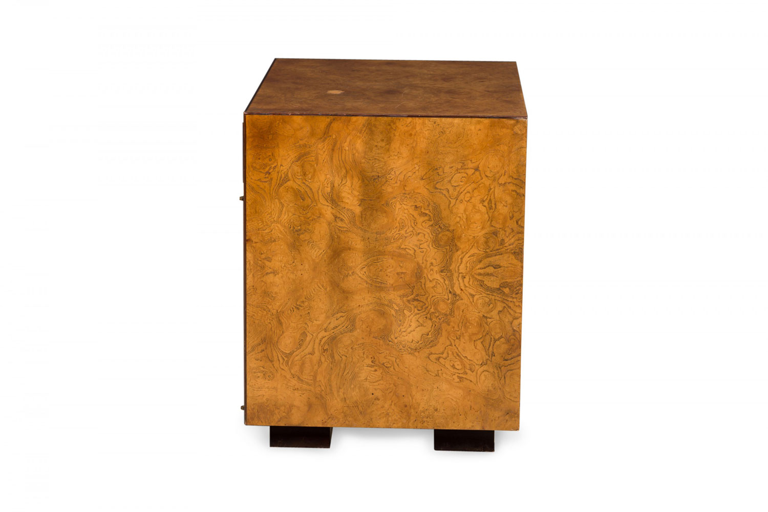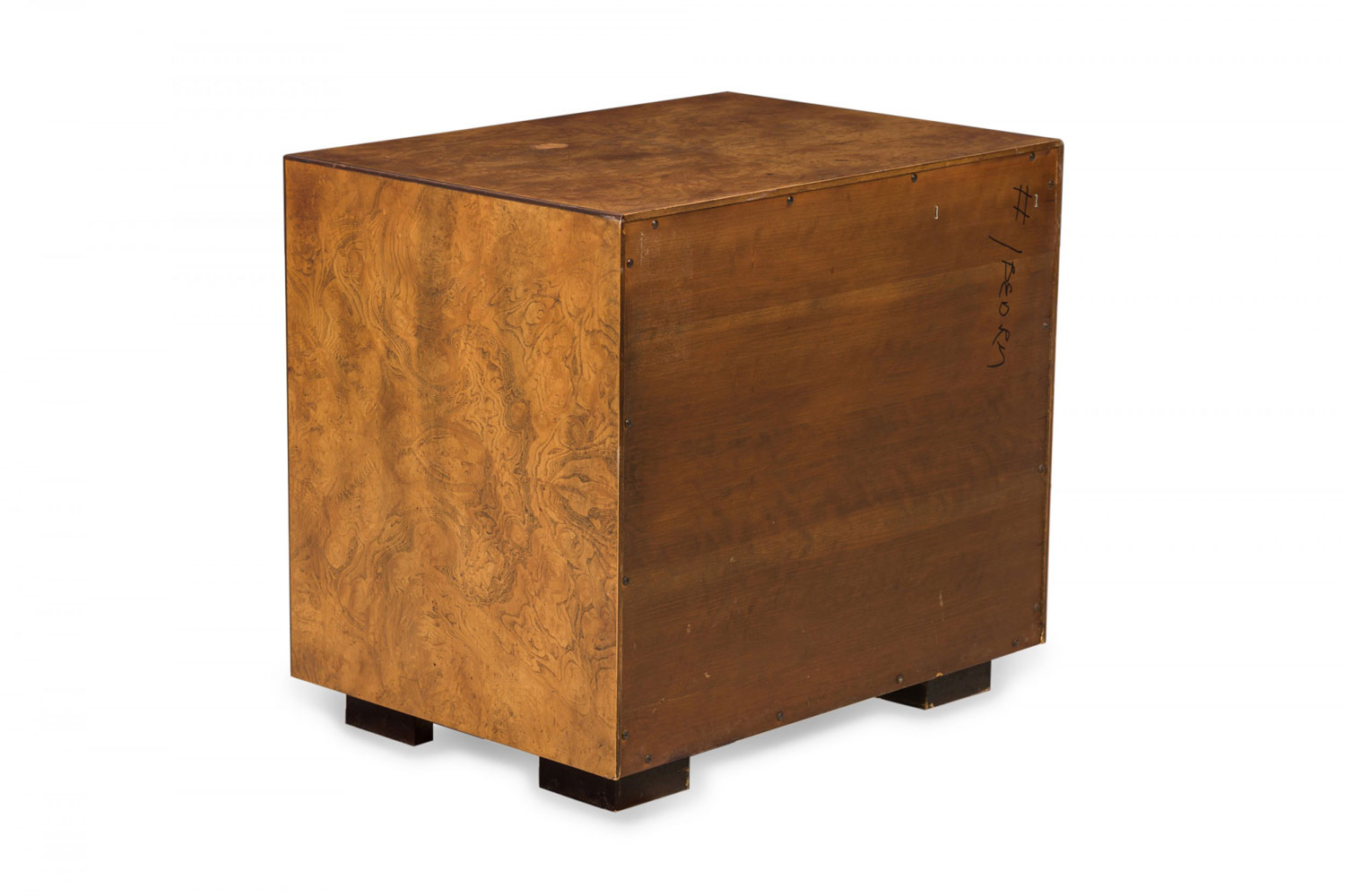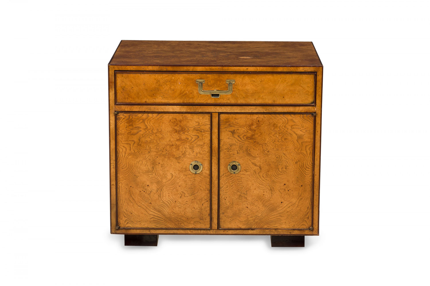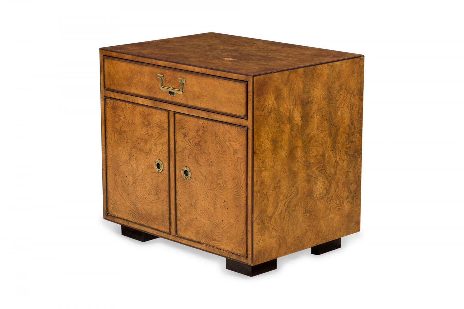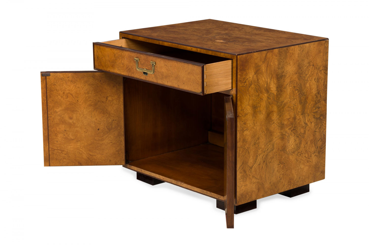 PAIR of American Mid-Century nightstands / commodes with a burl wood veneer, single drawer with brass pulls, and two cabinet doors with brass pulls below. (JOHN WIDDICOMB)(PRICED AS PAIR)