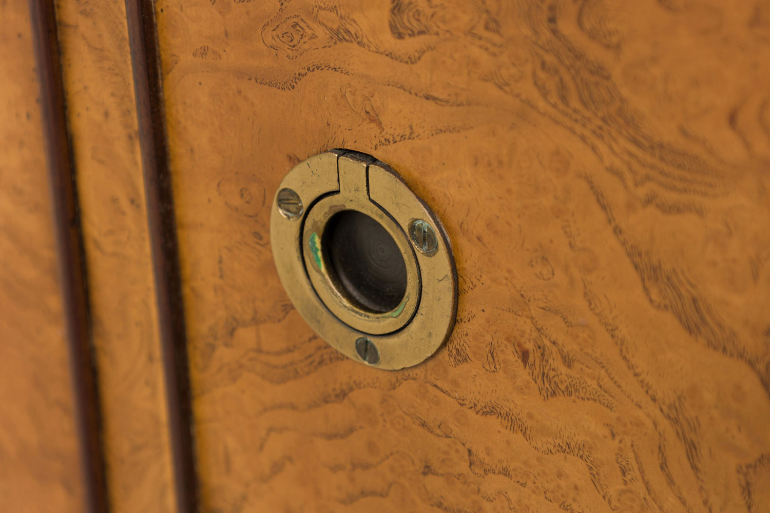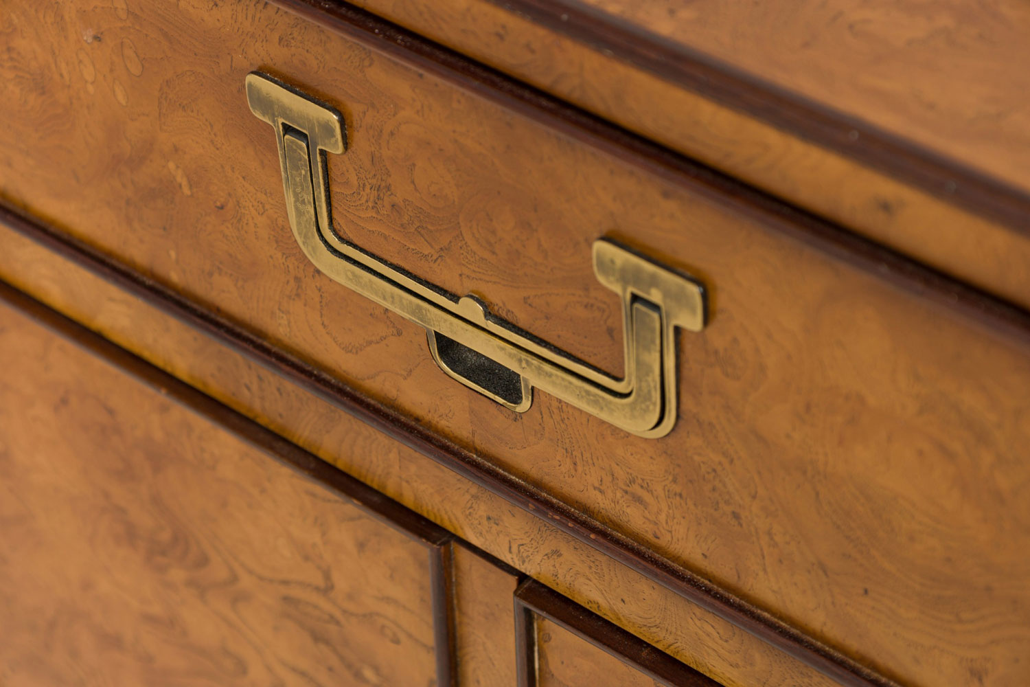 Pair of John Widdicomb American Mid-Century Burl Veneer and Brass Nightstands / Commodes