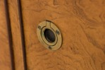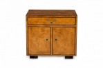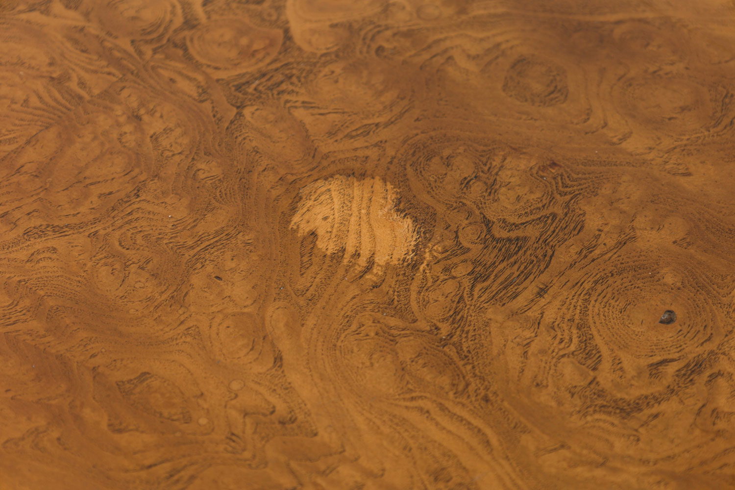 Style: Mid-Century Materials & Techniques: Brass, burl, metal, veneer, wood Category: Tables, Bedroom Good; Wear consistent with age and use