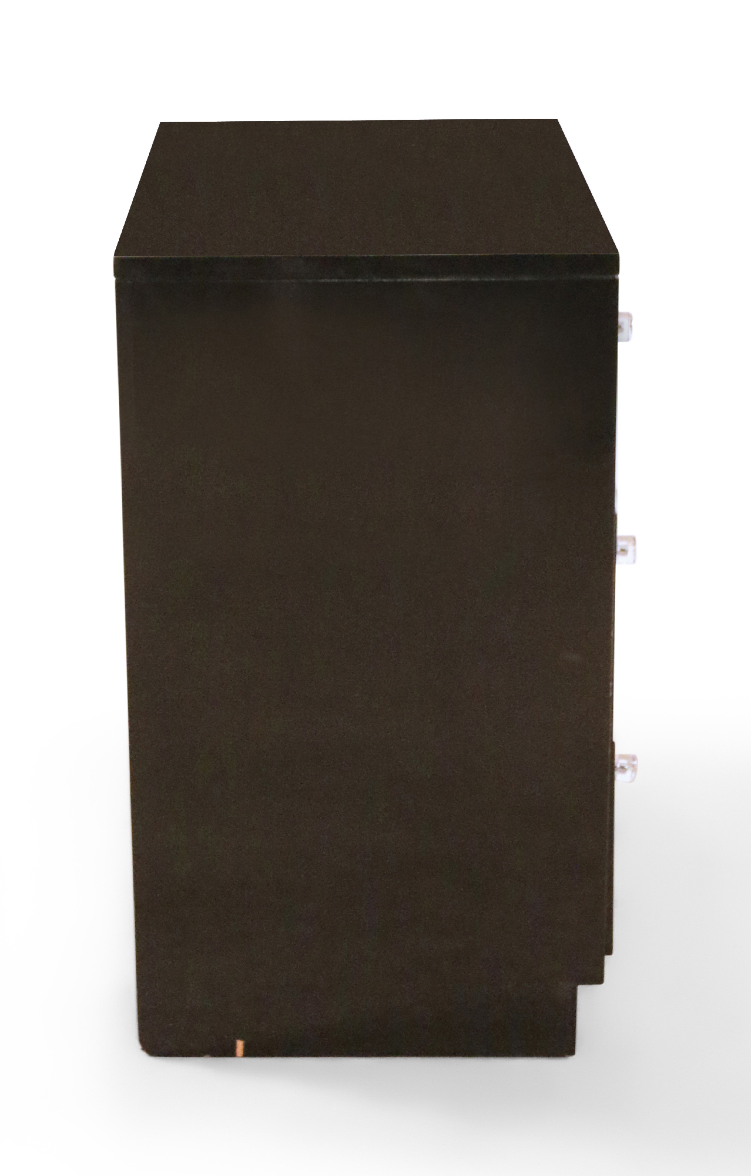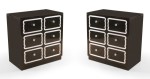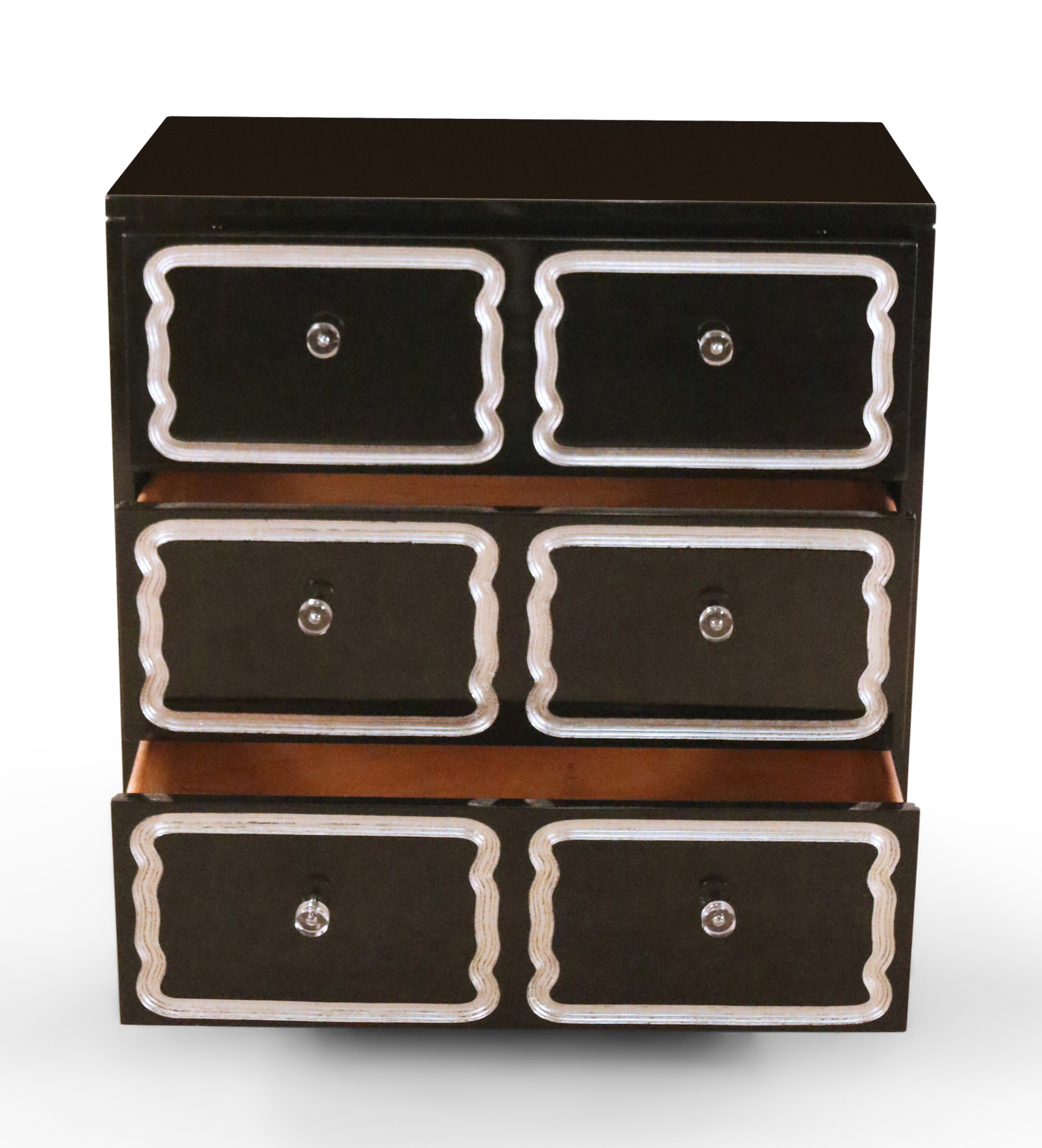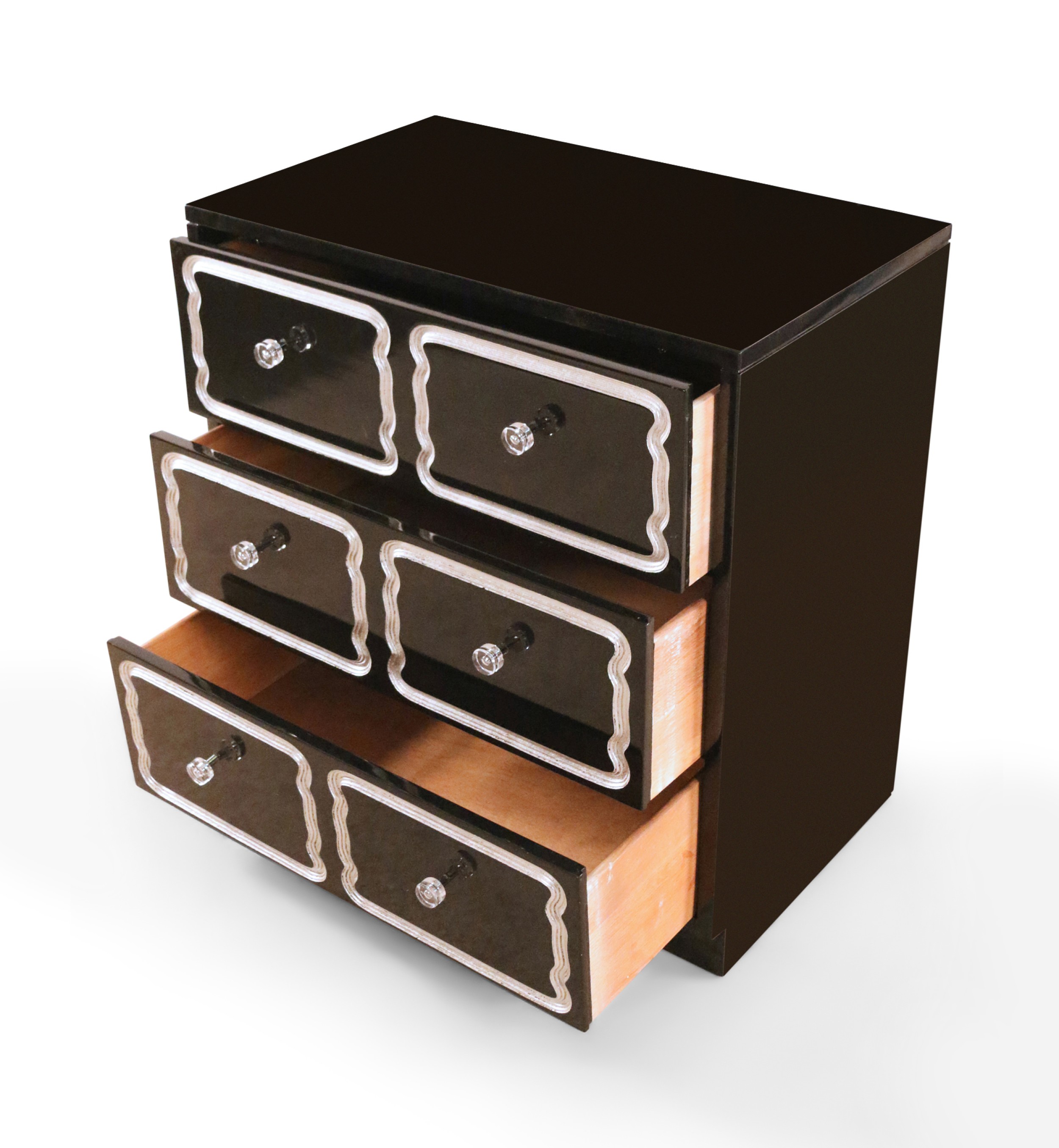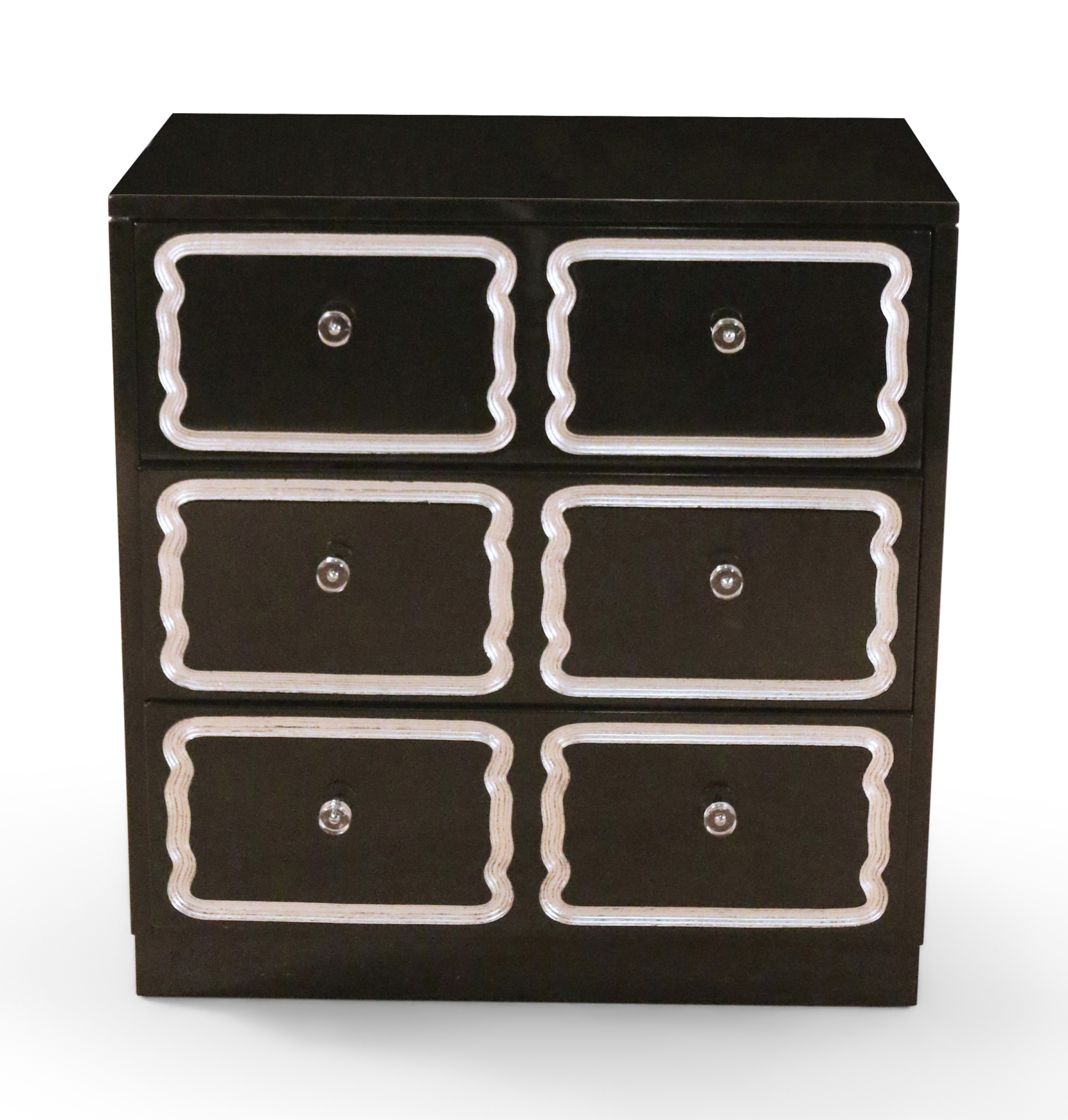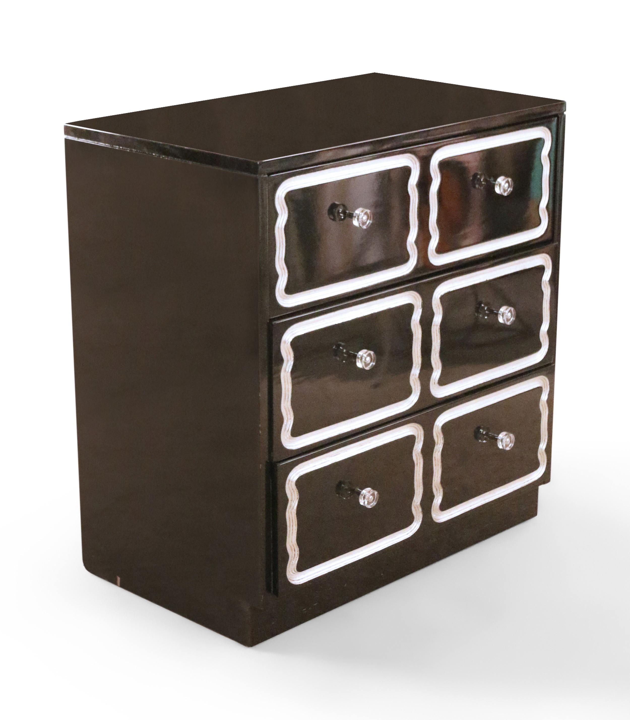 PAIR of Mid-Century chest of drawers with a black lacquer finish, raised decorative lucite drawer details, lucite drawer pulls, and black glass tops. (PRICED AS PAIR).