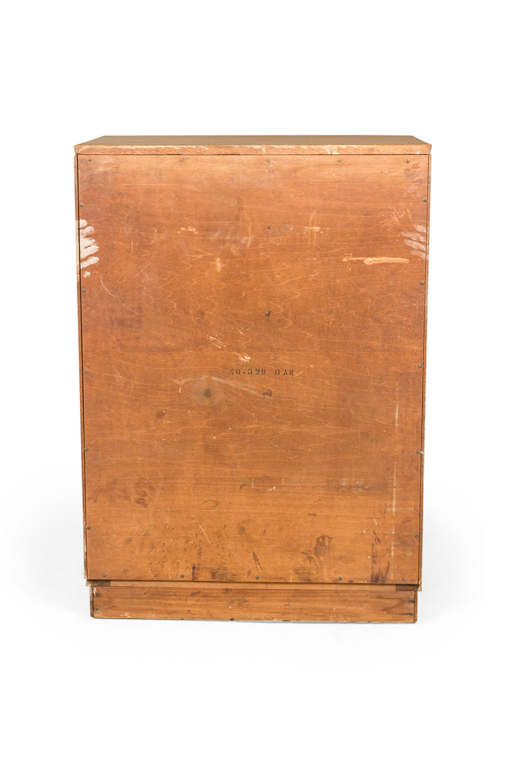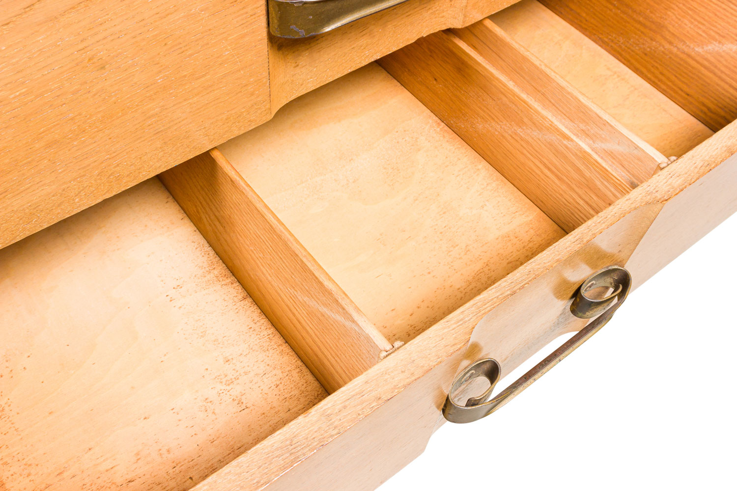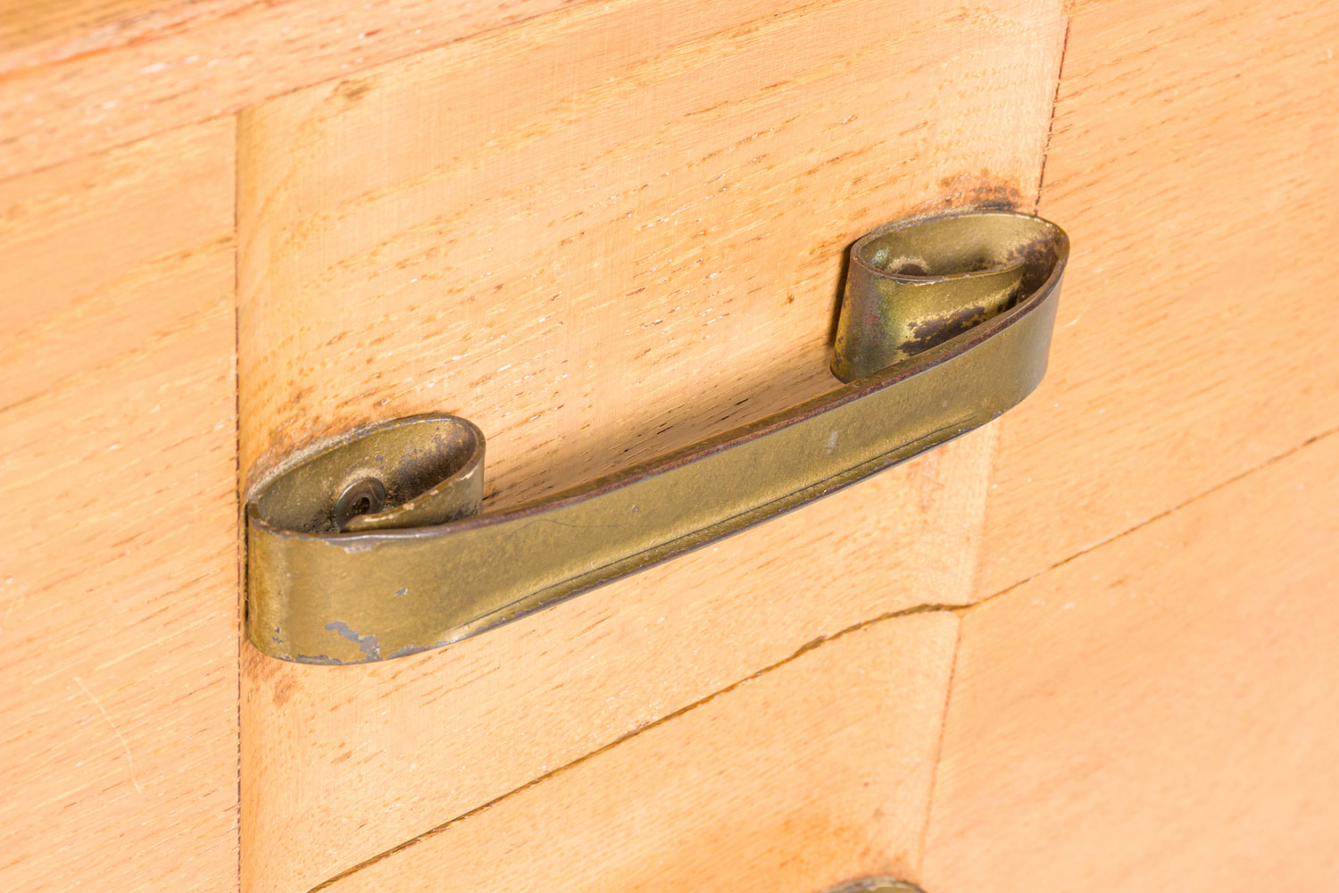 Style: Mid-Century Materials & Techniques: Brass, metal, oak, wood Category: Cabinets & Case Goods, Bedroom Good; Wear consistent with age and use