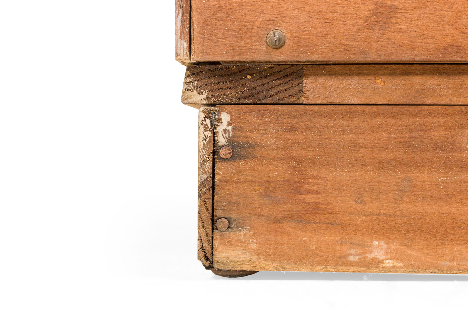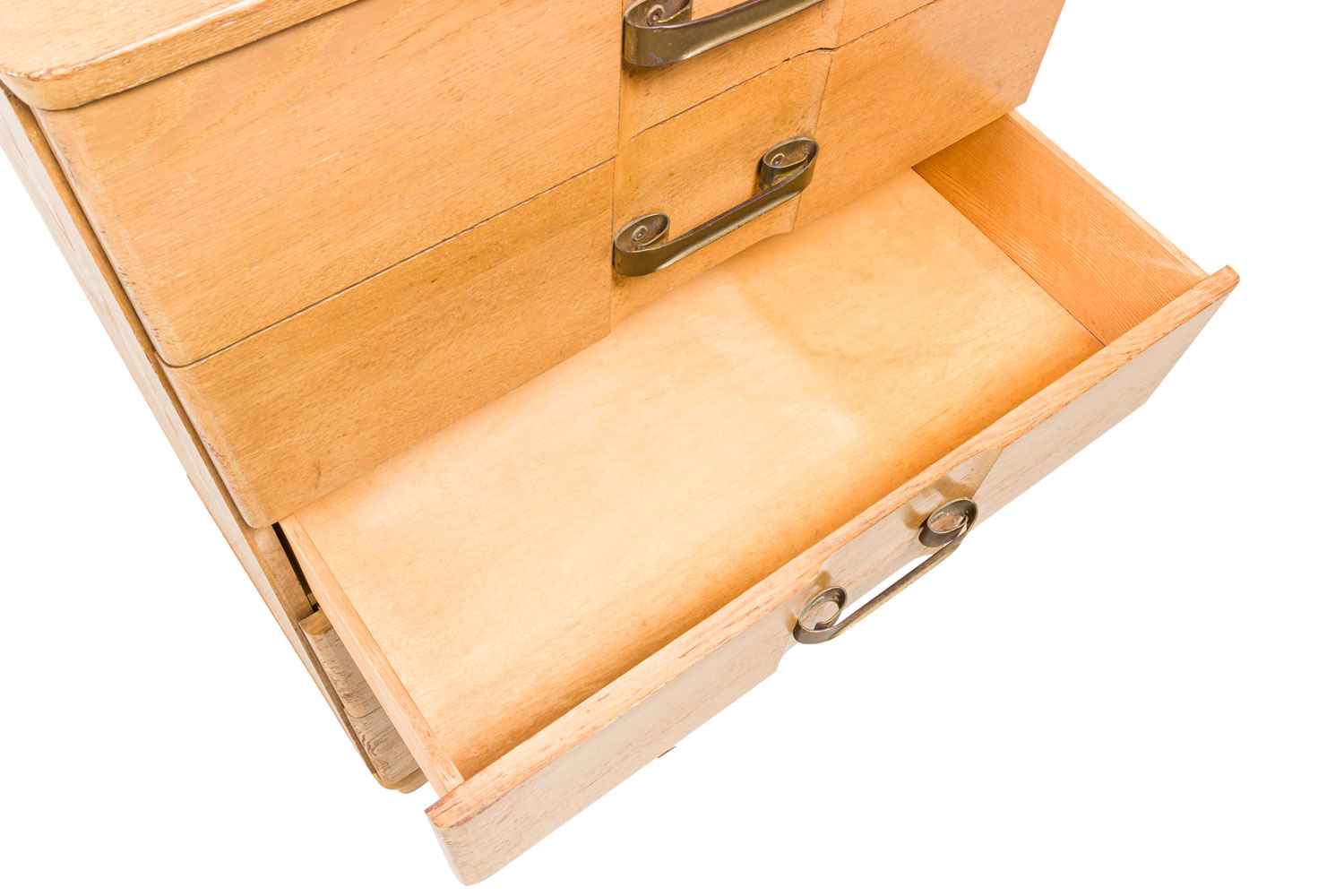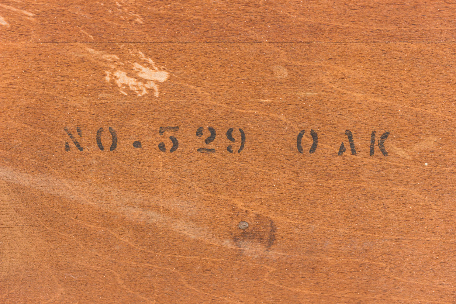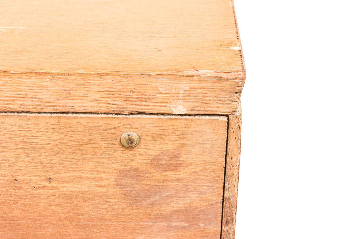 Style: Mid-Century Materials & Techniques: Brass, metal, oak, wood Category: Cabinets & Case Goods, Bedroom Good; Wear consistent with age and use