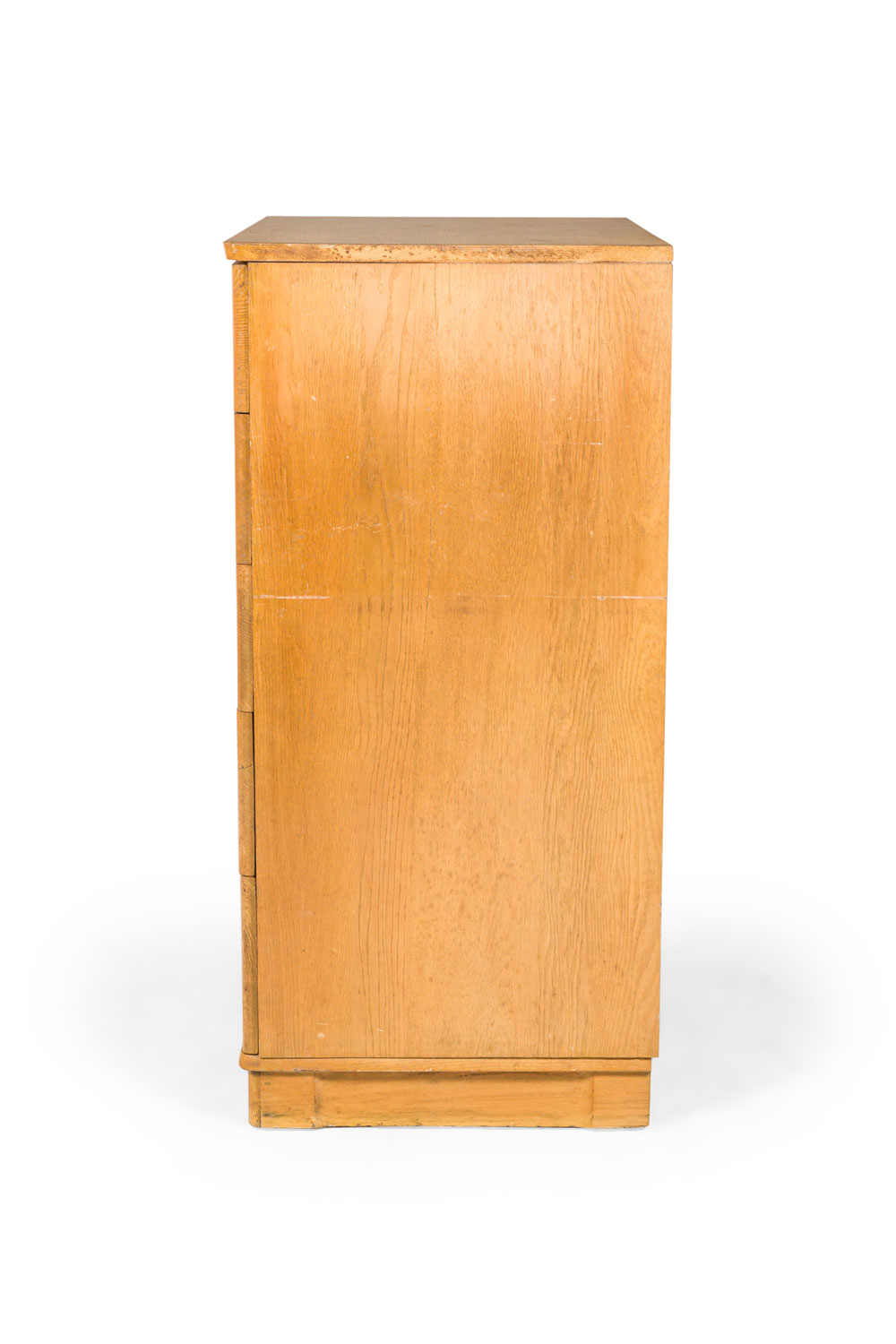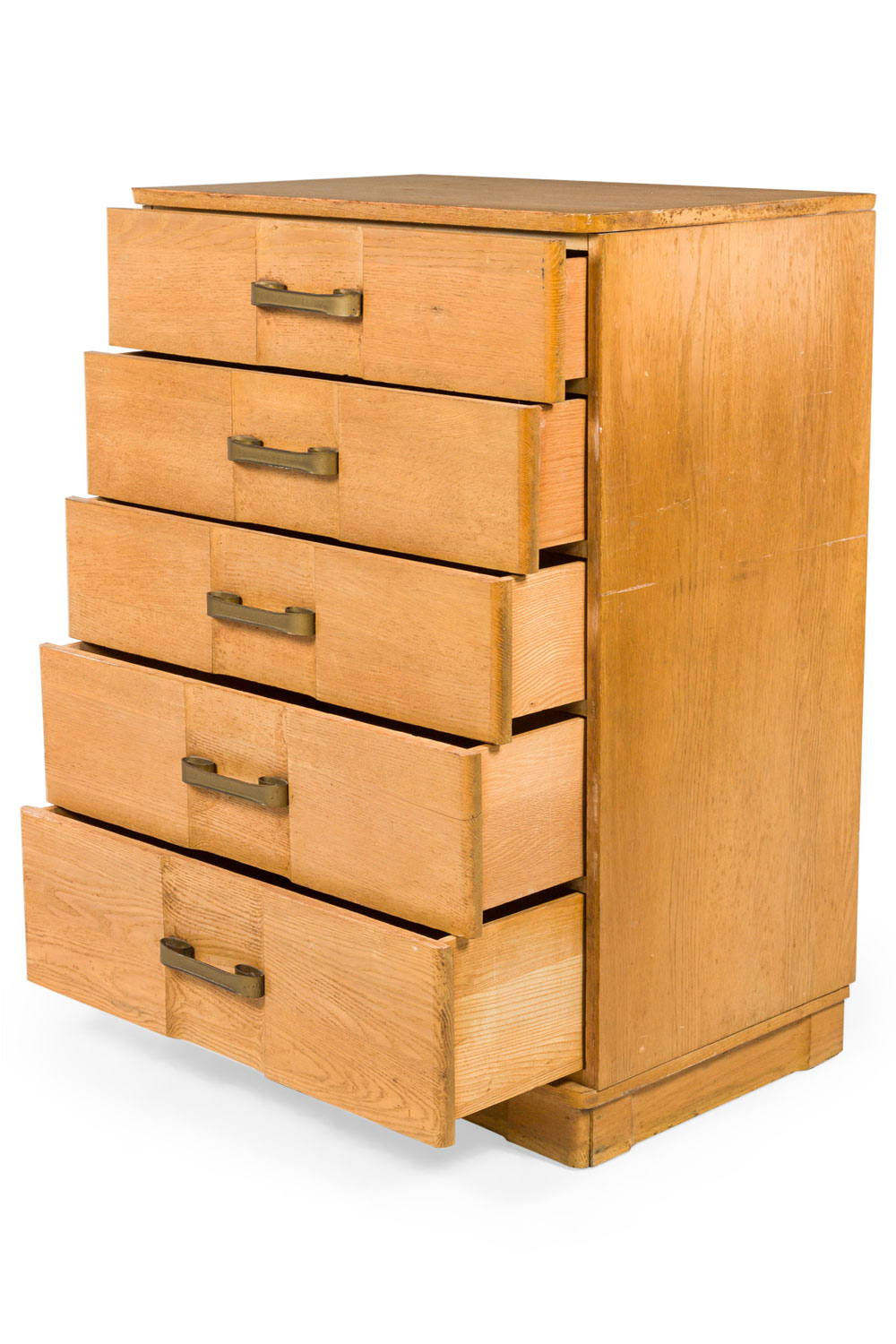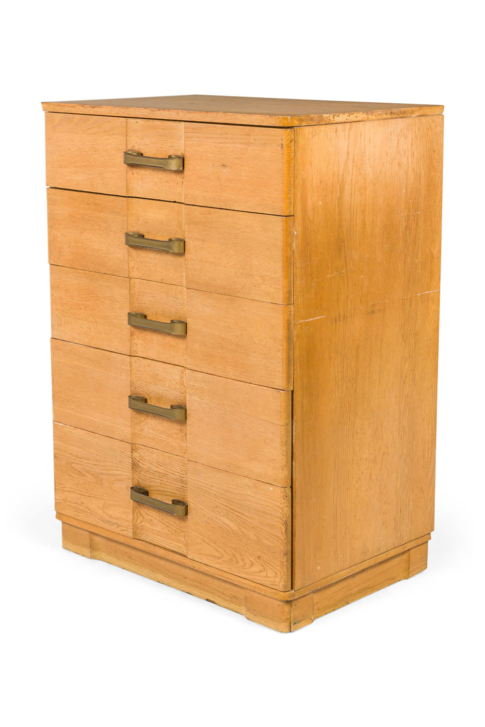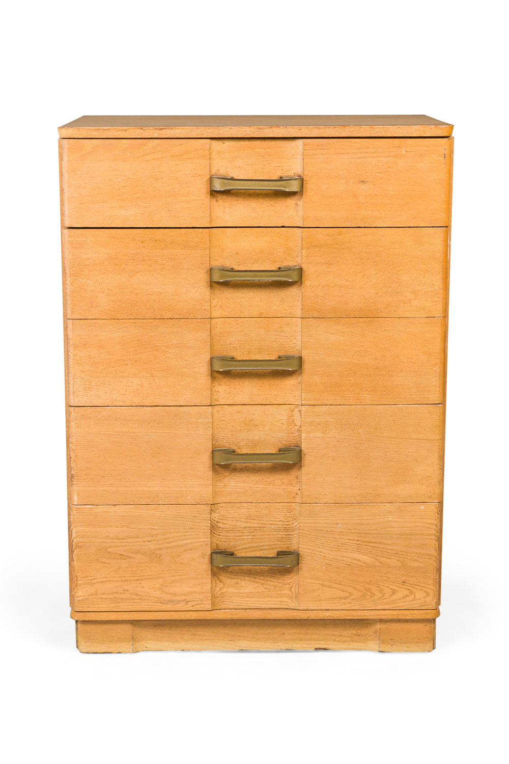 PAIR of Mid-Century white oak Morgan chests with five drawers mounted with scroll design brass drawer pulls. (PRICED AS PAIR)
