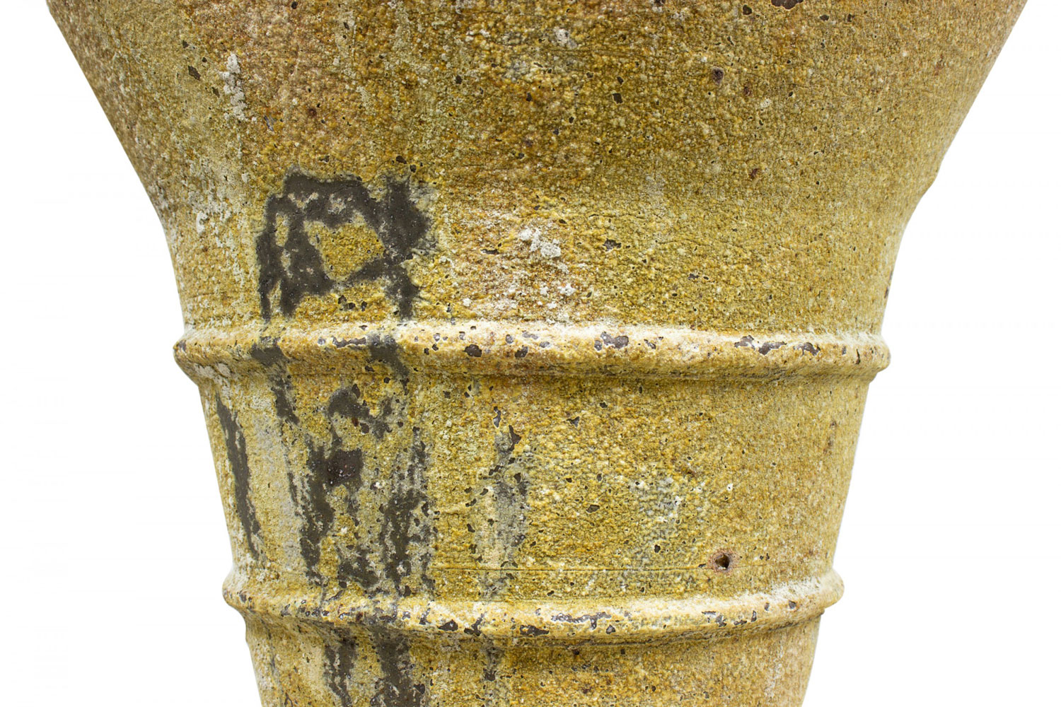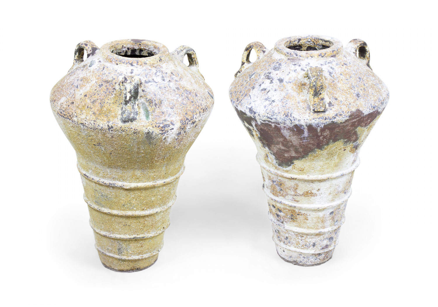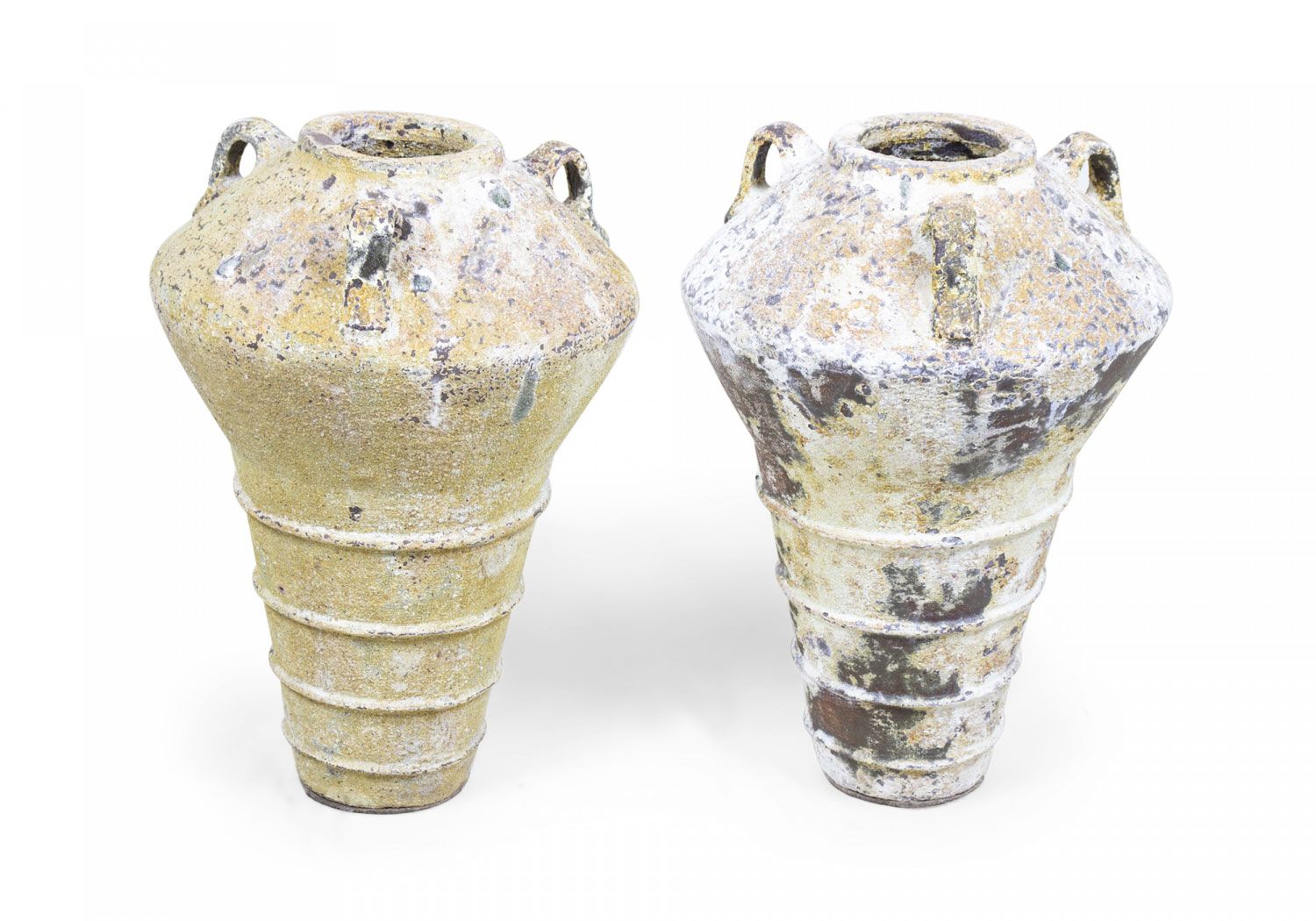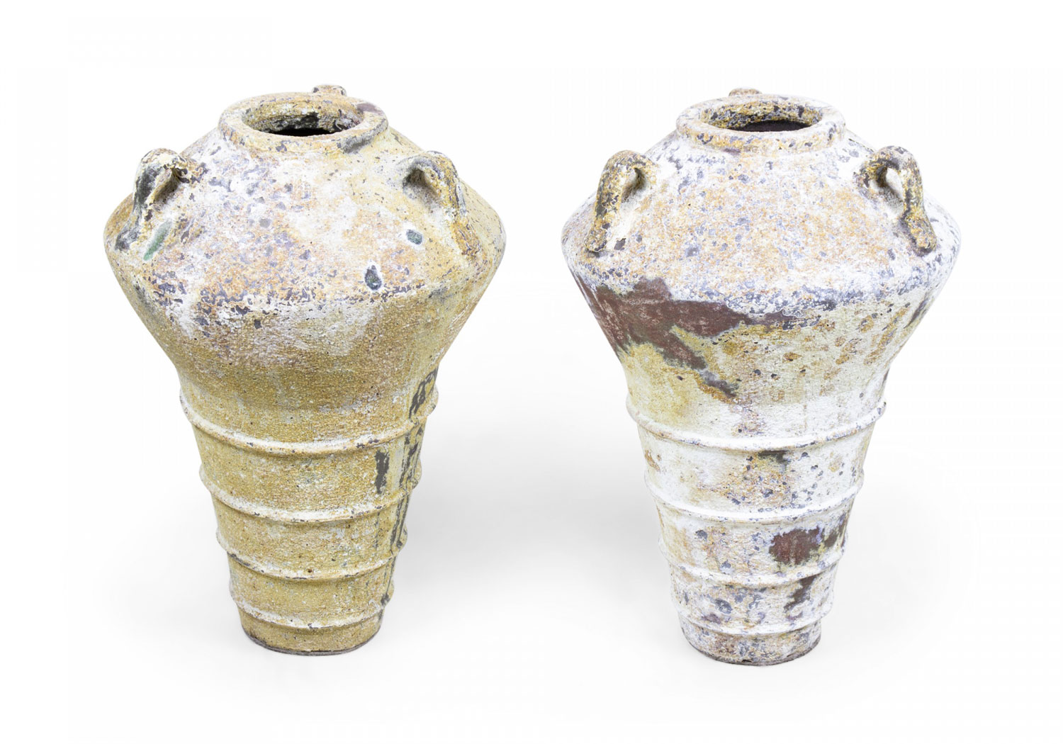 PAIR of Contemporary outdoor cast iron floor urns with tapered bodies, three small handles around the fluted mouths, and three decorative ridges, covered in a natural beige and brown patina. (PRICED AS PAIR)