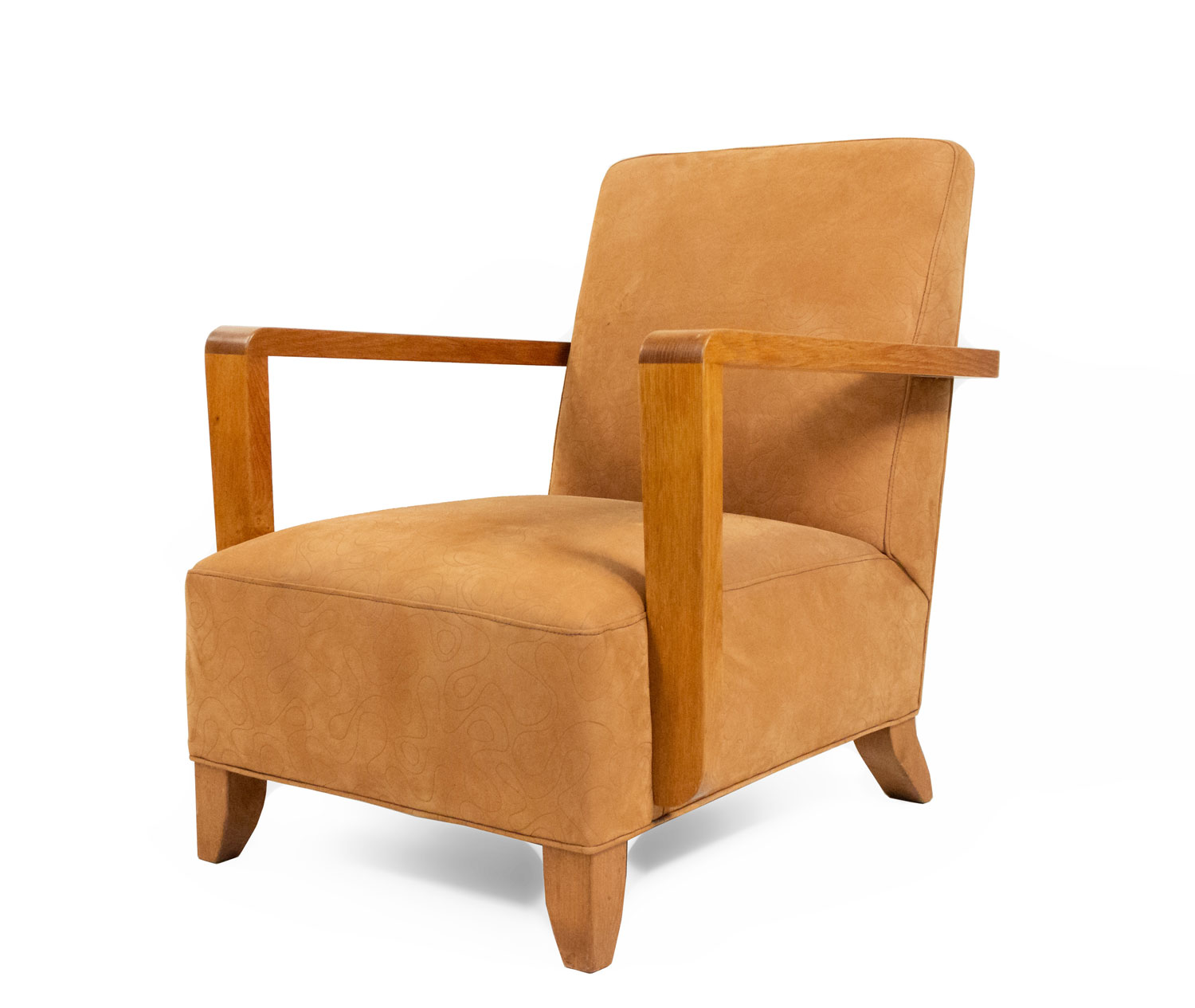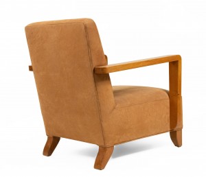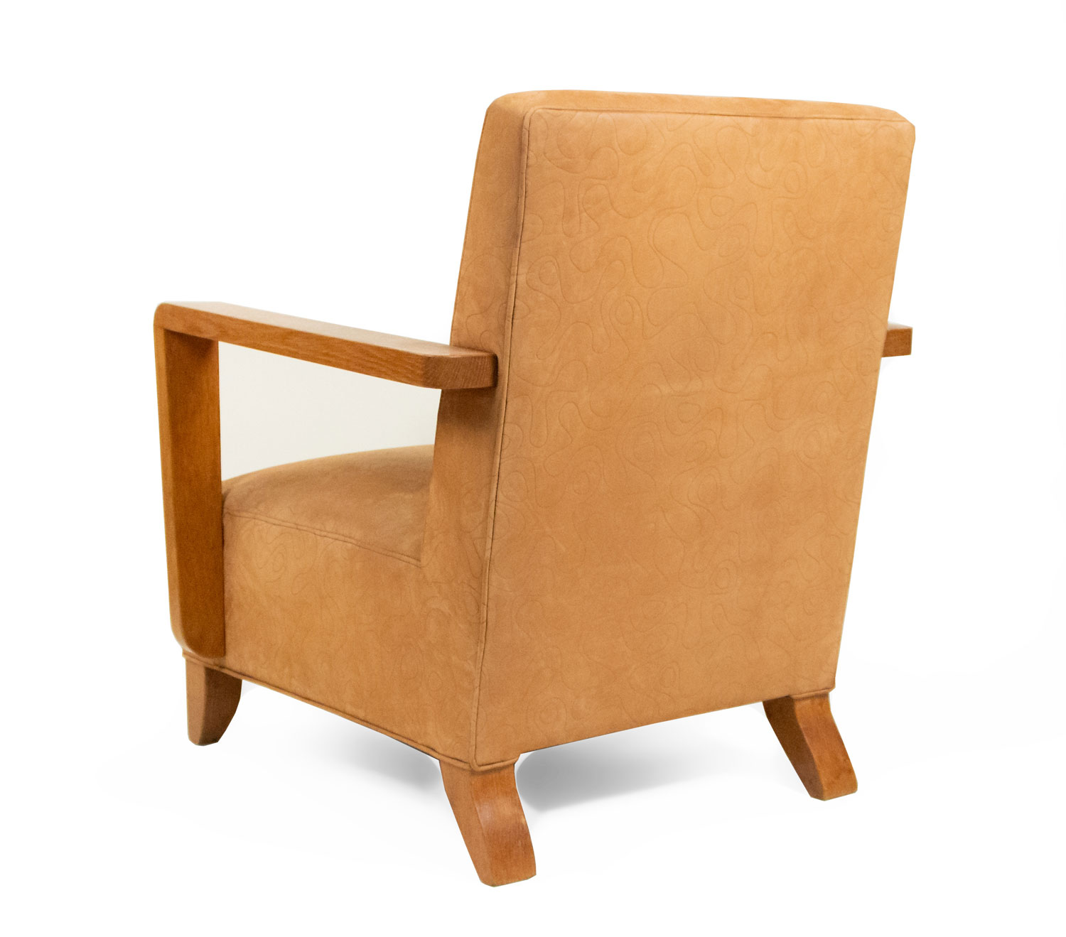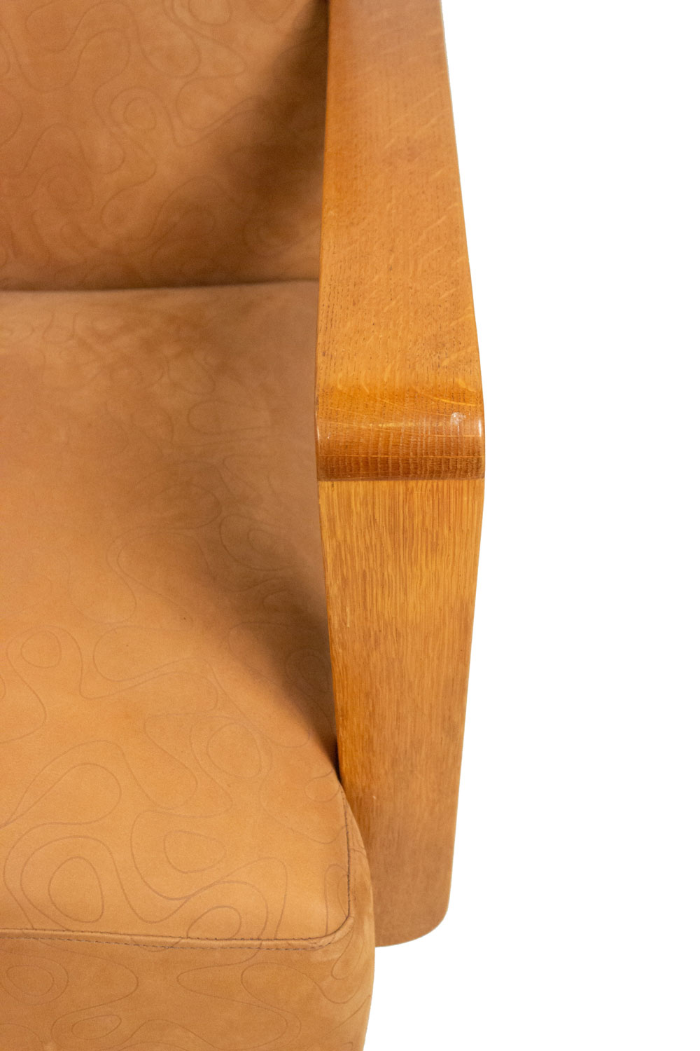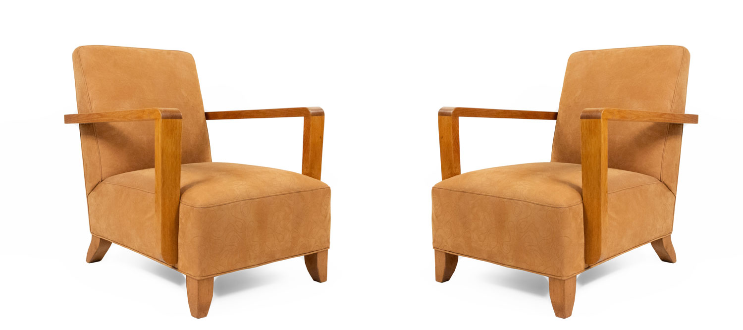 PAIR of French Modernist geometric form (1940's) oak open Armchairs with a seat & back upholstered in beige suede with an impressed squiggle pattern.