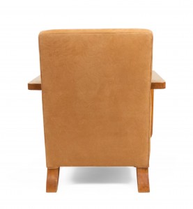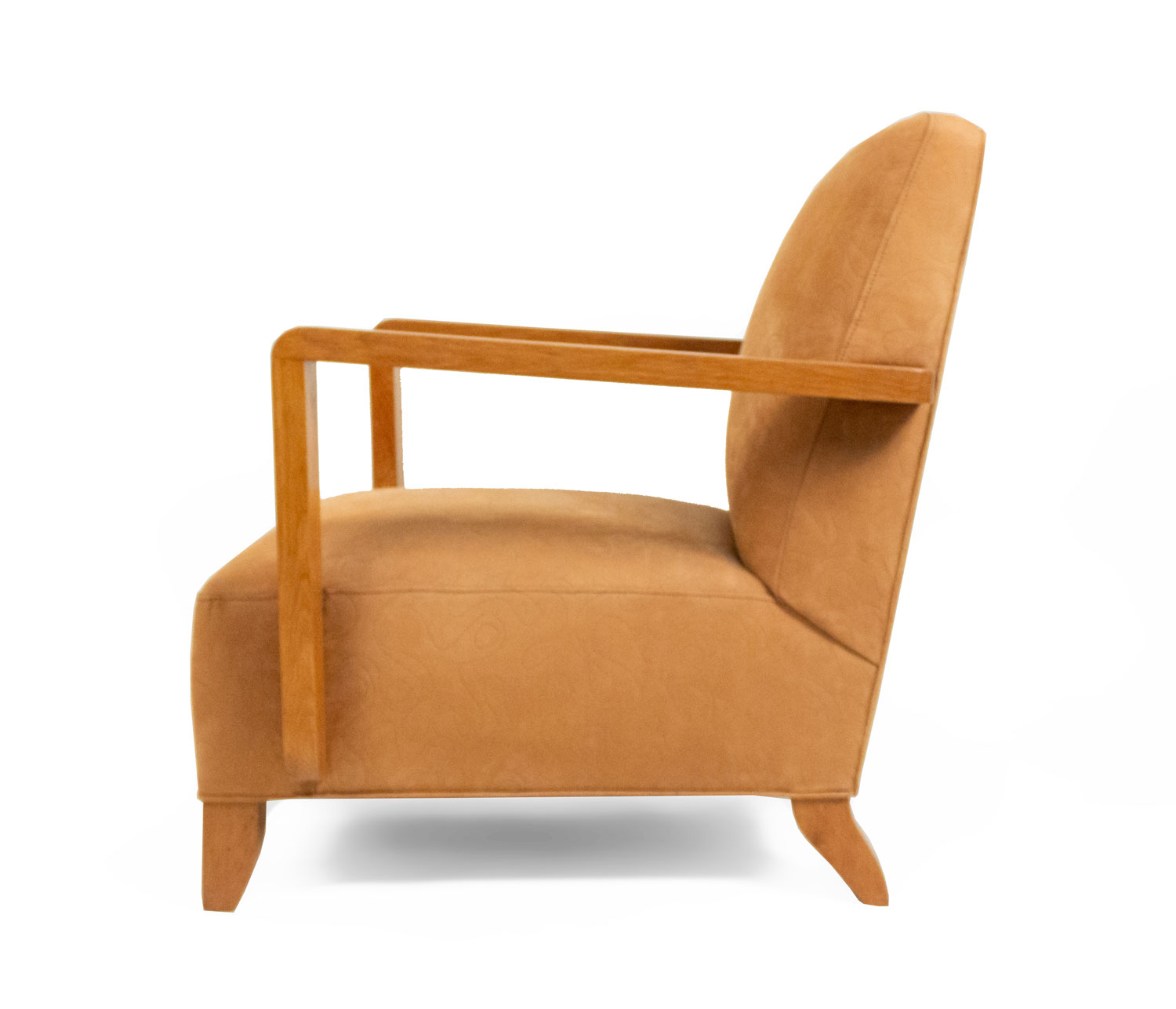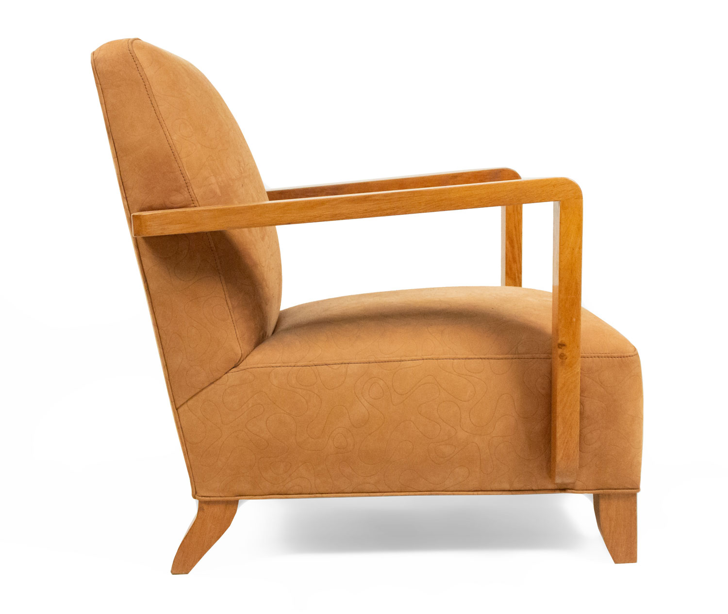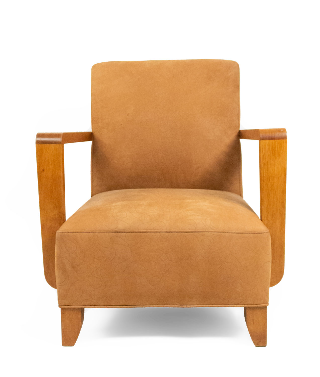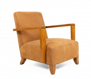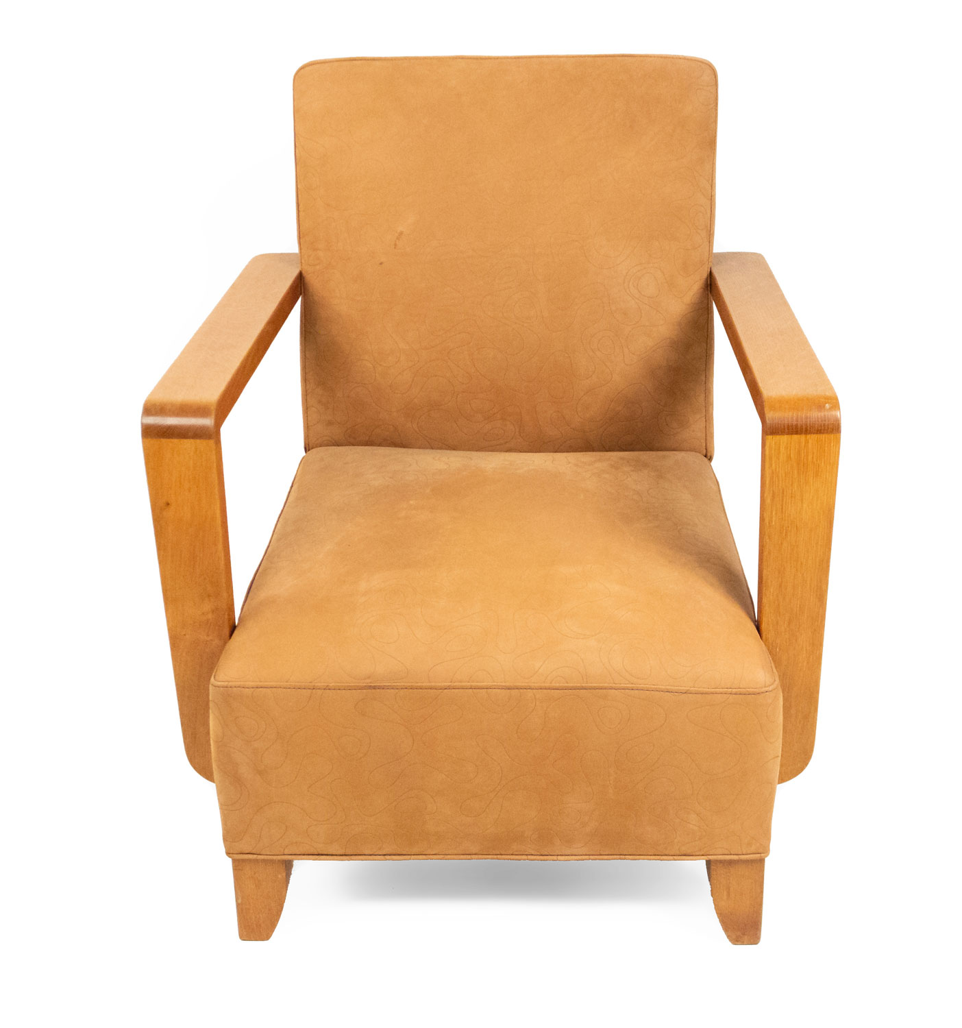 PAIR of French Modernist geometric form (1940's) oak open Armchairs with a seat & back upholstered in beige suede with an impressed squiggle pattern.