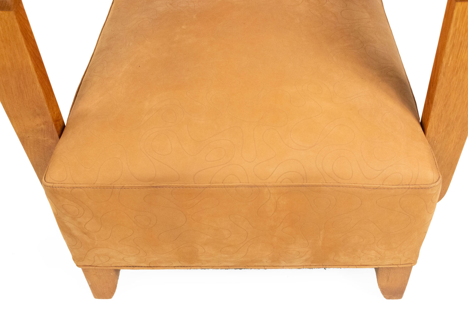 PAIR of French Modernist geometric form (1940's) oak open Armchairs with a seat & back upholstered in beige suede with an impressed squiggle pattern..