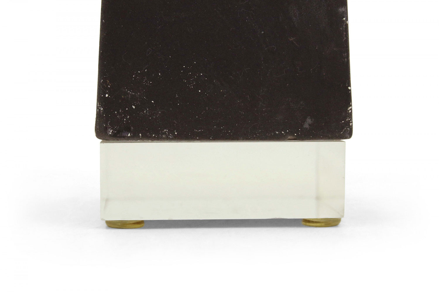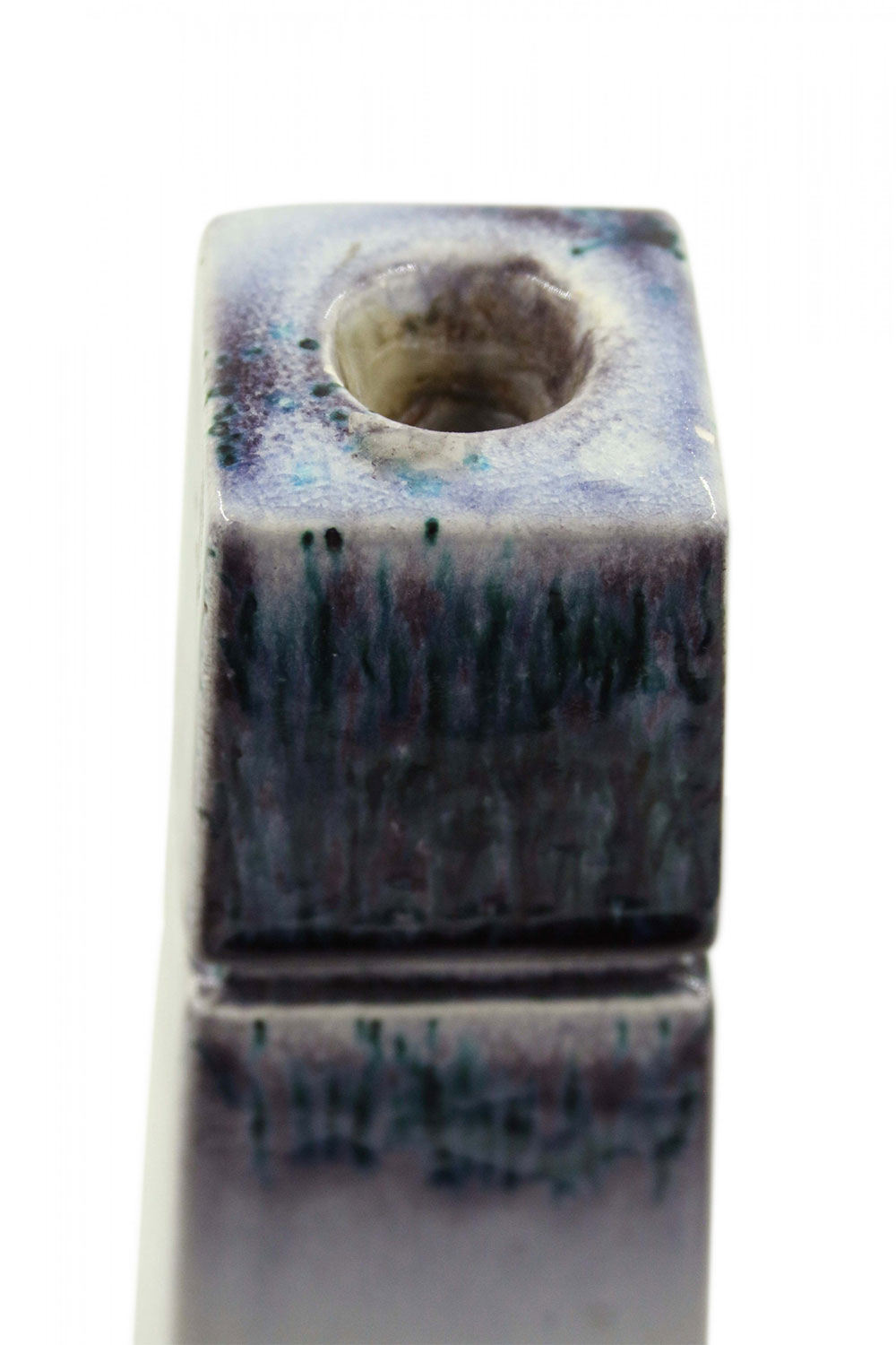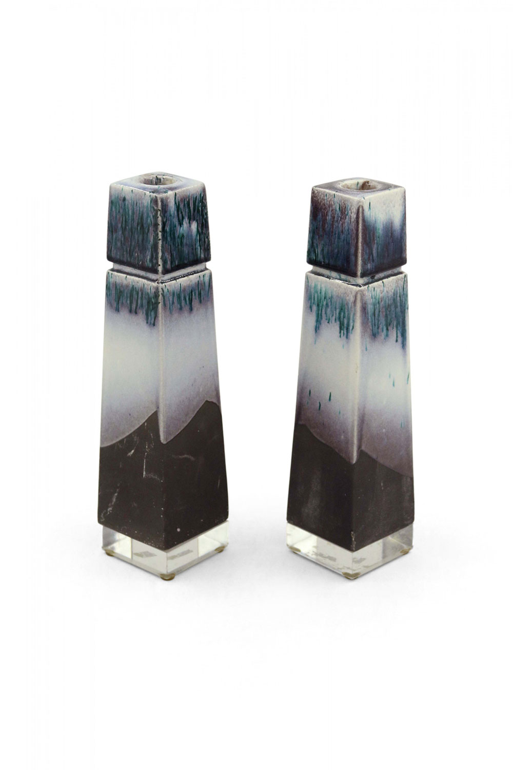 Pair of Tapered Square White, Green, and Purple Variegated Ceramic and Lucite Candle Holders