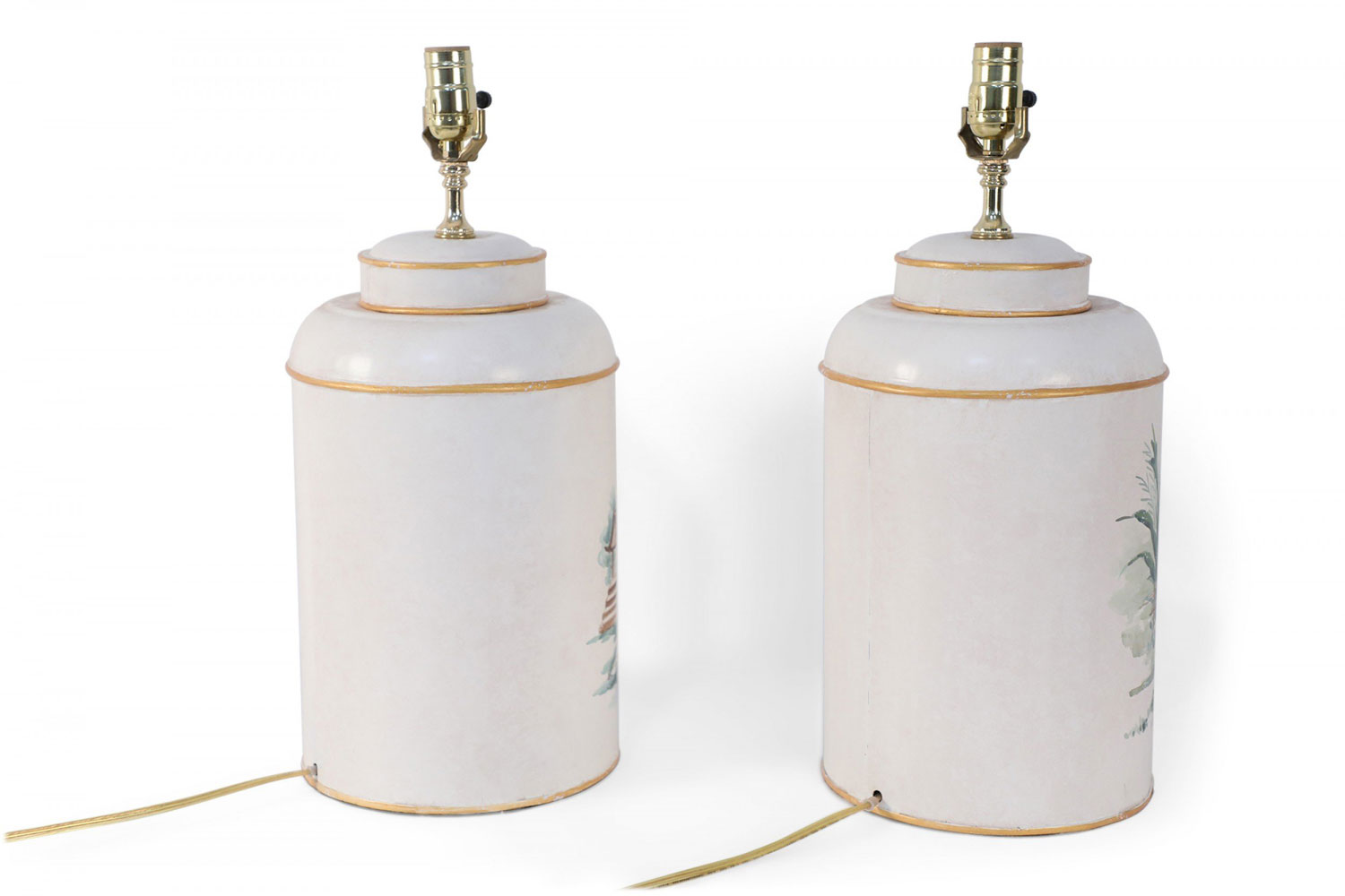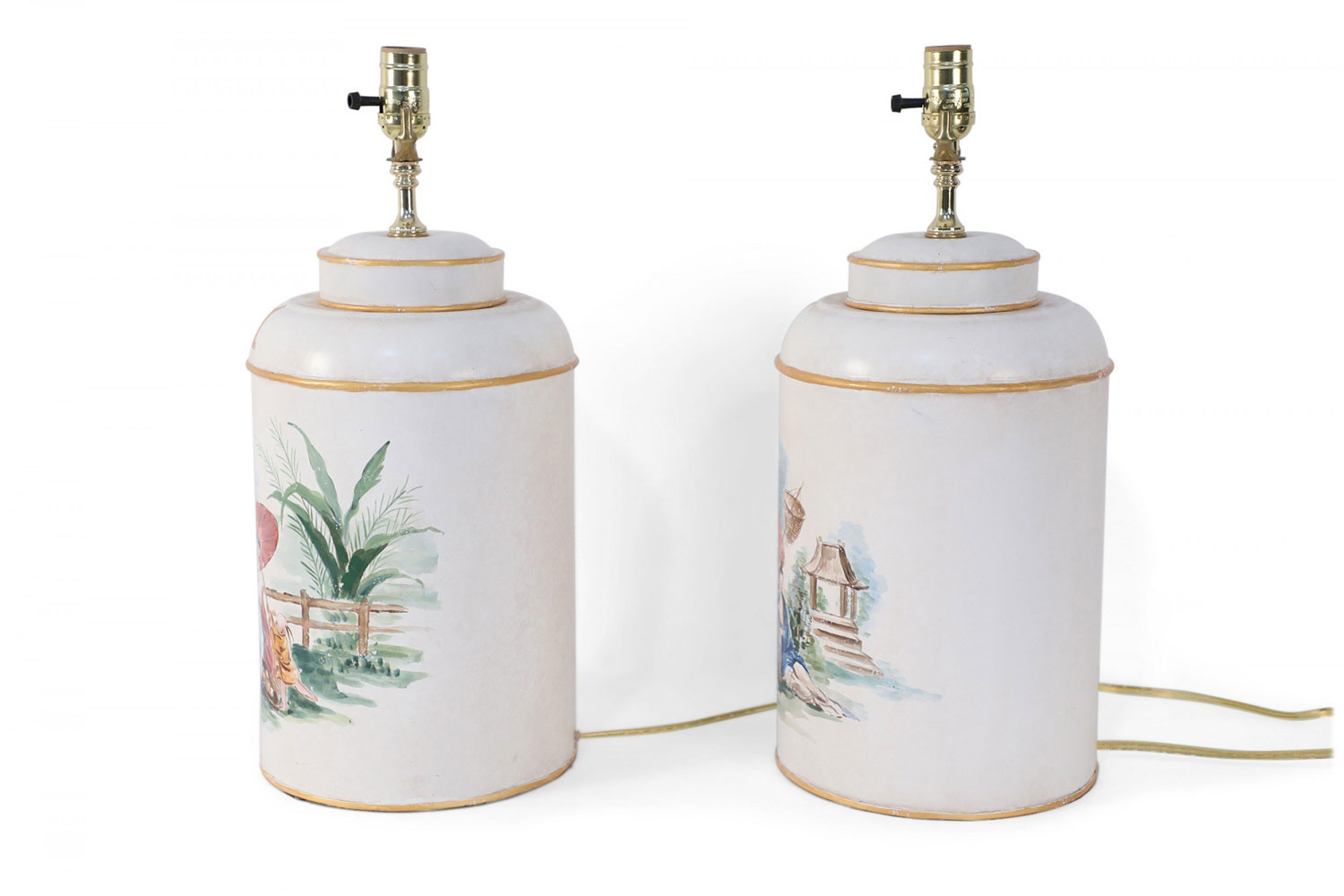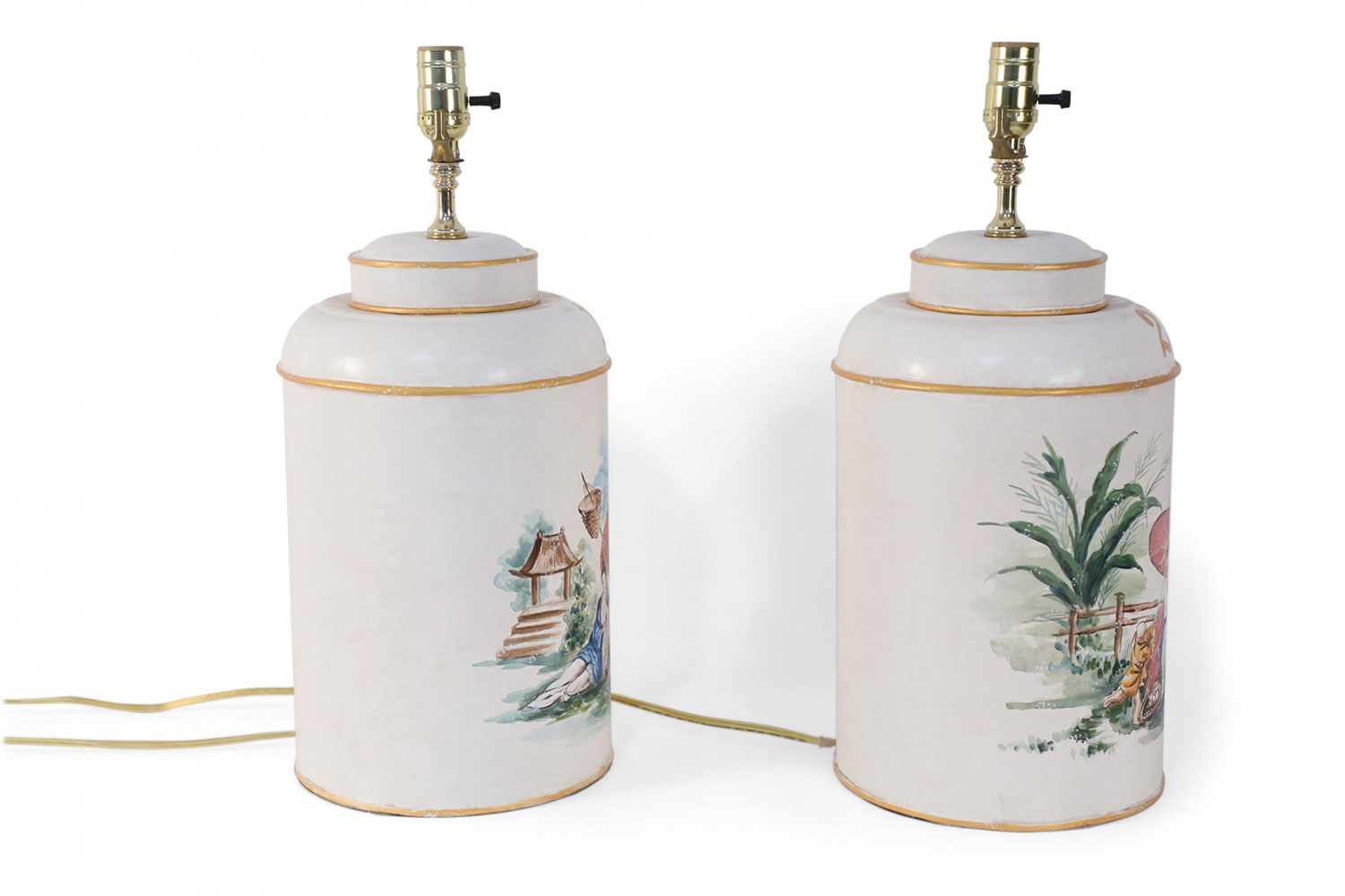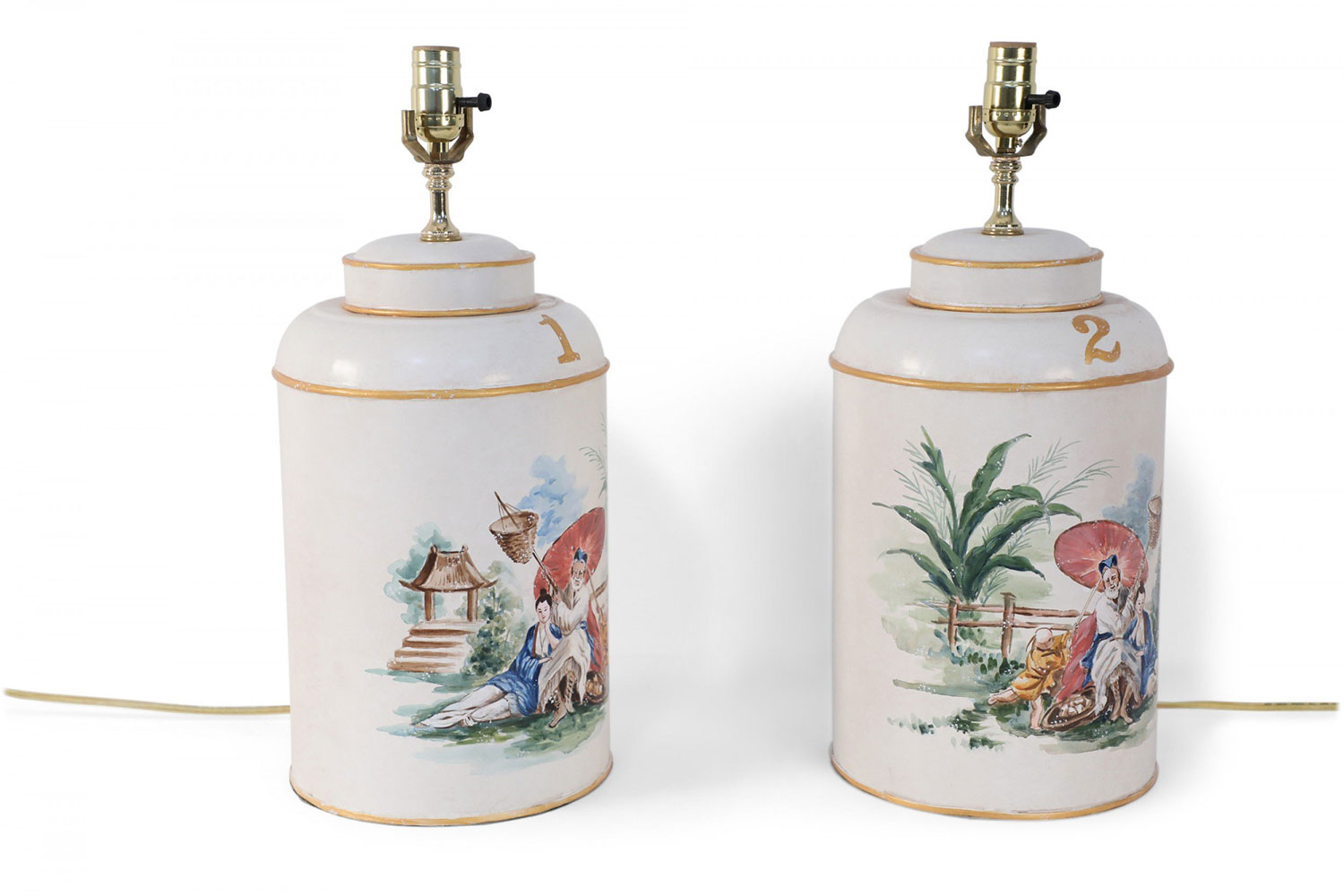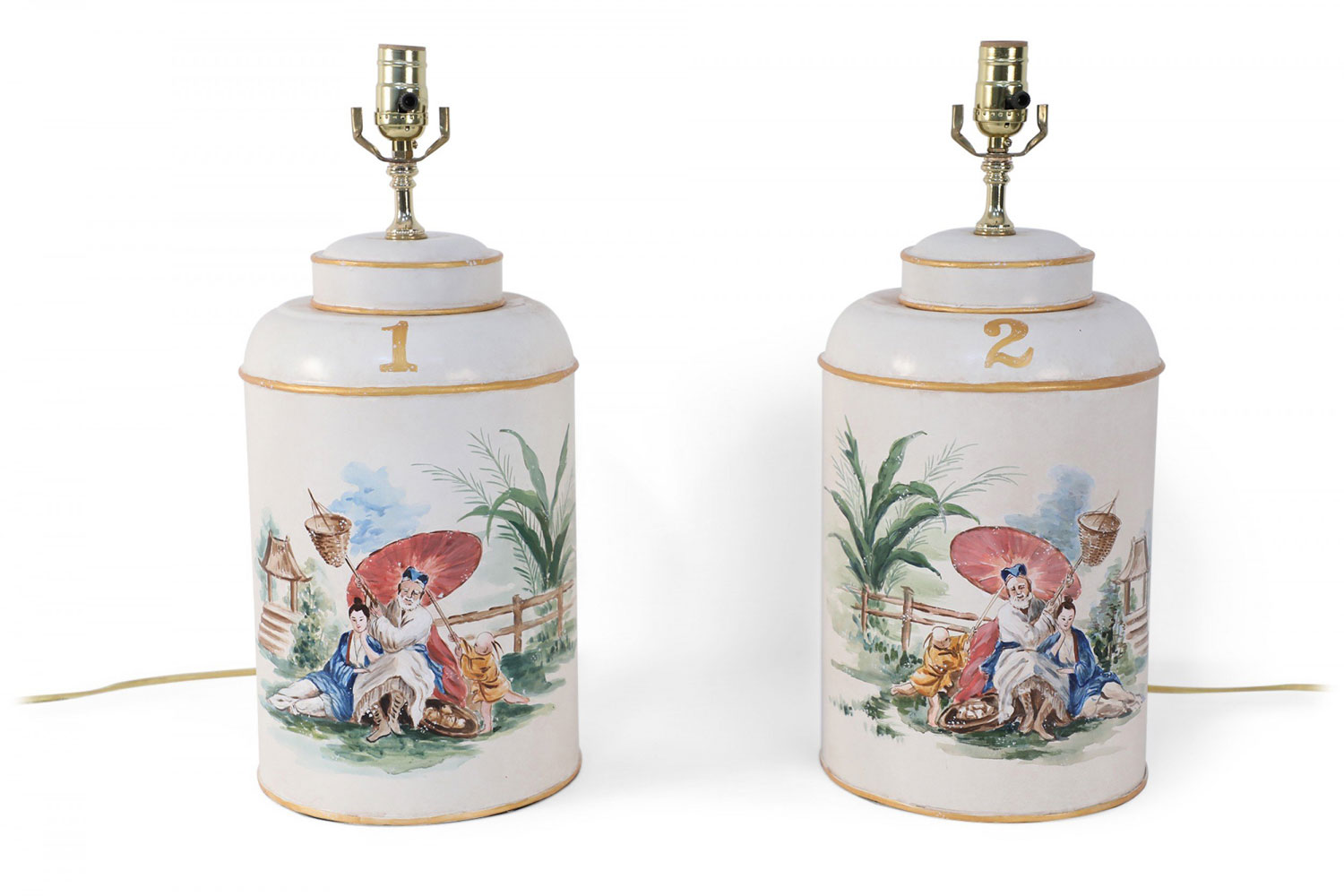 PAIR of Vintage Chinese tole table lamps with a hand painted outdoor scene of a figure sitting under a parasol in a garden against an off-white background with gold painted numbers. (PRICED AS PAIR)