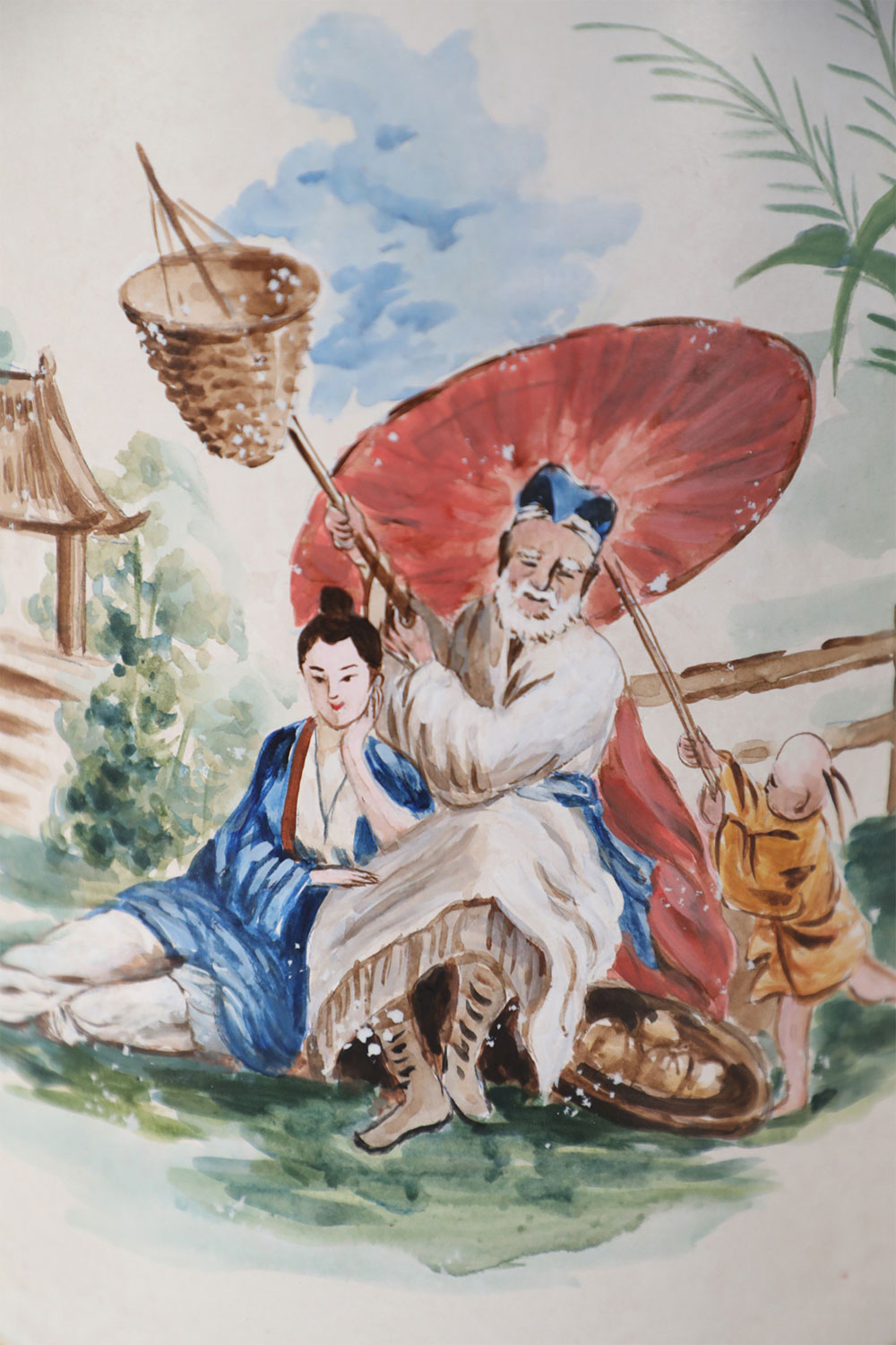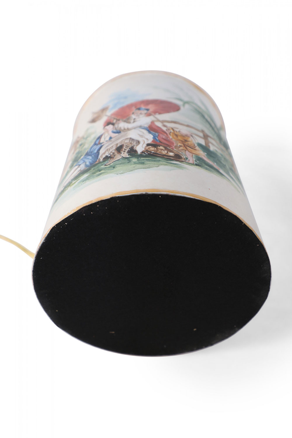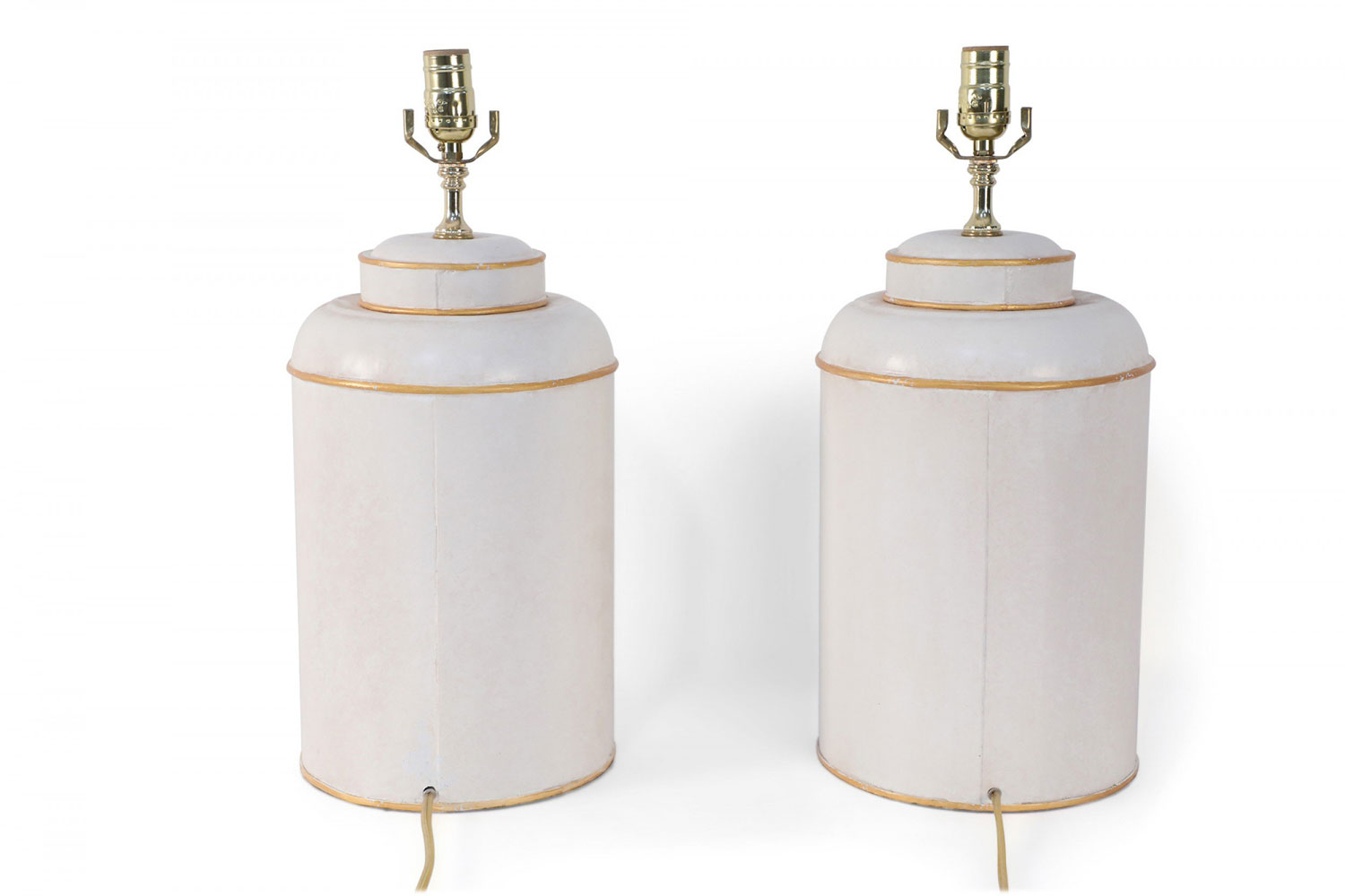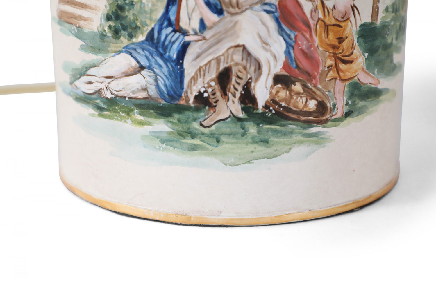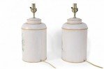 PAIR of Vintage Chinese tole table lamps with a hand painted outdoor scene of a figure sitting under a parasol in a garden against an off-white background with gold painted numbers. (PRICED AS PAIR)