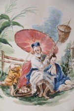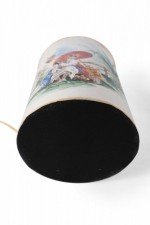 PAIR of Vintage Chinese tole table lamps with a hand painted outdoor scene of a figure sitting under a parasol in a garden against an off-white background with gold painted numbers. (PRICED AS PAIR).