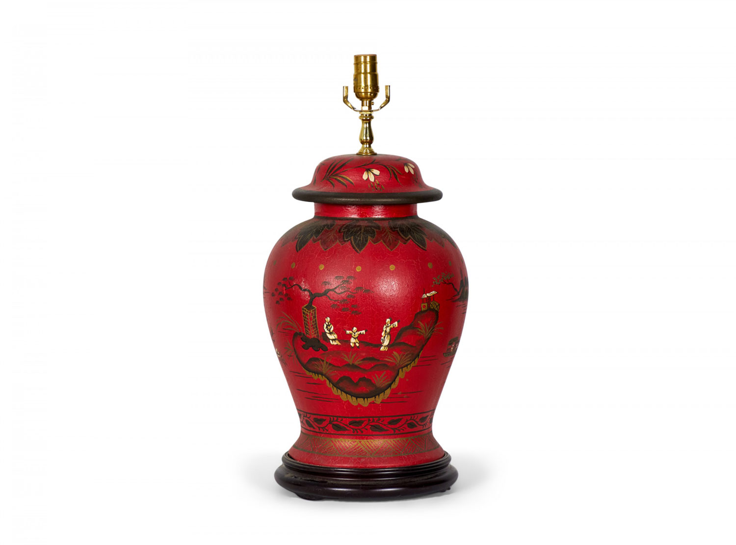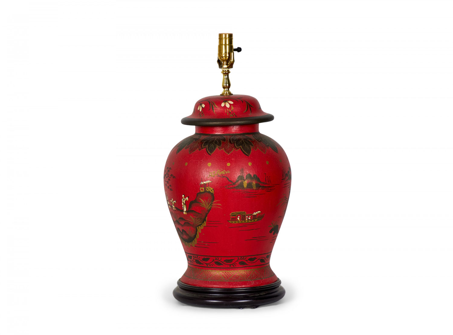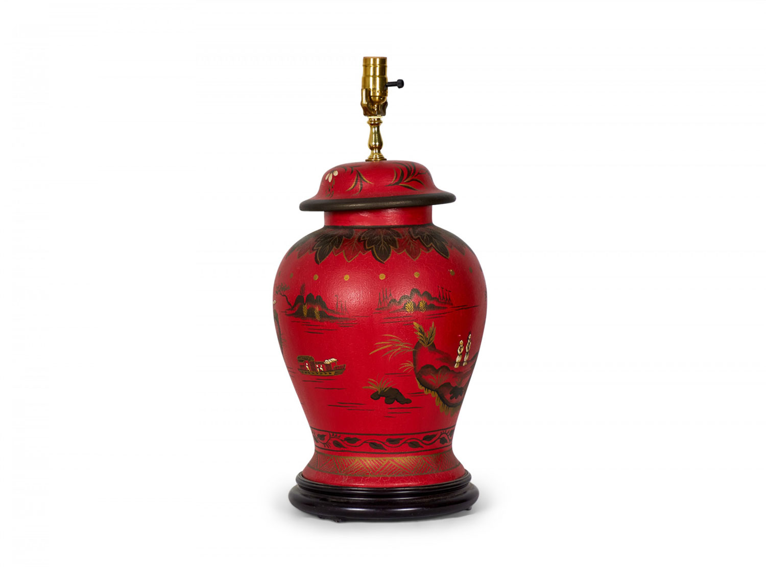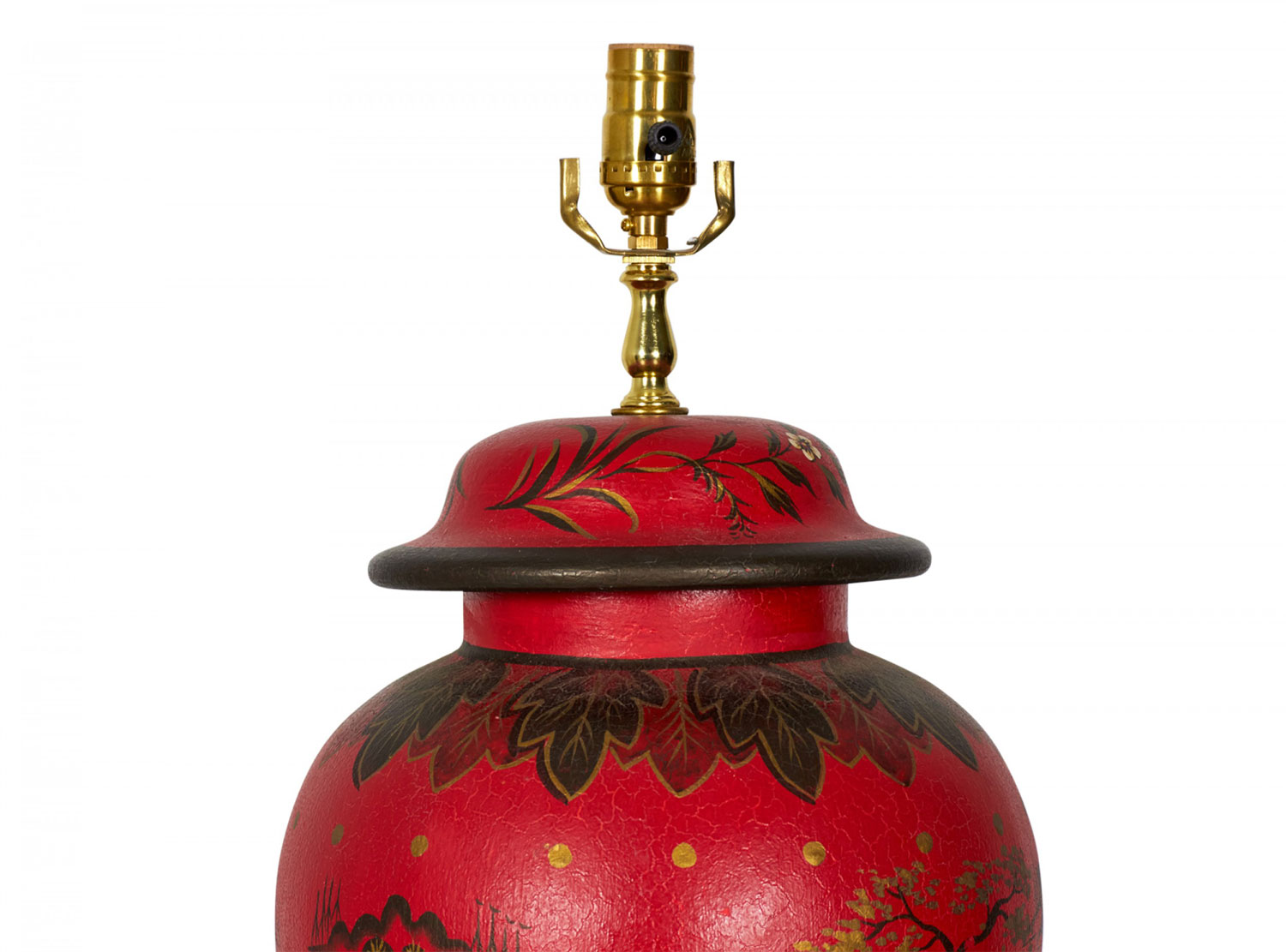 Pair of Vintage Chinese Red and Gold Hand-Painted Tole Ginger Jar Table Lamps