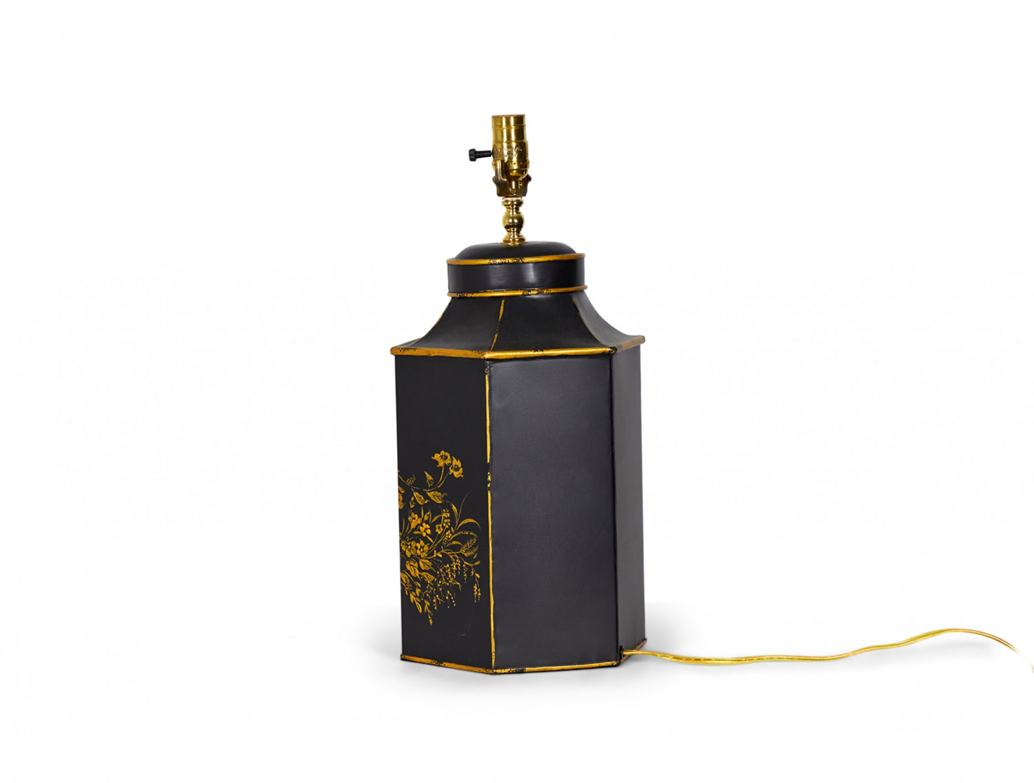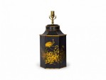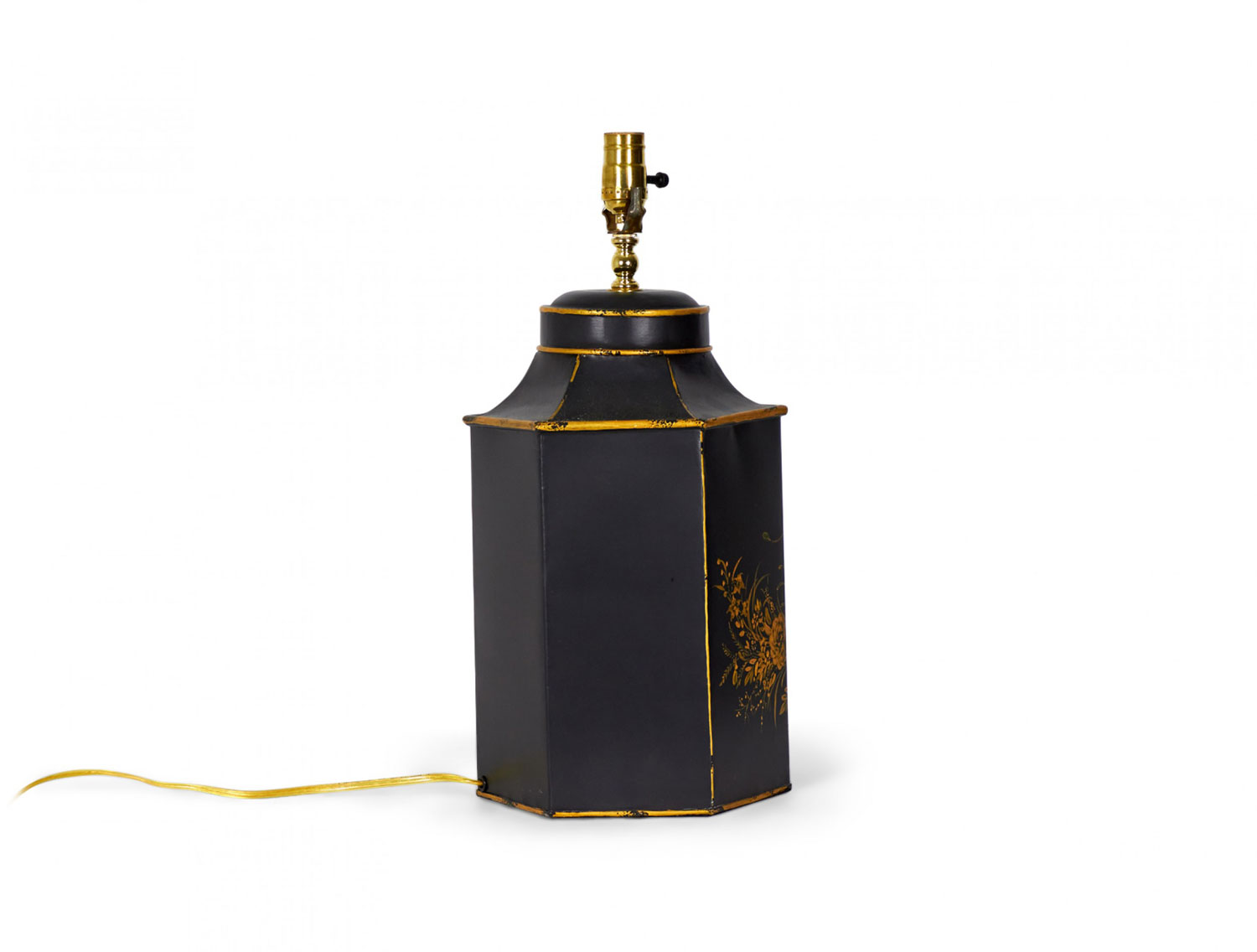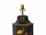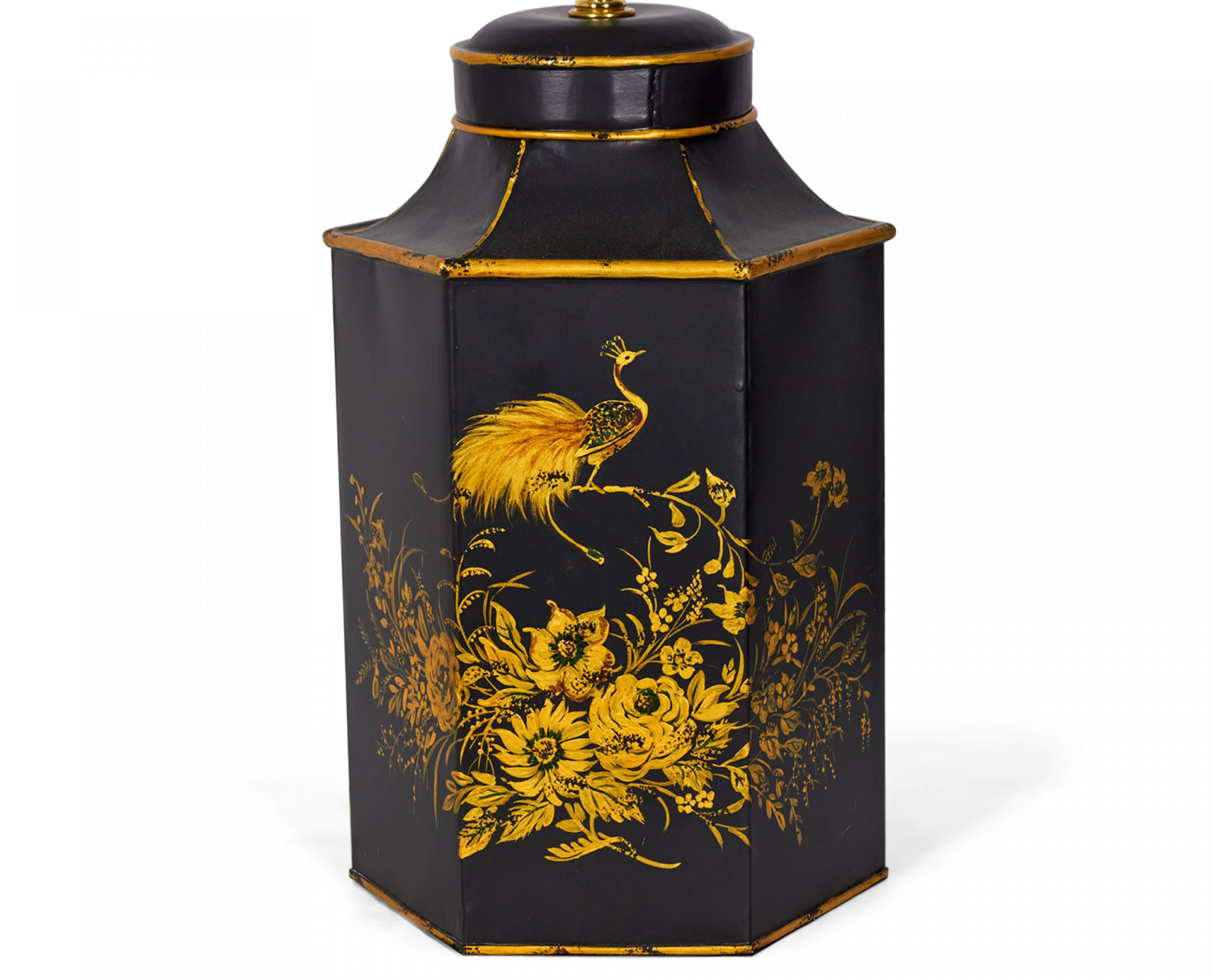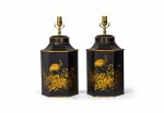 PAIR of English export Chinoiserie-style table lamps made of hexagonal tole tea caddies mounted as lamps with brass hardware, hand painted with gold garden scenes featuring flowers and birds against a black background. (PRICED AS PAIR)