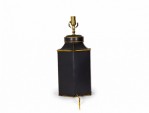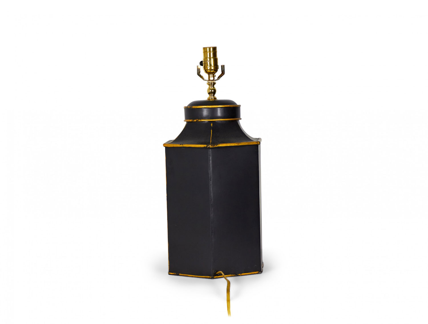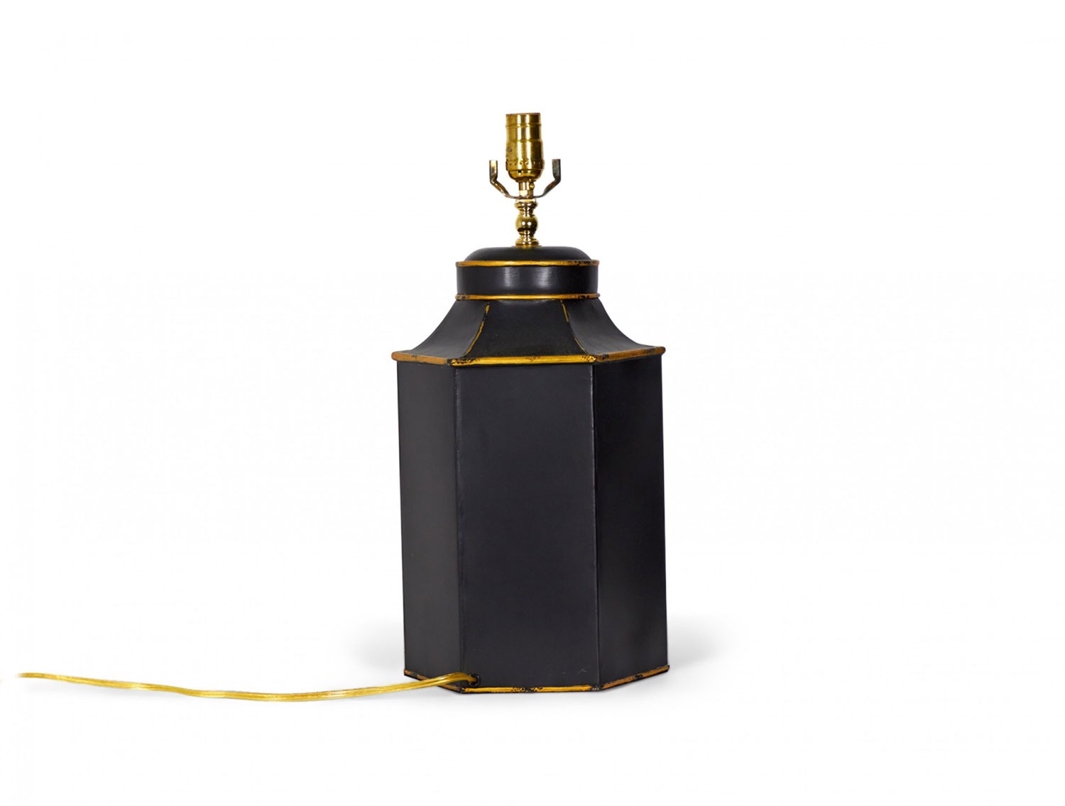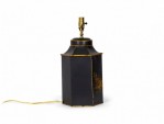 Pair of Vintage English Chinoiserie Black and Gold Hexagonal Hand-Painted Tole Tea Caddy Table Lamps