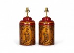PAIR of English export Chinoiserie-style table lamps made of tole tea caddies mounted as lamps with brass hardware, hand painted with gold and black portraiture designs framed by floral swirls and characters against a red background. (PRICED AS PAIR).