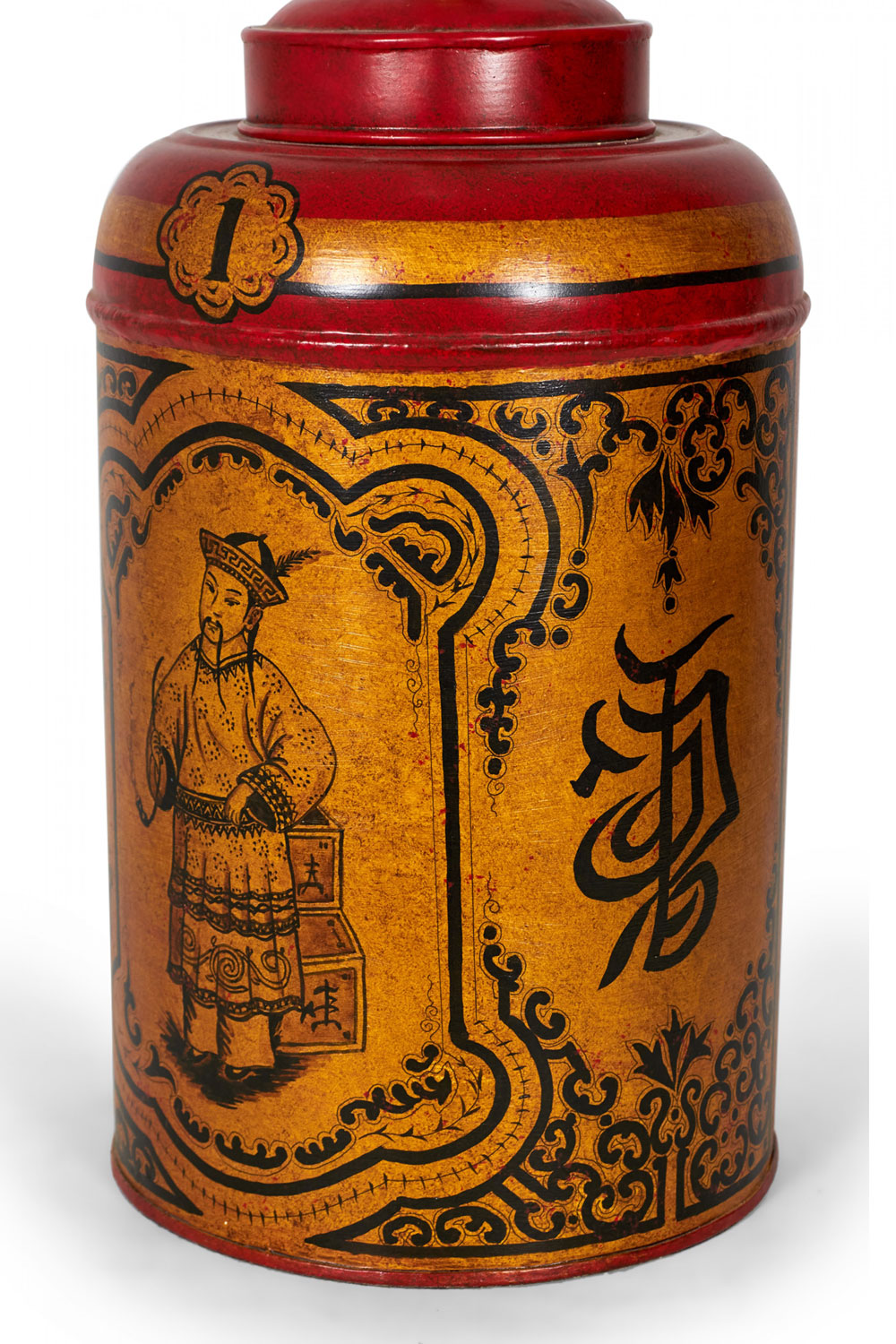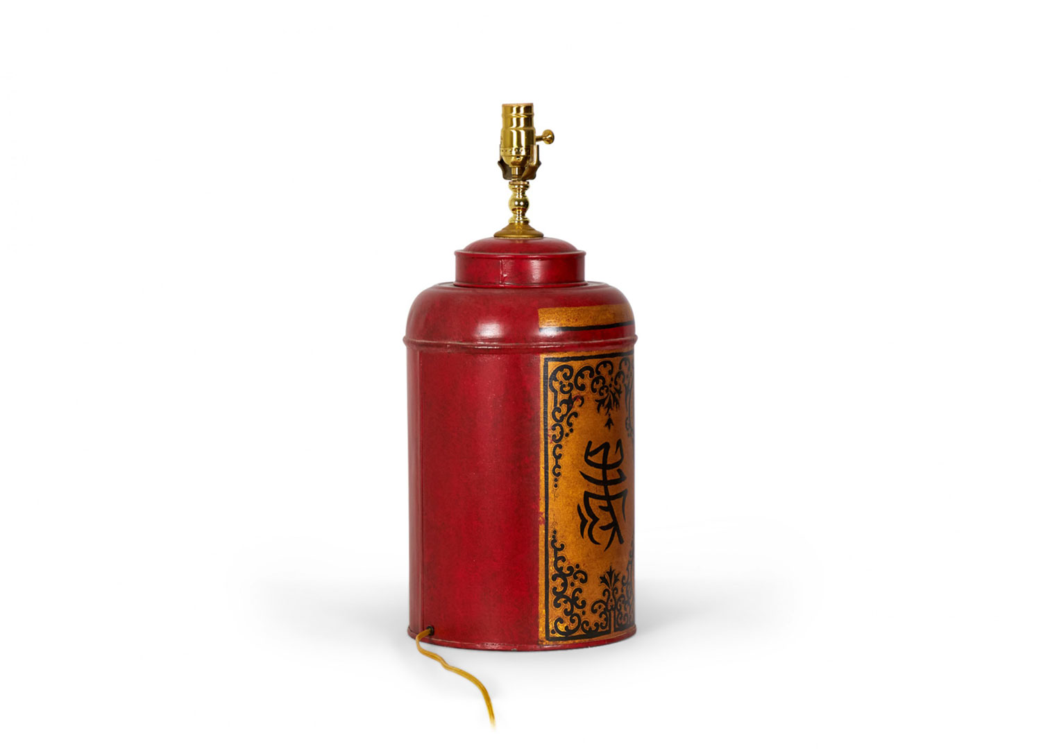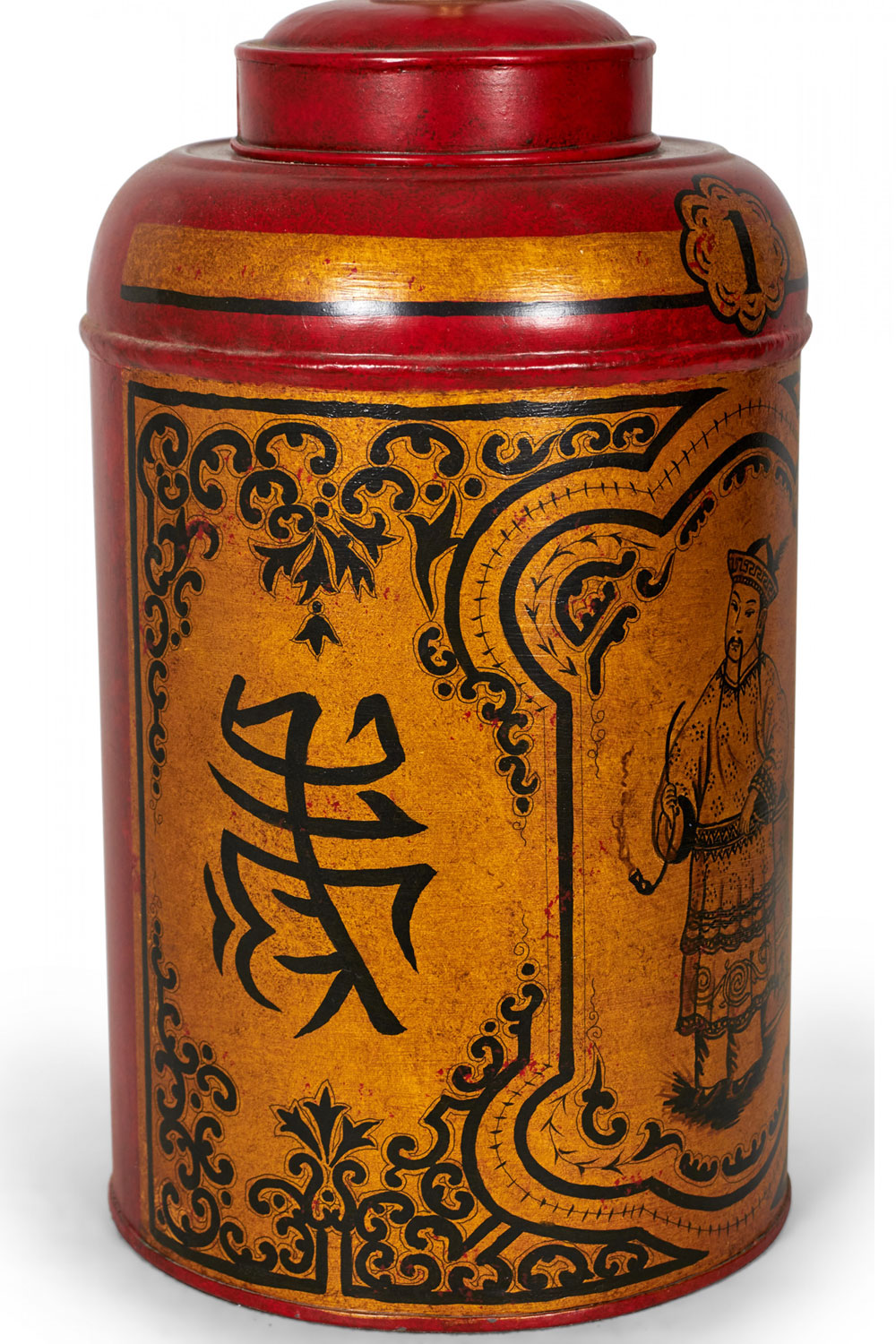 PAIR of English export Chinoiserie-style table lamps made of tole tea caddies mounted as lamps with brass hardware, hand painted with gold and black portraiture designs framed by floral swirls and characters against a red background. (PRICED AS PAIR)
