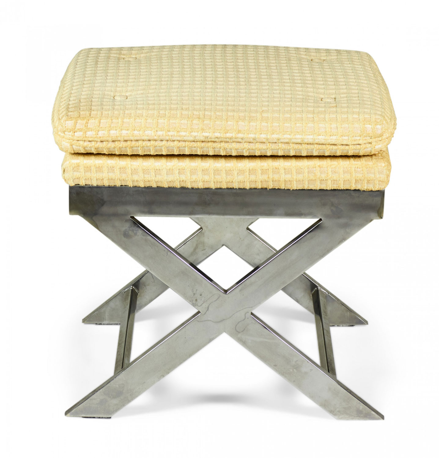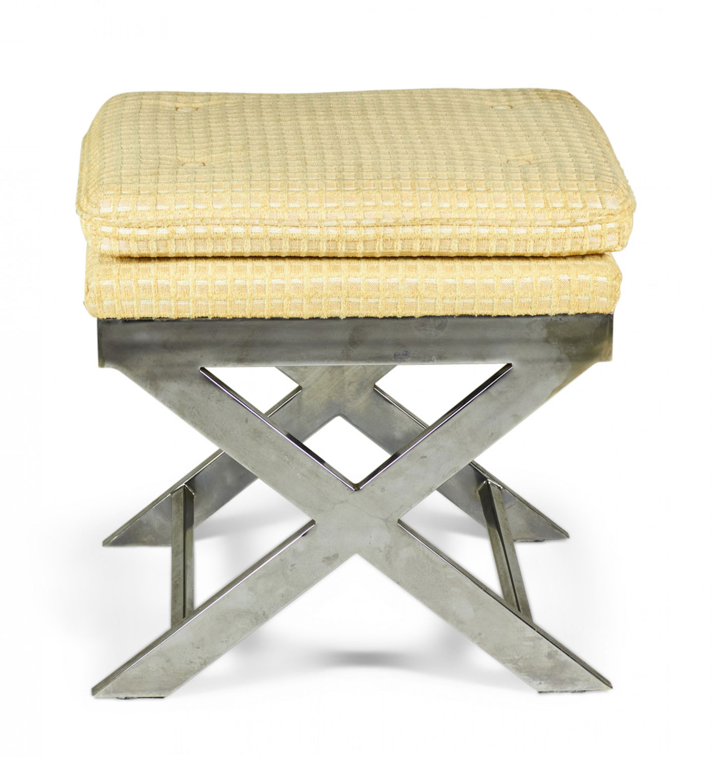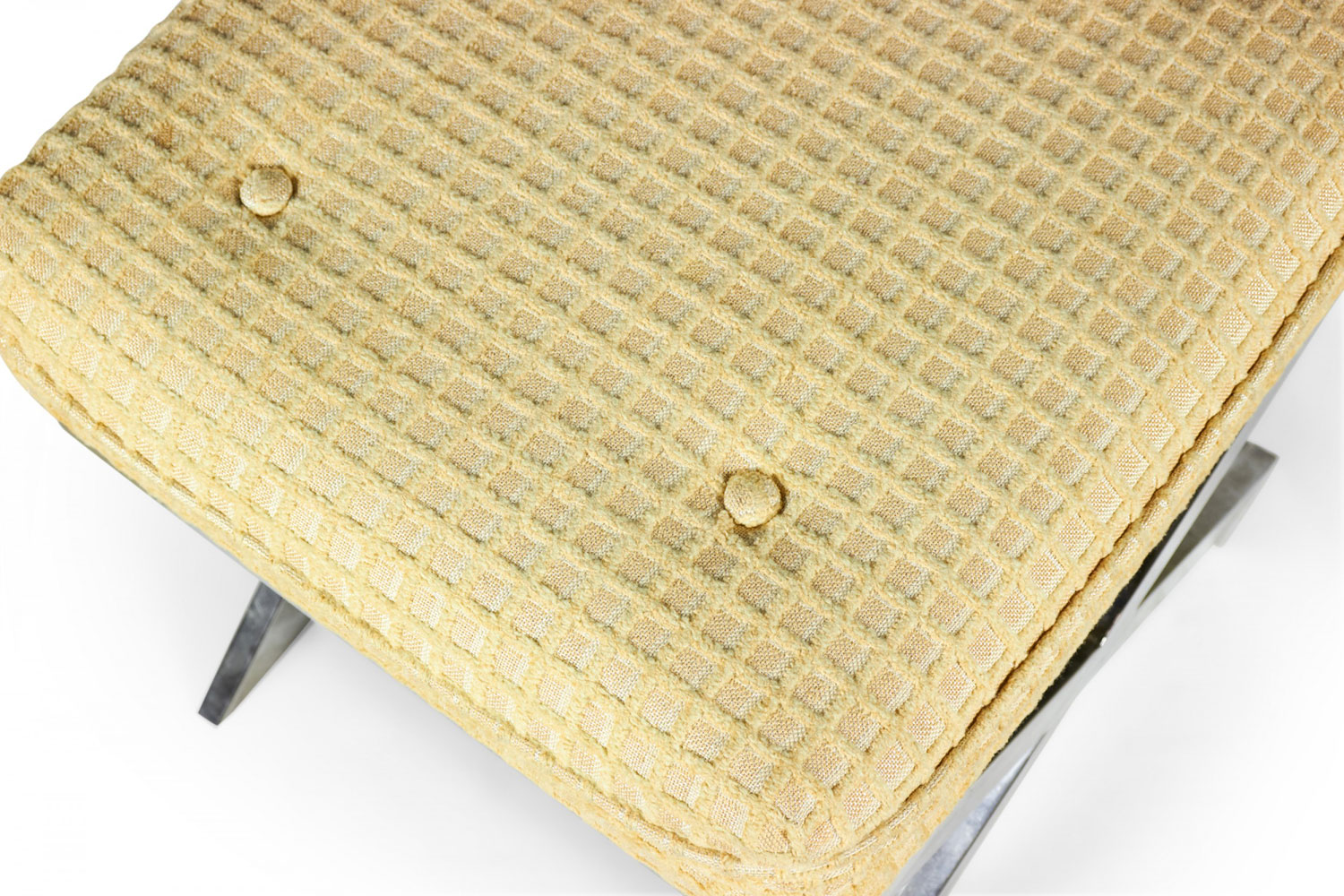 PAIR of Italian Mid-Century (circa 1970) upholstered stools / benches with beige and yellow waffle-patterned upholstered seats atop x-shaped chrome bases. (WEIMAN-WARREN) (PRICED AS PAIR)
