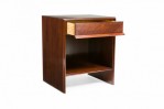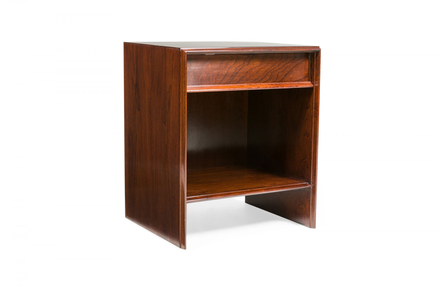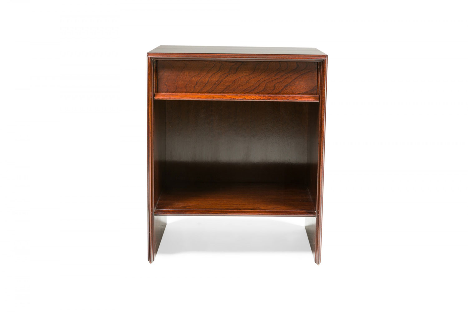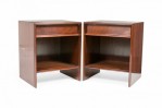 PAIR of American Mid-Century walnut bedside tables / commodes with an open lower compartment and an upper single drawer. (T.H. ROBSJOHN-GIBBINGS FOR WIDDICOMB FURNITURE CO.)(PRICED AS PAIR)