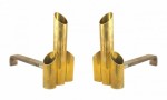 PAIR of French Post-War Design brass andirons with a center tall cylinder surrounded by 2 smaller cylinders. (PRICED AS PAIR)