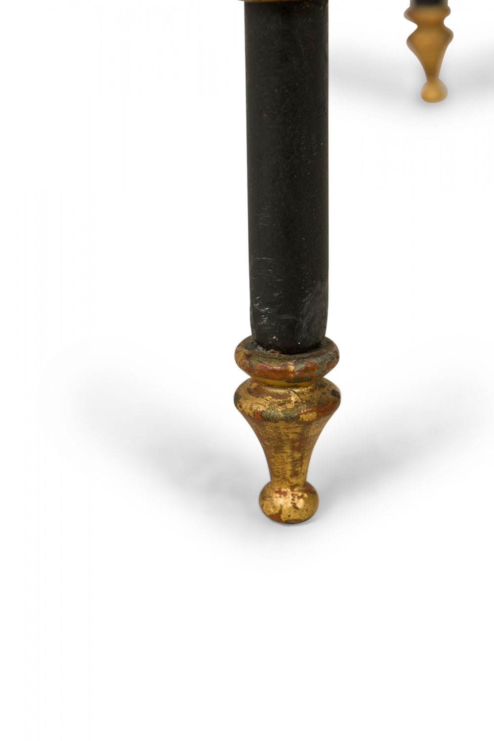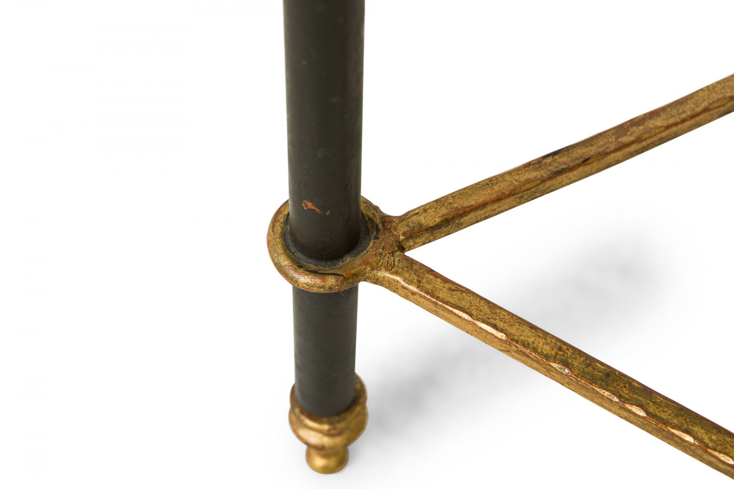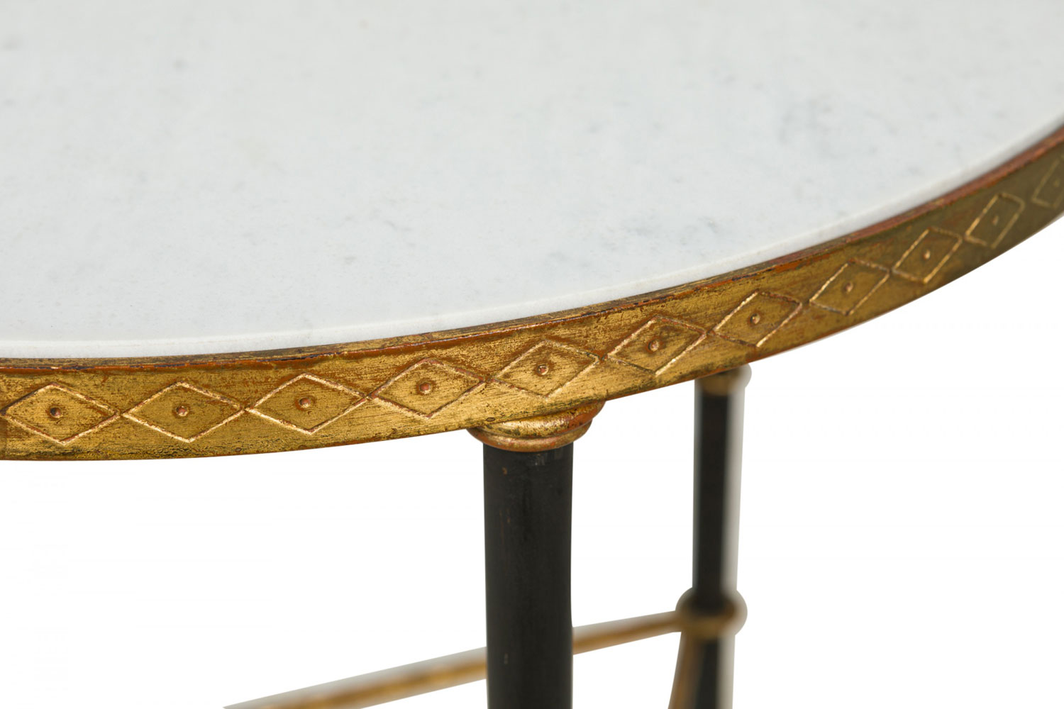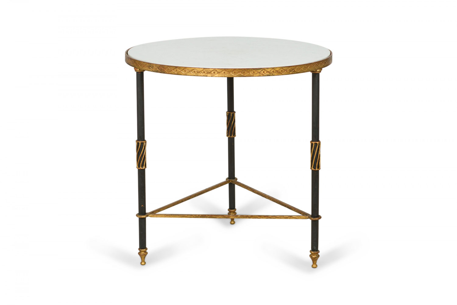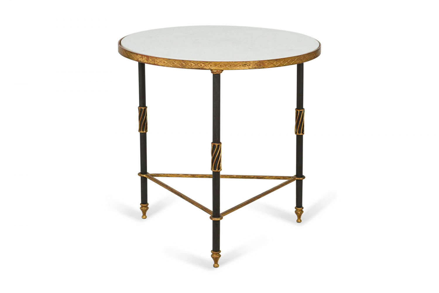Mid-Century circular end / side table with a white marble top supported by a 3-legged black iron frame with gilt iron trim and details. (PALLADIO)(Similar table: DUF0355B)