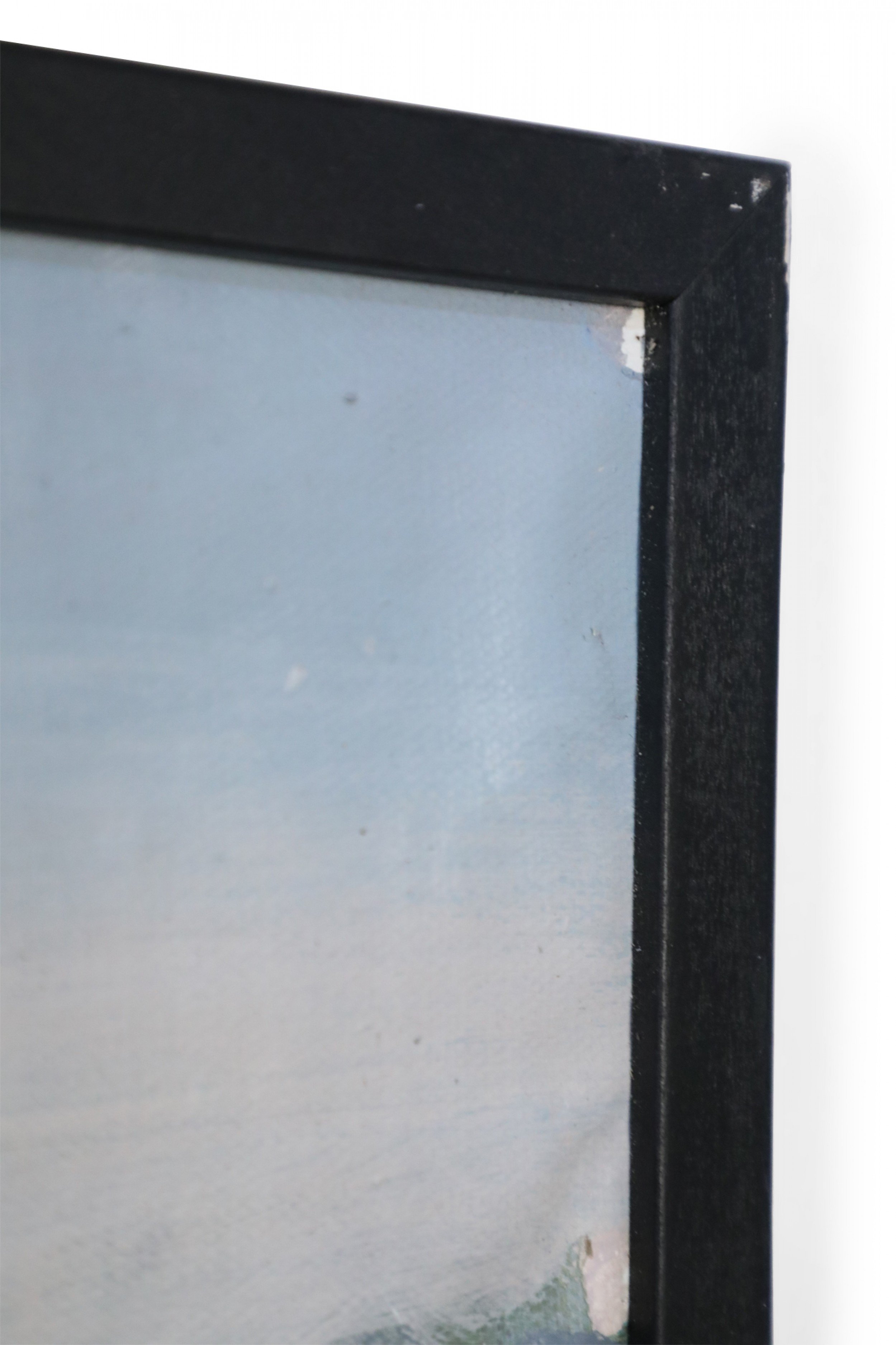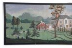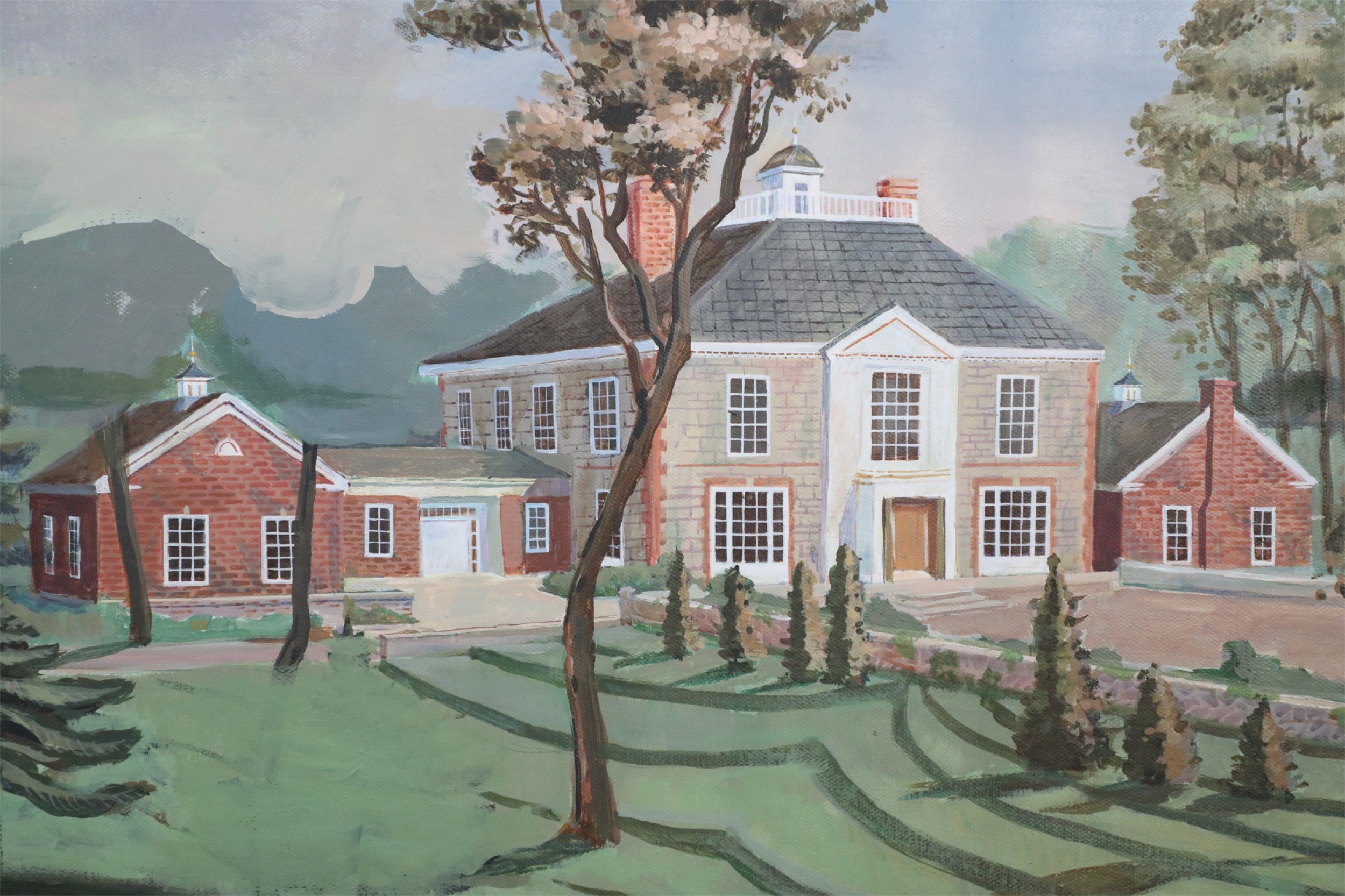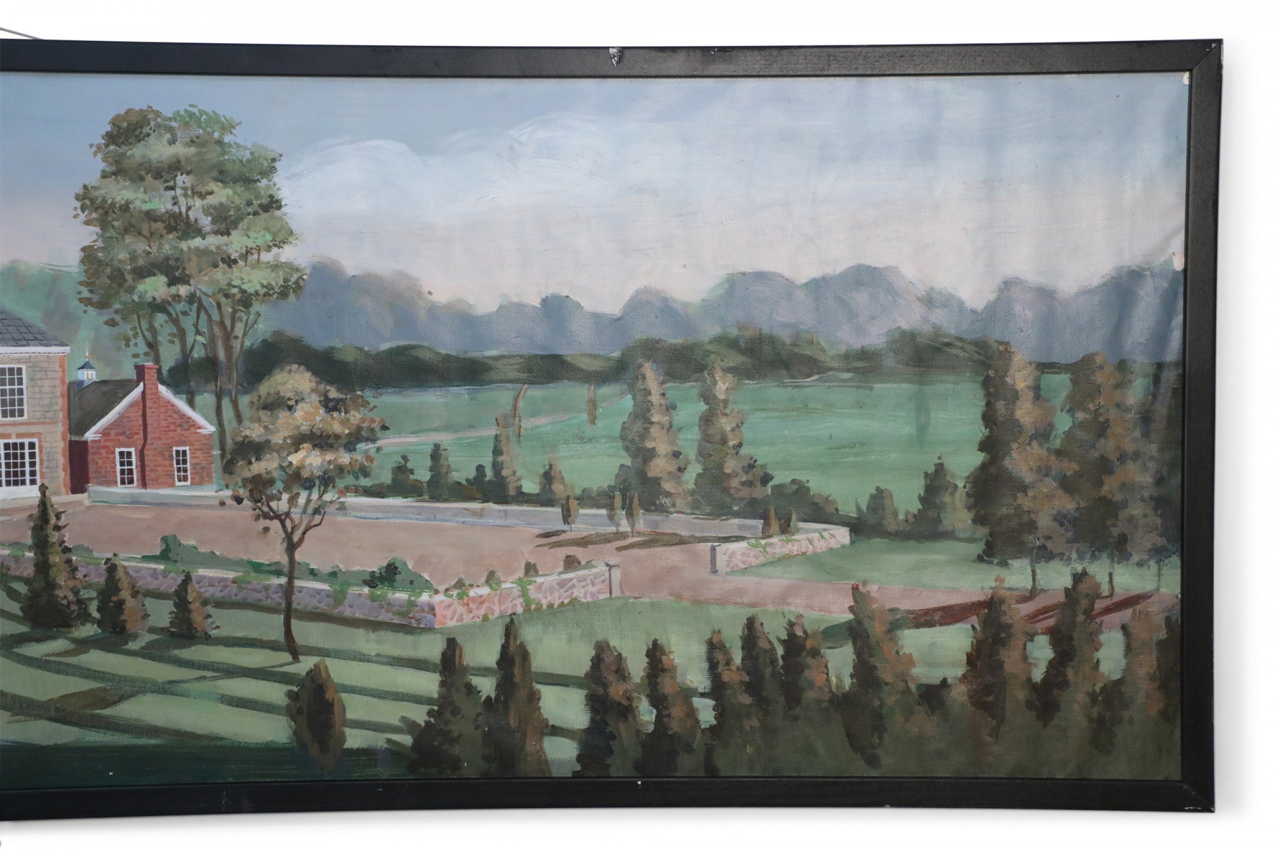 American Country style (20th Century) panoramic landscape painting of a manor house and surrounding gardens on wide, narrow rectangular canvas in a black-painted wooden frame.