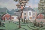 American Country style (20th Century) panoramic landscape painting of a manor house and surrounding gardens on wide, narrow rectangular canvas in a black-painted wooden frame..