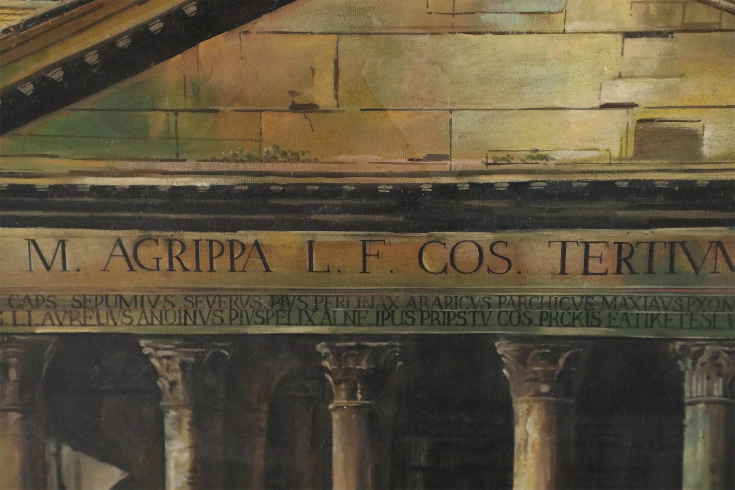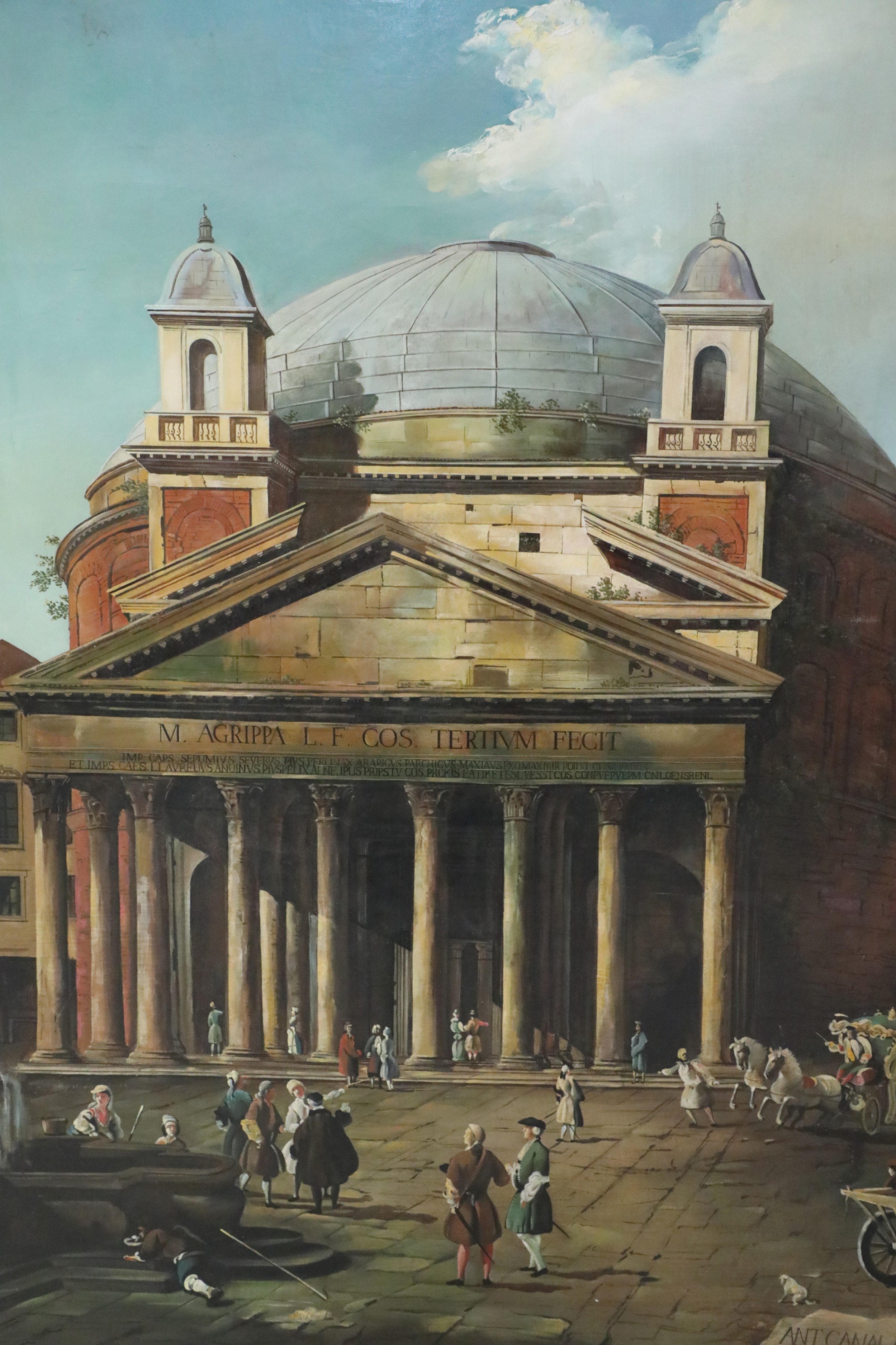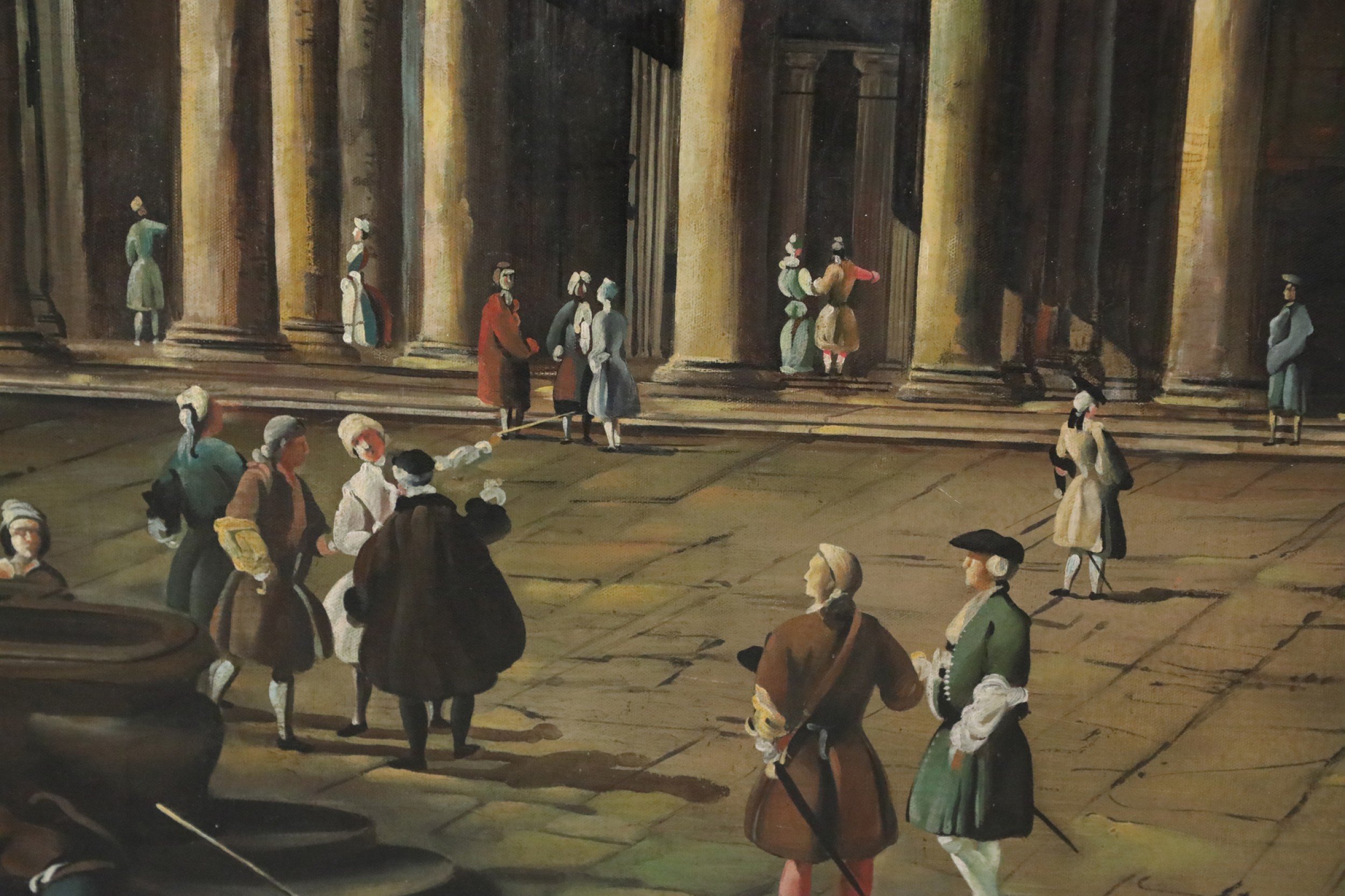 Italian Neo-classic style (20th Century) unframed canvas oil painting of bustling 18th century life - figures, carriages and horses - unfolding before the Pantheon in Rome, capturing the building's Corinthian columns under a pediment bearing its Latin inscription, and the top of its famed concrete dome..