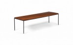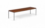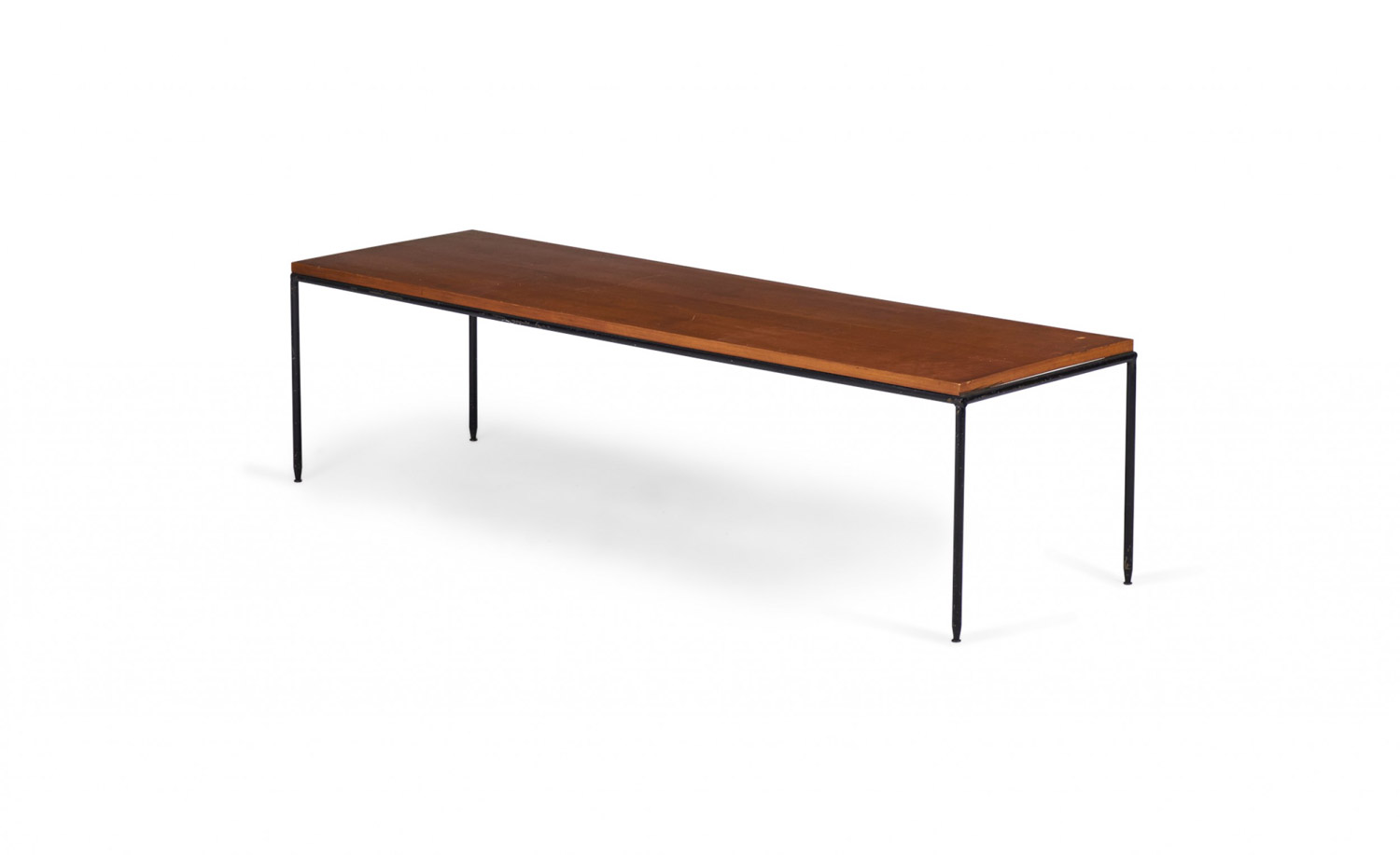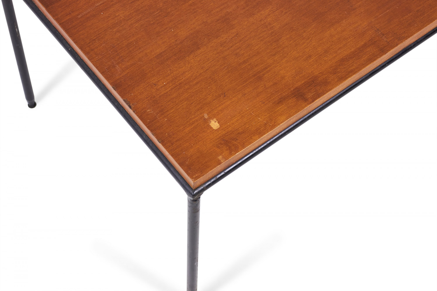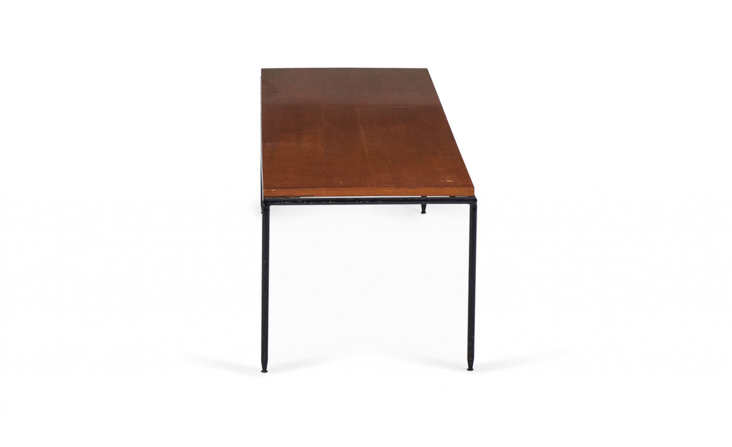 American Mid-Century rectangular coffee / cocktail table with a tobacco brown maple top resting on a wrought iron base. (PAUL MCCOBB)(Available in blond maple: DUF0084).