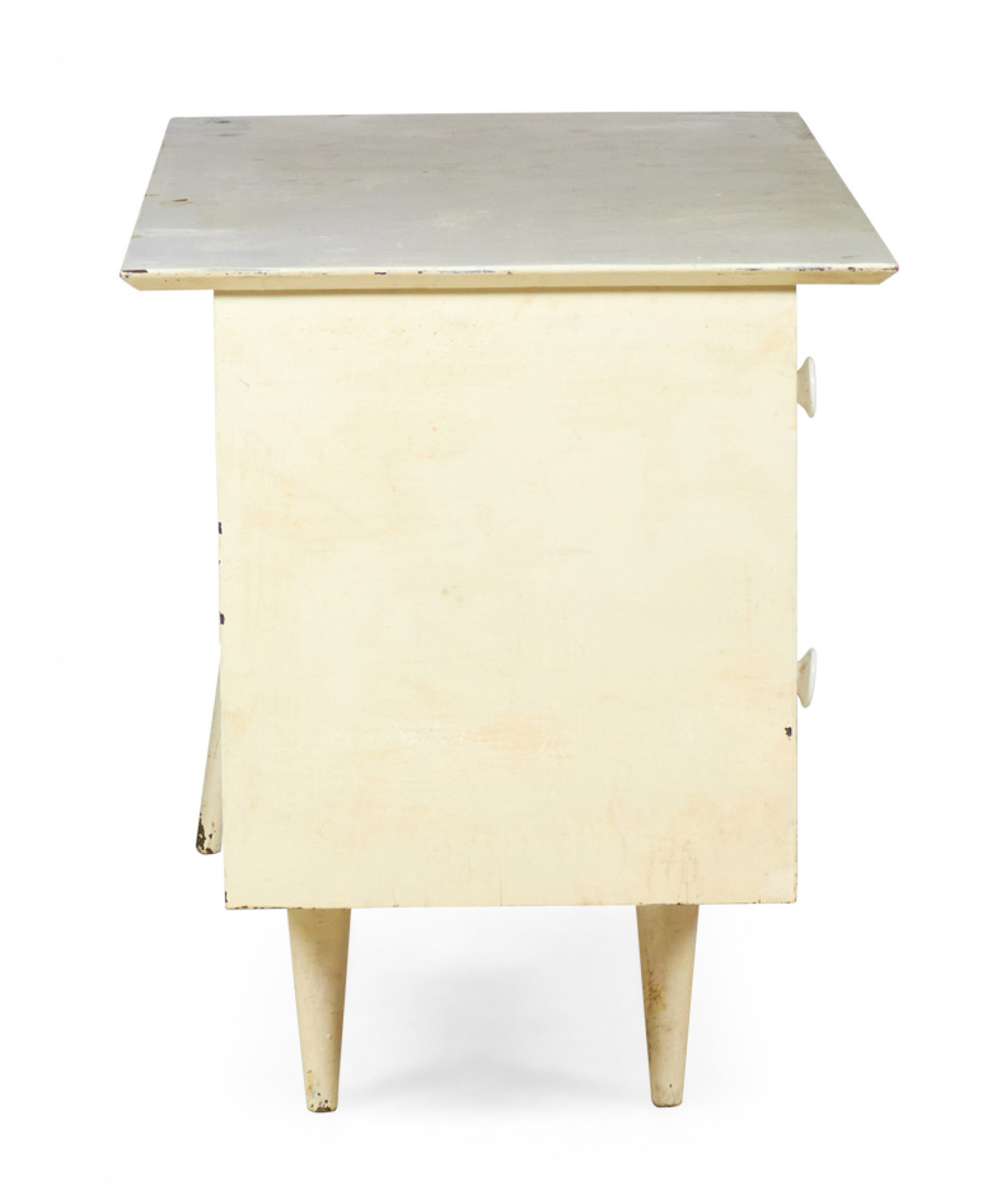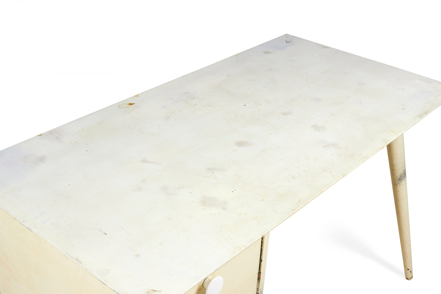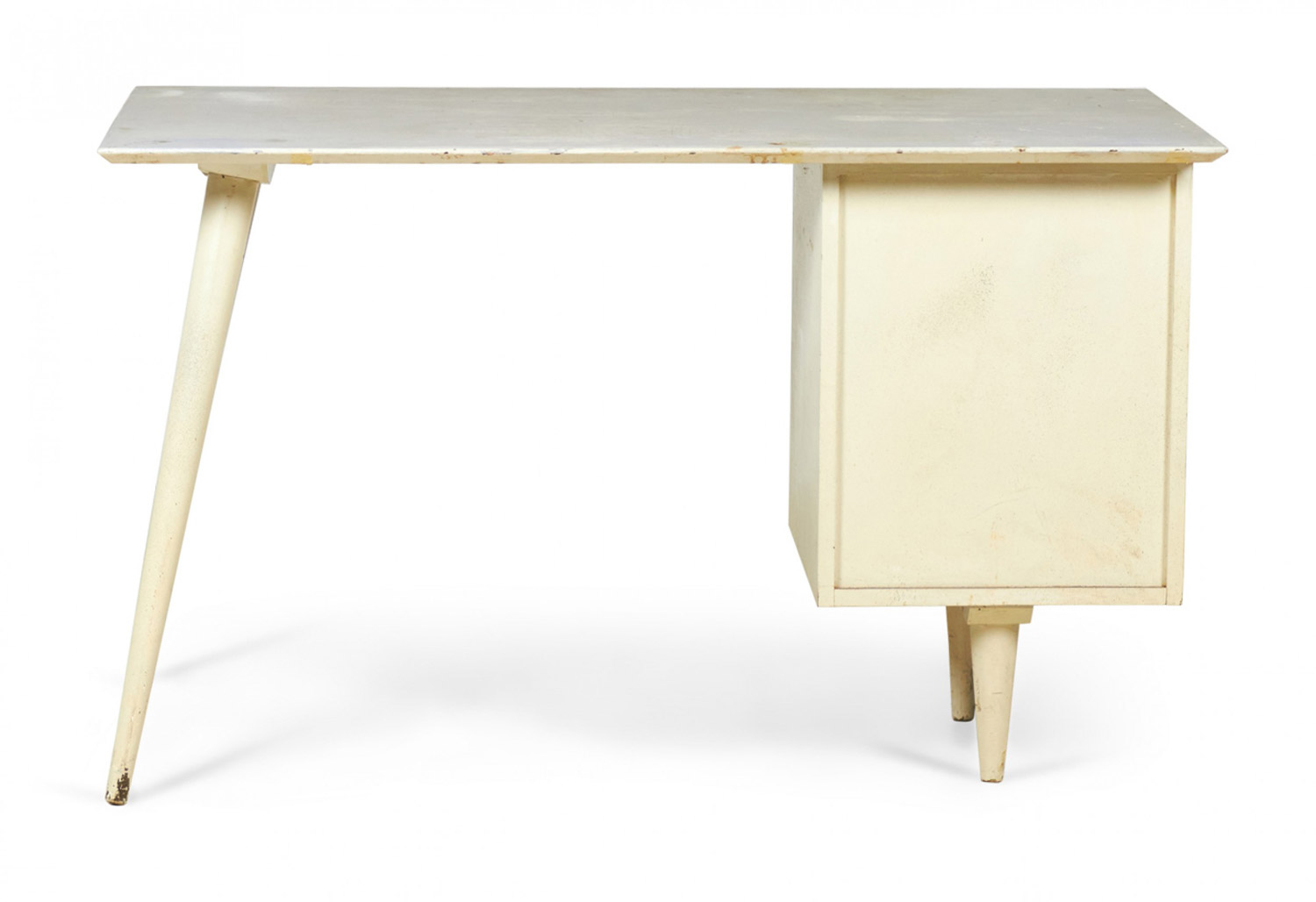 American Mid-Century wooden white-painted student desk with a rectangular desktop supported on the left by two drawers with circular knob pulls resting on two short tapered legs, and on the right by two angled tapered legs. (PAUL MCCOBB, model 1560)(Same model in different finishes: DUF0070, DUF0077)