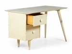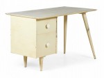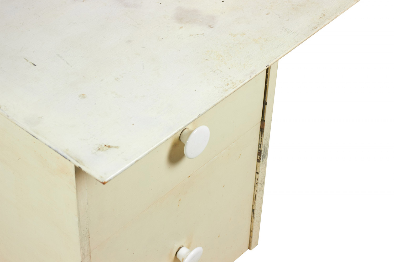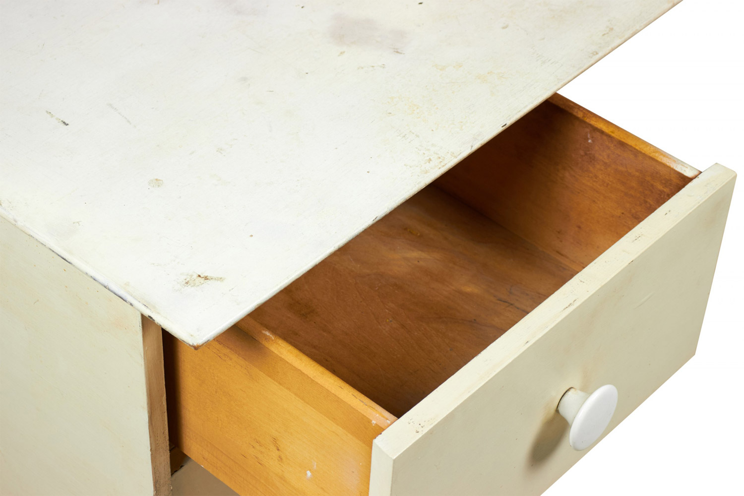 American Mid-Century wooden white-painted student desk with a rectangular desktop supported on the left by two drawers with circular knob pulls resting on two short tapered legs, and on the right by two angled tapered legs. (PAUL MCCOBB, model 1560)(Same model in different finishes: DUF0070, DUF0077).