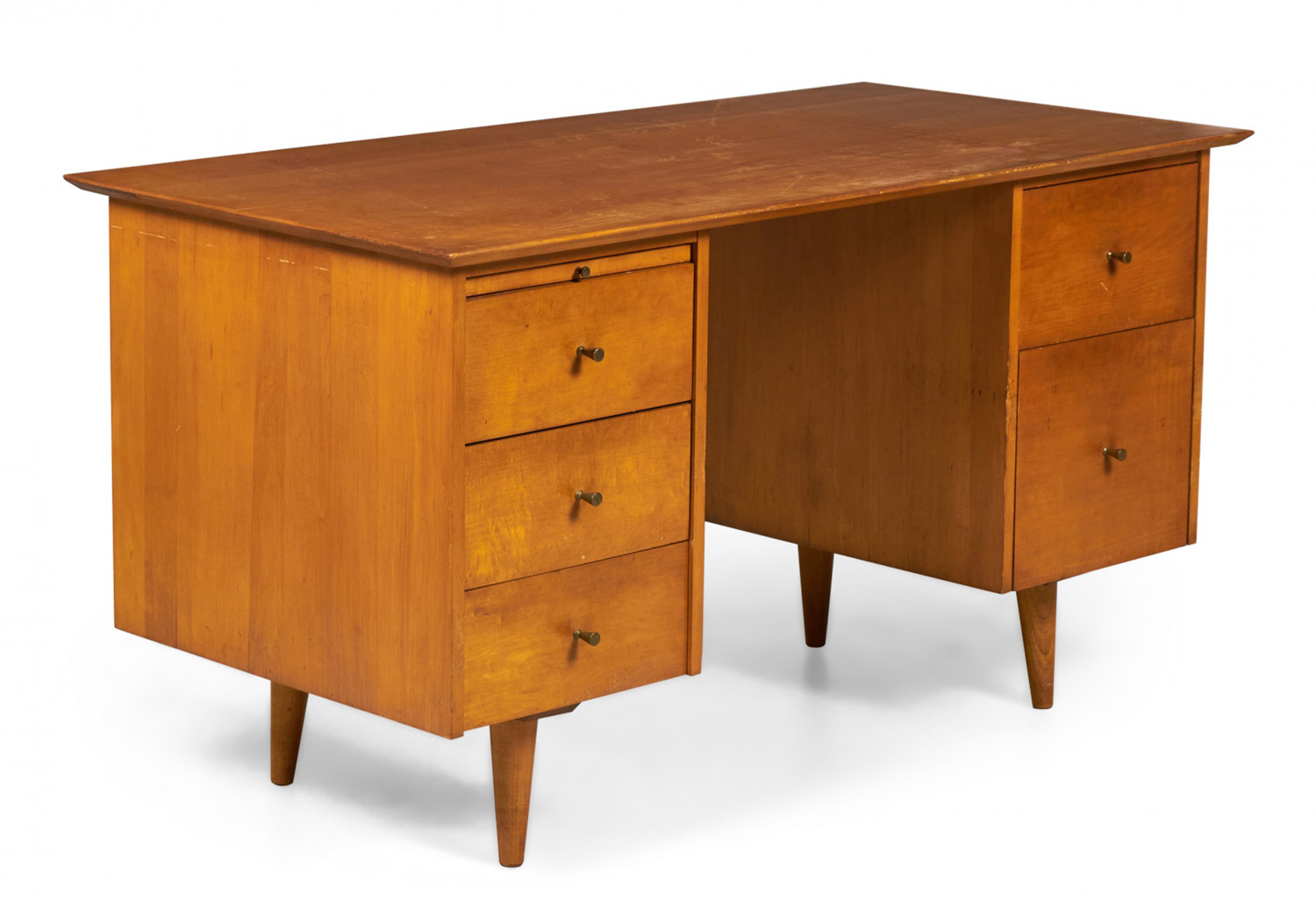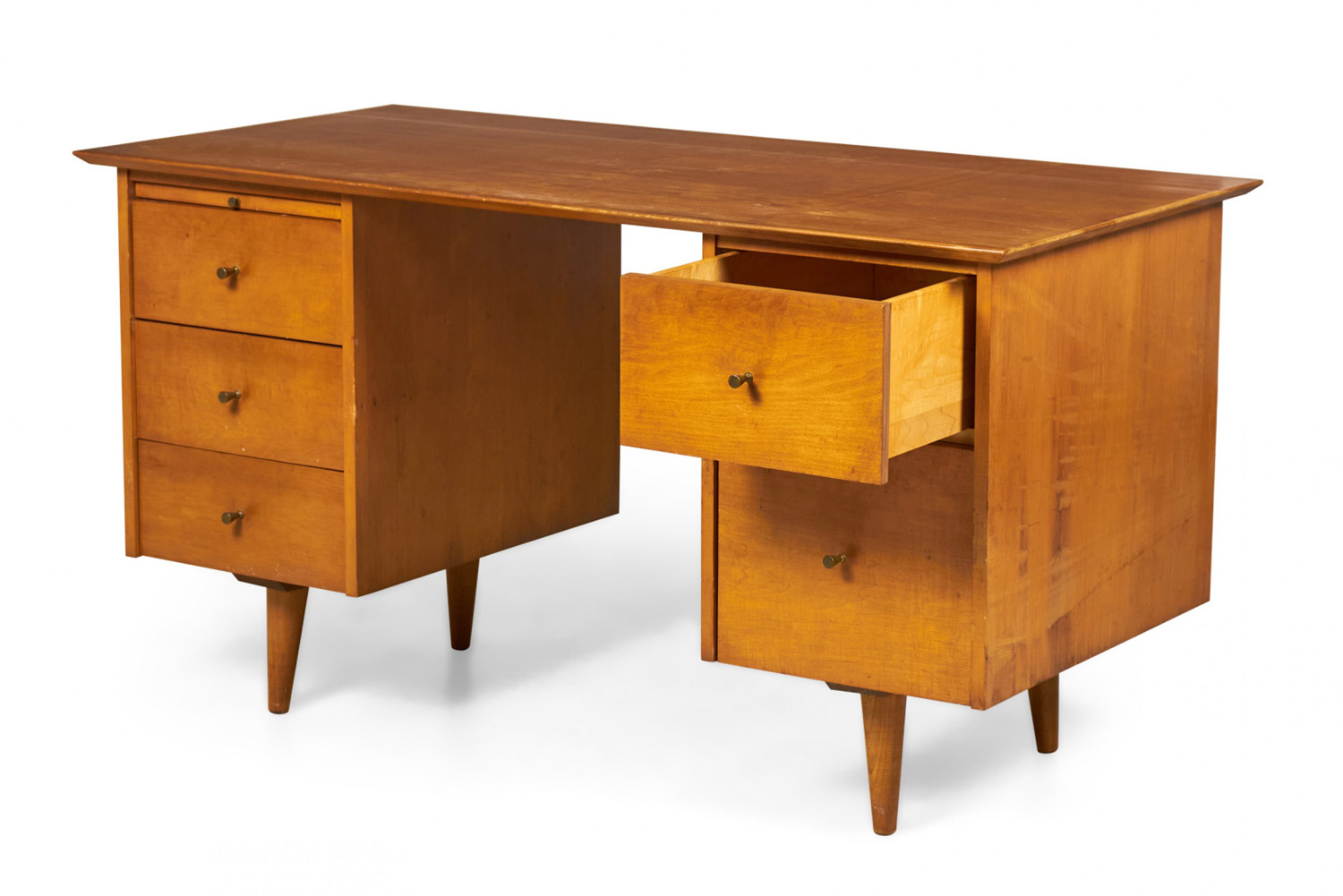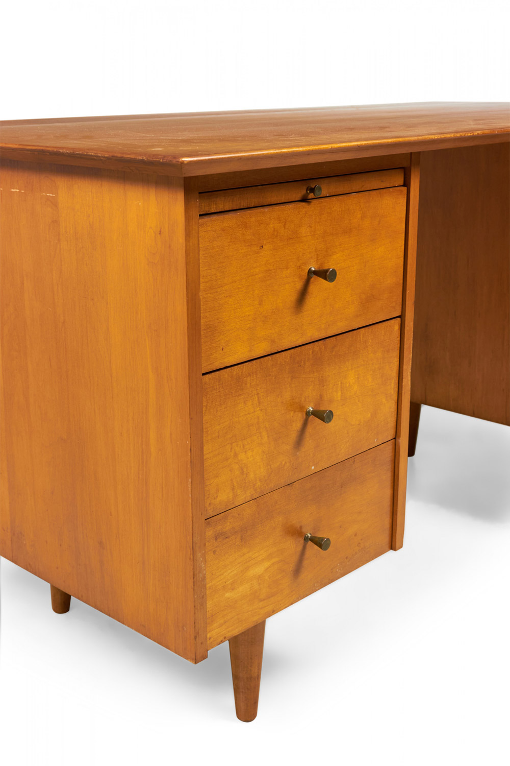 American Mid-Century (circa 1950) maple double pedestal desk with vintage finish and solid brass "golf tee" hardware, three drawers on one pedestal and two larger drawers on the other, resting on four tapered legs. (PAUL MCCOBB FOR THE PLANNER GROUP LINE FROM WINCHENDON).