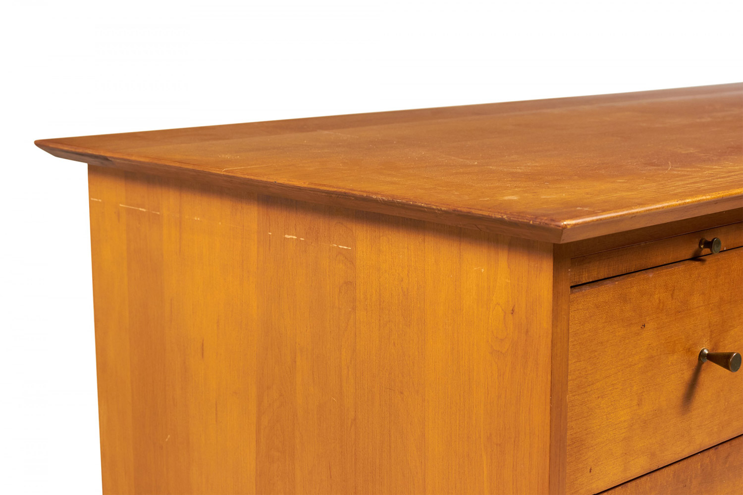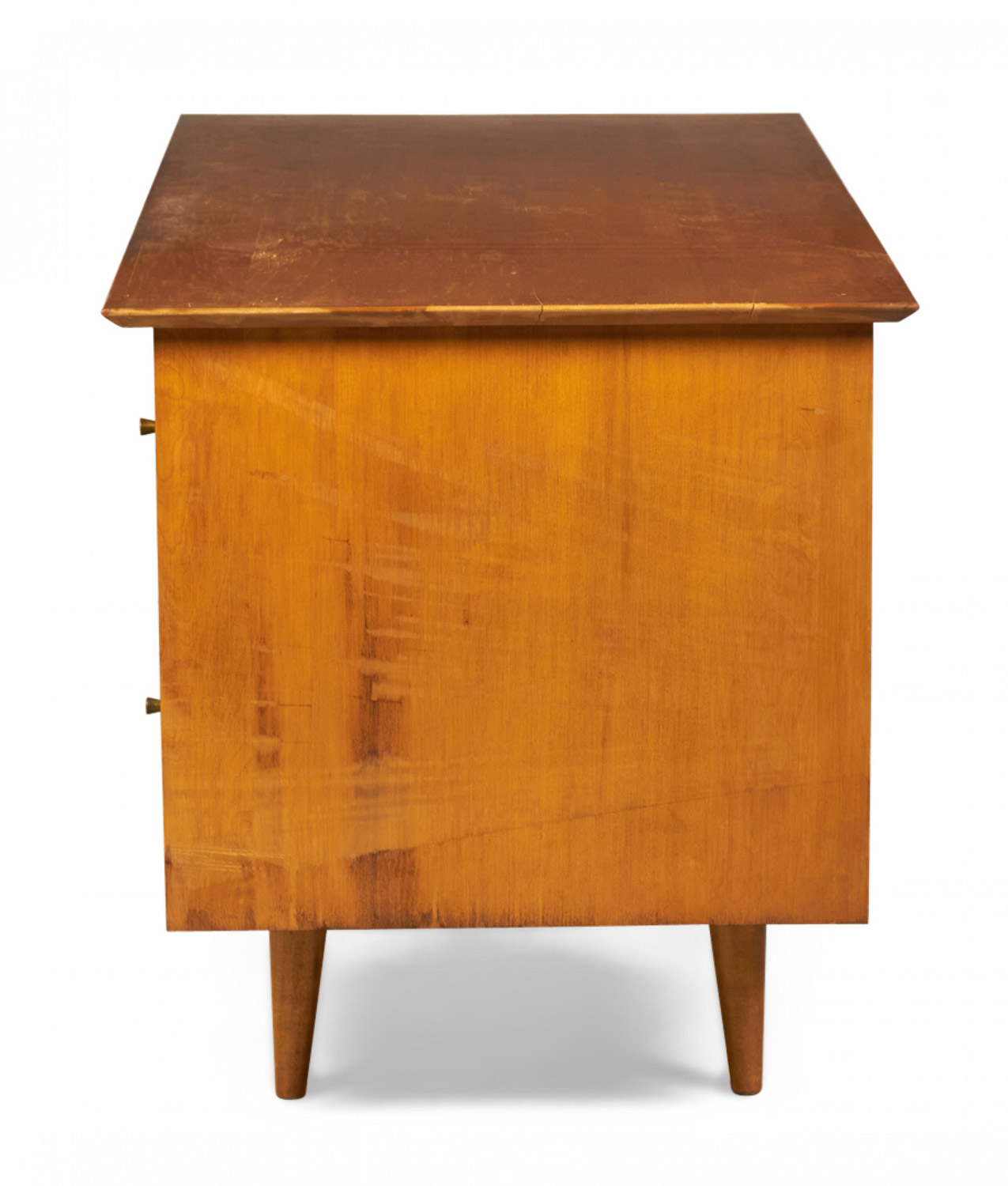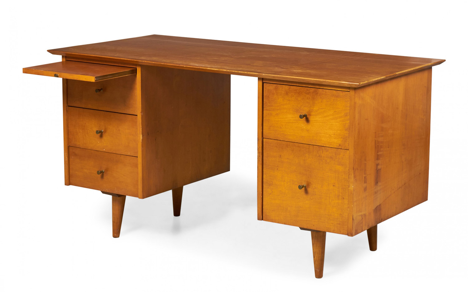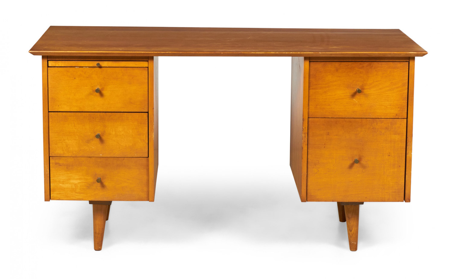 American Mid-Century (circa 1950) maple double pedestal desk with vintage finish and solid brass "golf tee" hardware, three drawers on one pedestal and two larger drawers on the other, resting on four tapered legs. (PAUL MCCOBB FOR THE PLANNER GROUP LINE FROM WINCHENDON).
