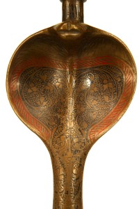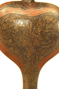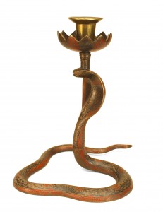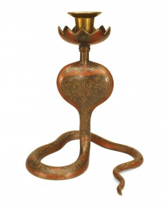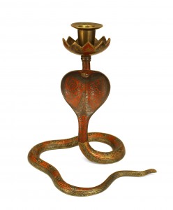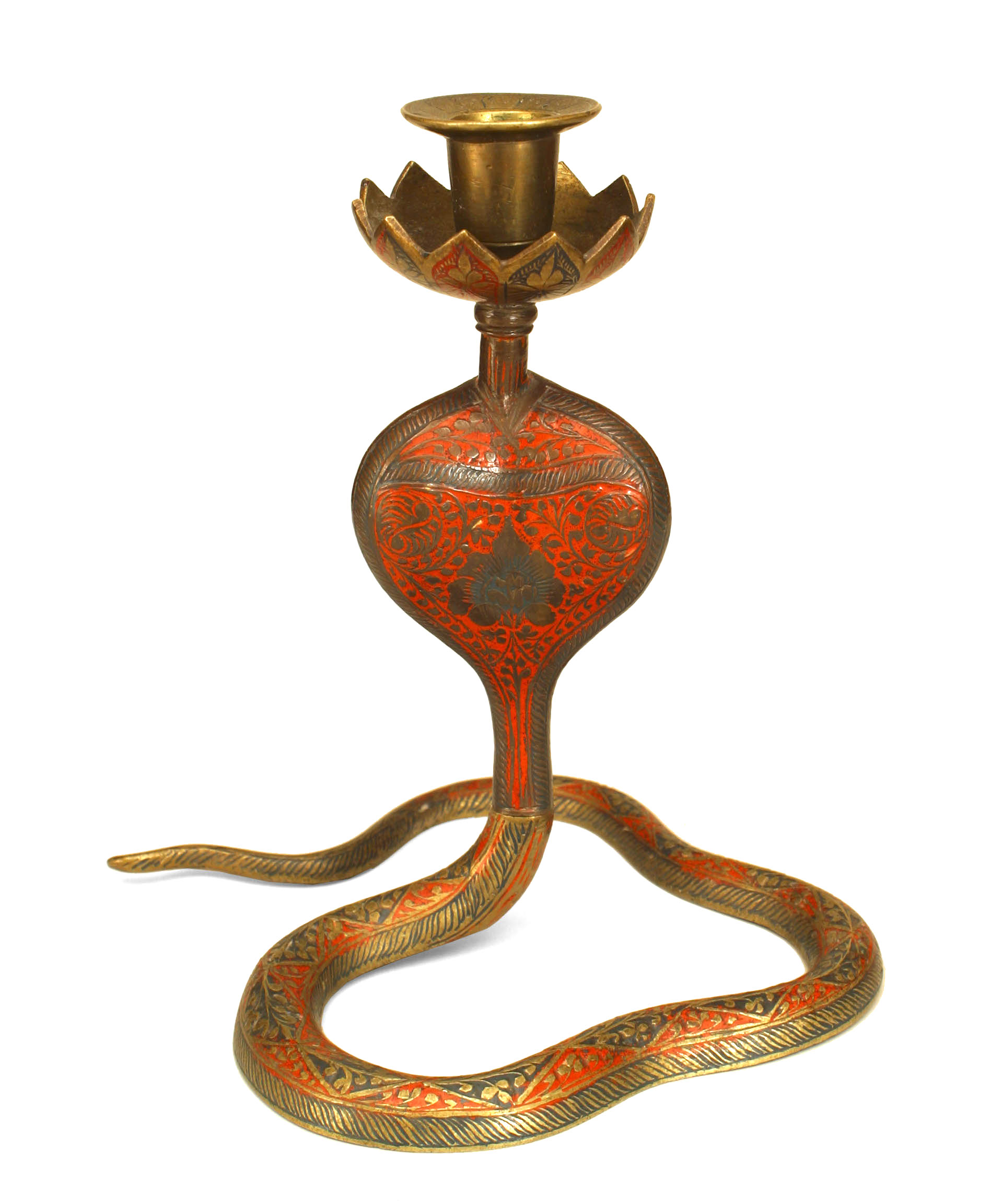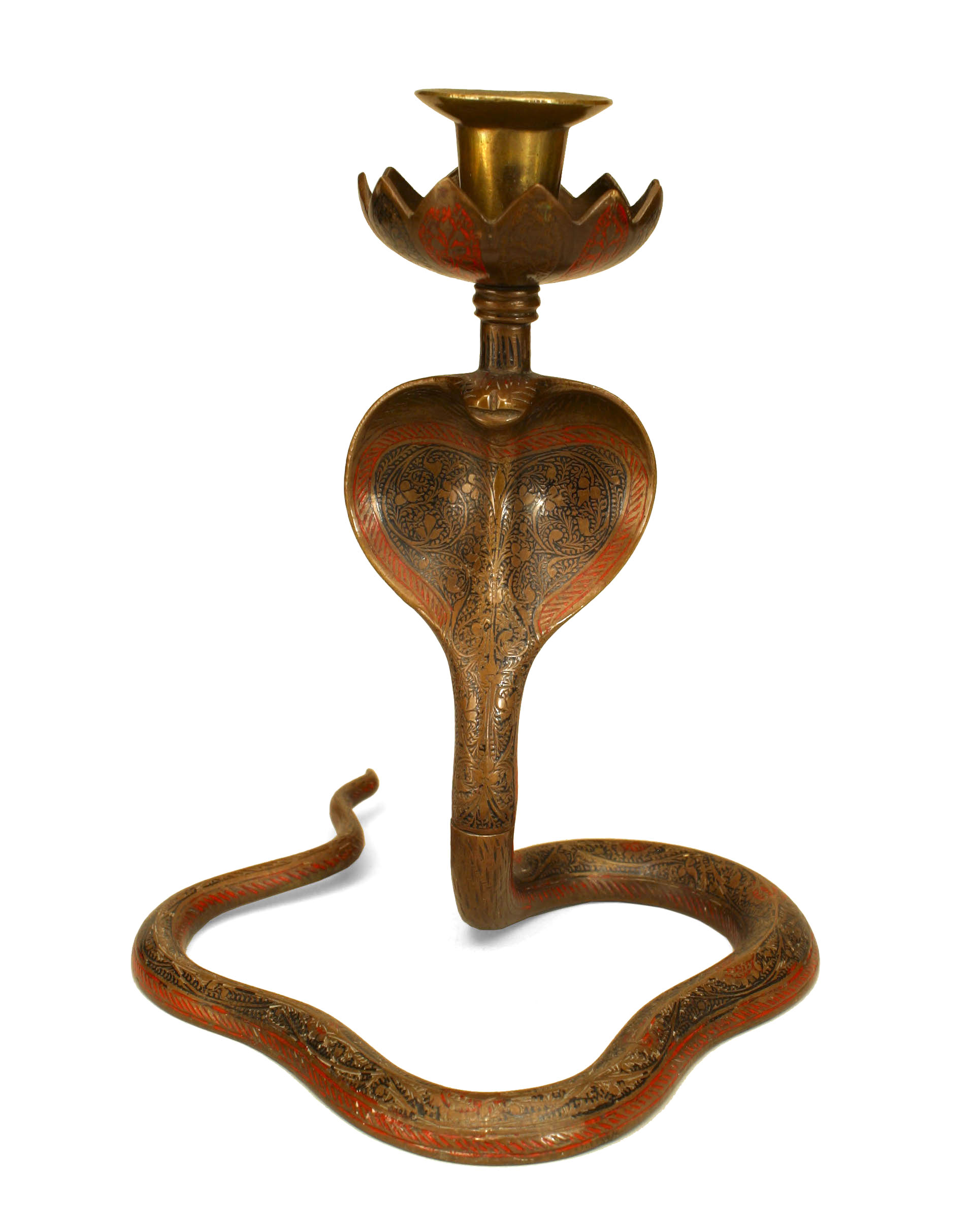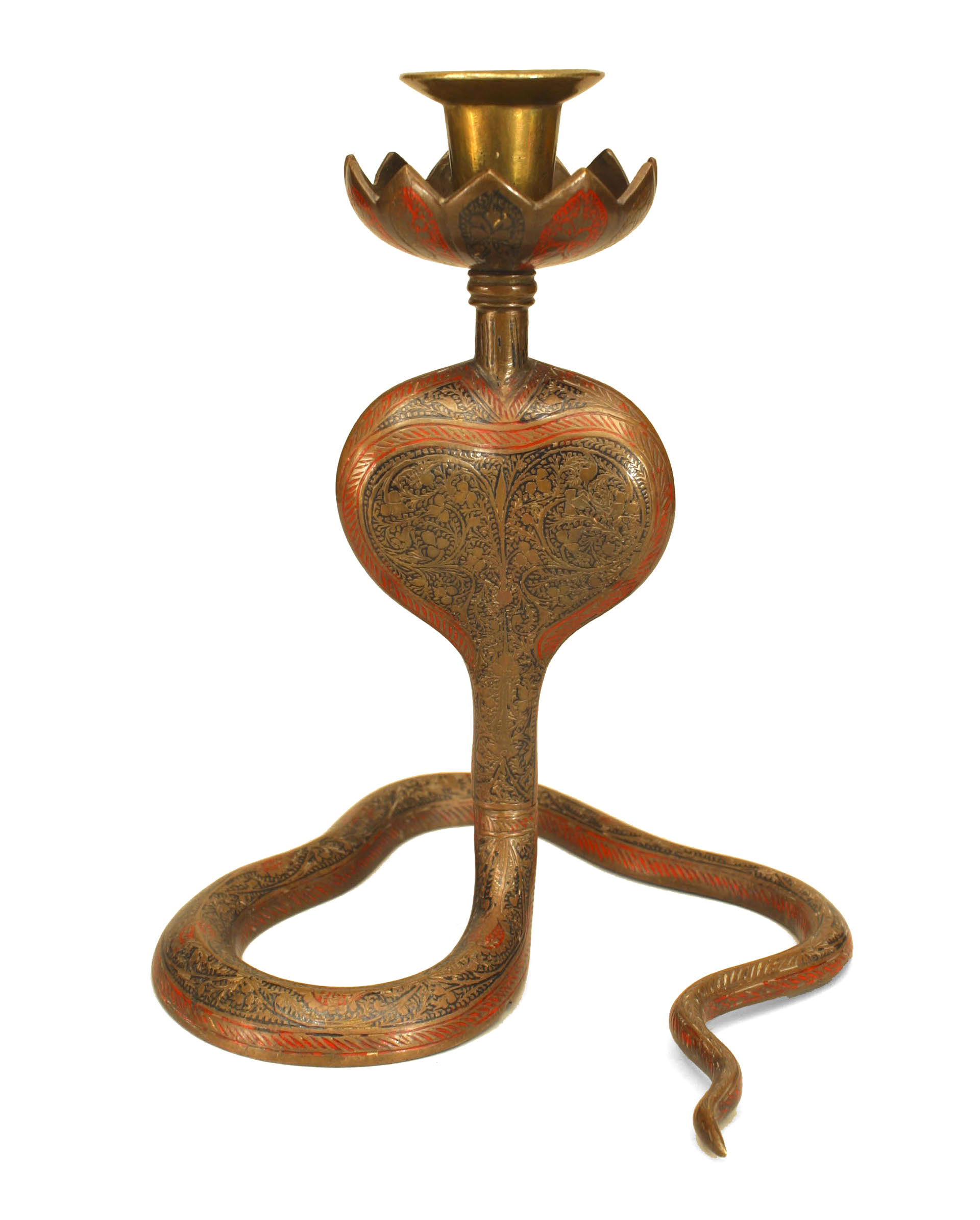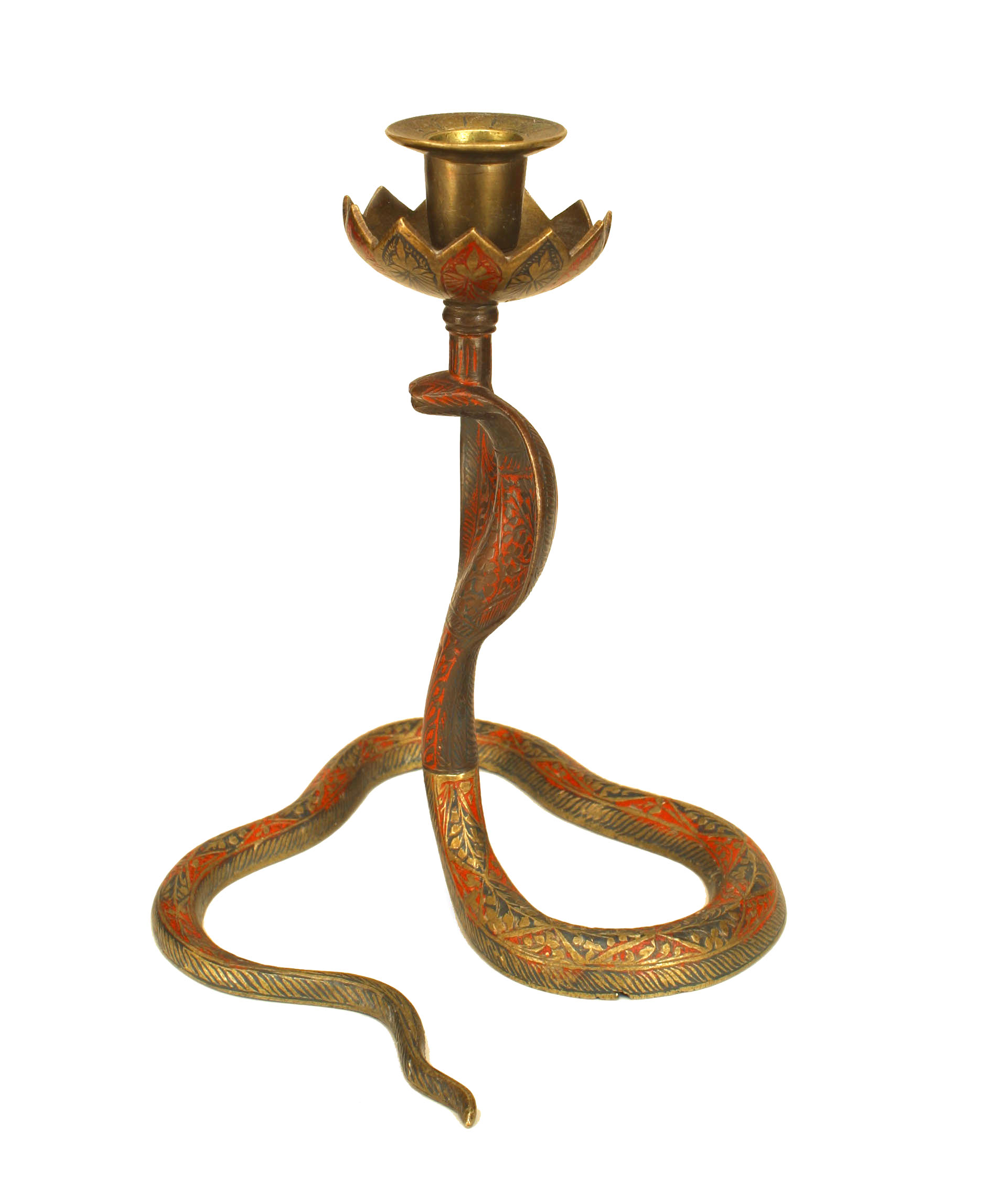 Middle Eastern Persian-style brass candlestick in the form of a cobra snake with incised black and red enamel decoration.