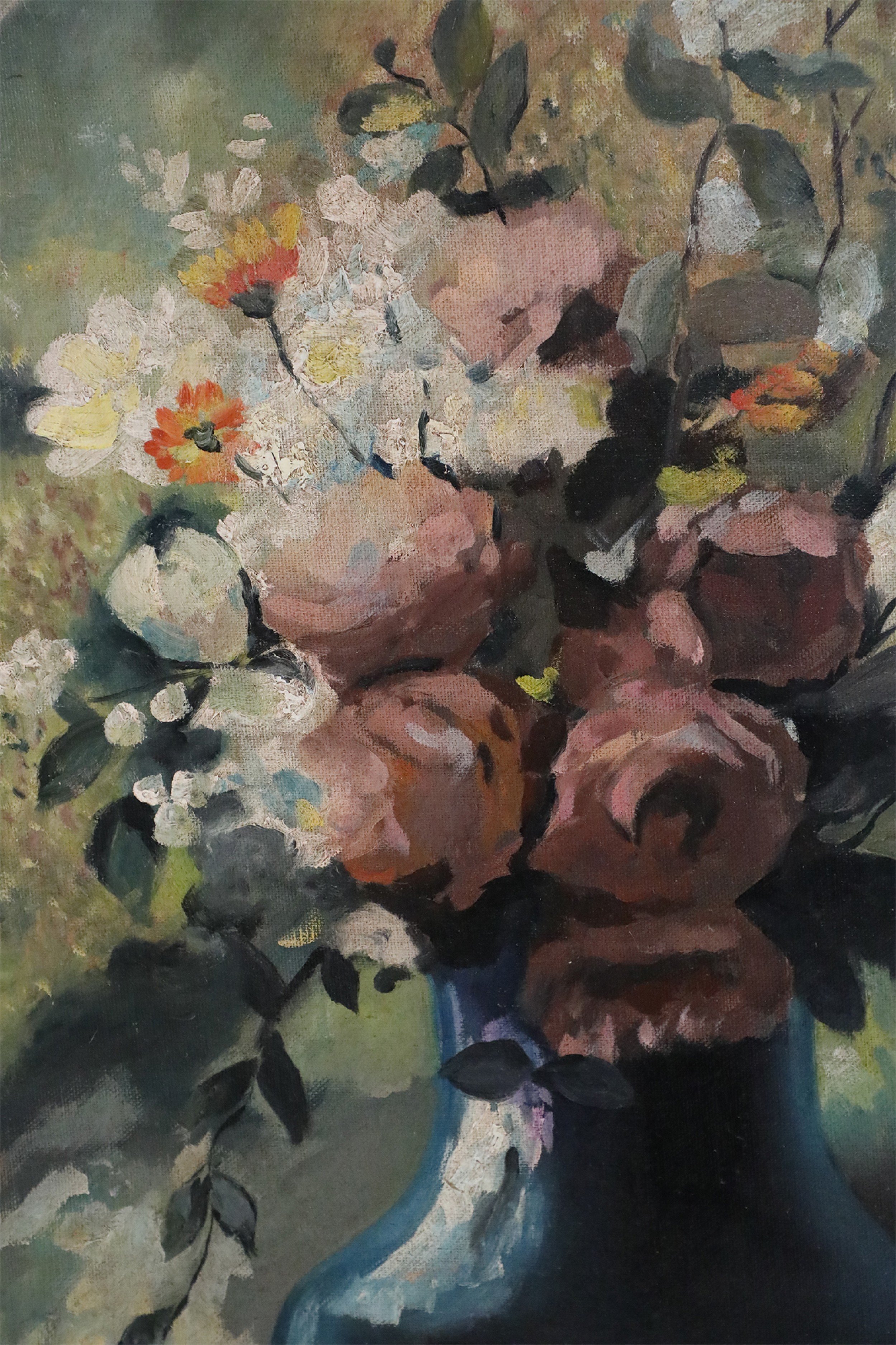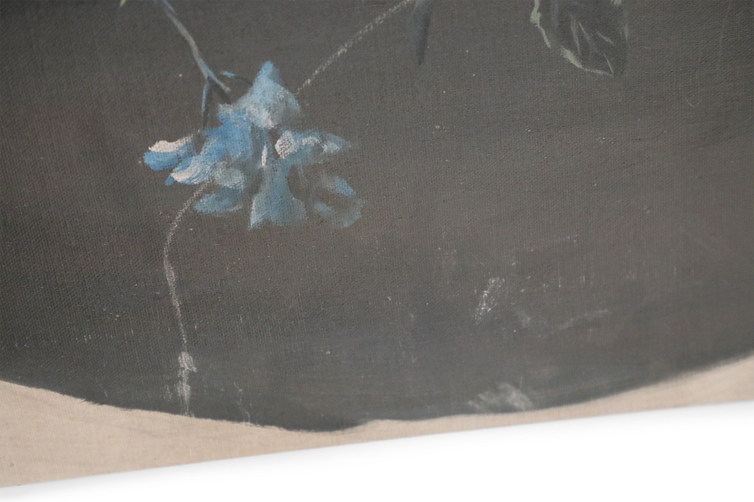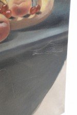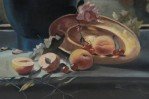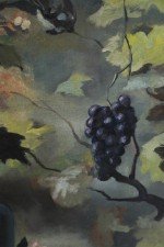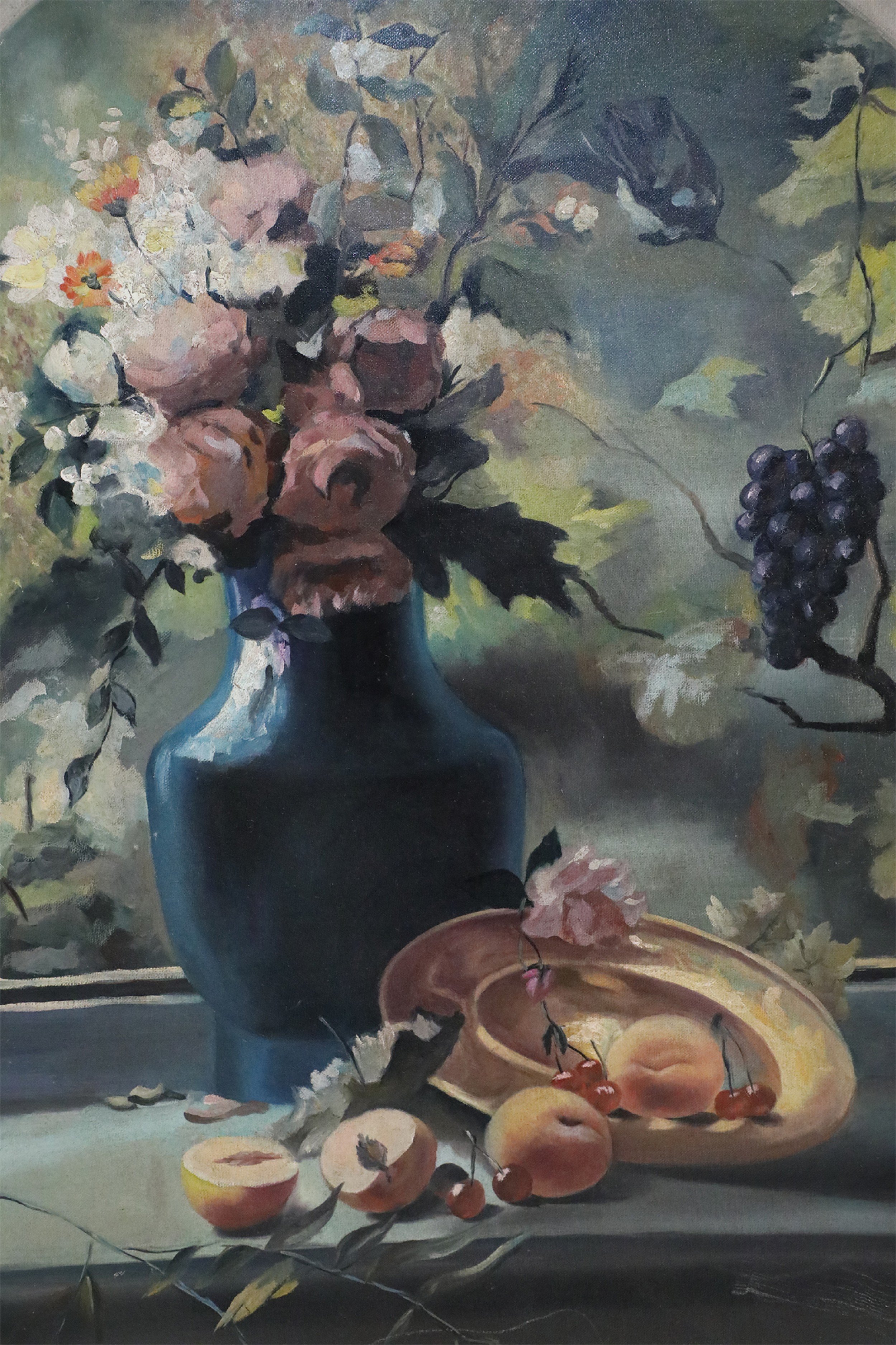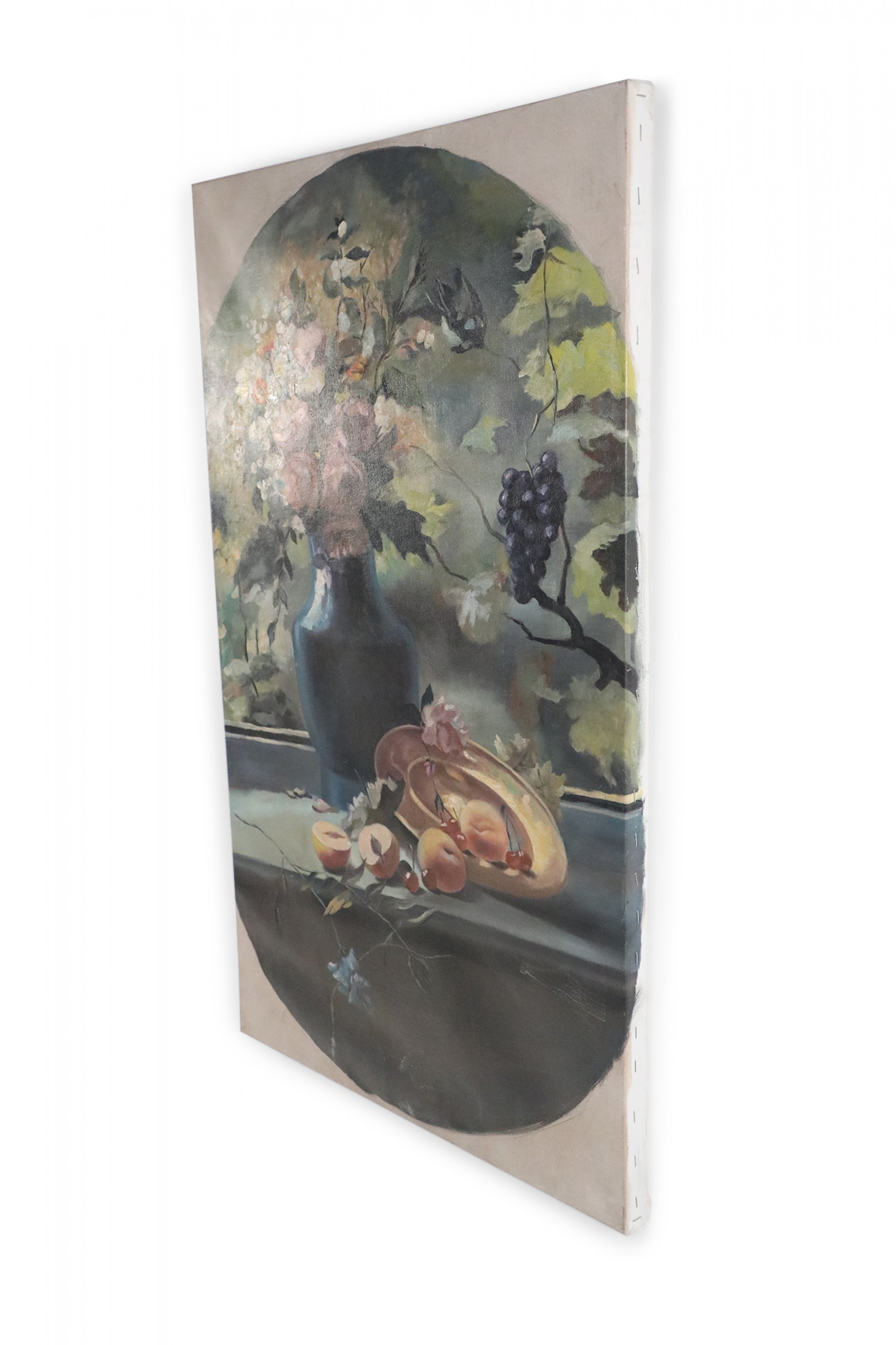 Italian Neo-classic style (20th Century) unframed canvas still life oil painting depicting a blue vase filled with blossoming pink, yellow and white florals behind a golden tray, spilling peaches and cherries onto the surface, and a natural setting with grape vines in the background (Similar piece: NWL2281B, slight differences in line weight and background color)..