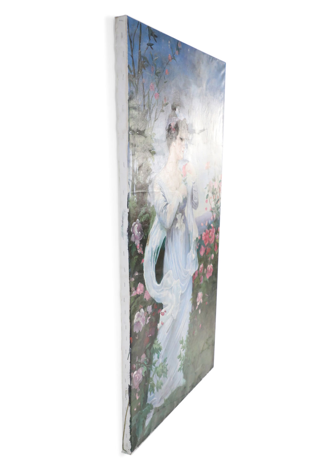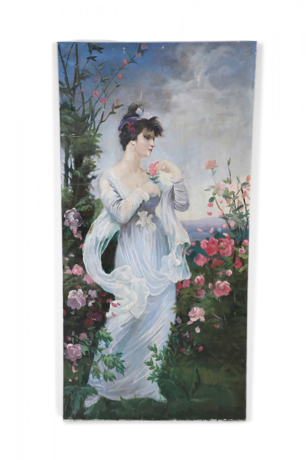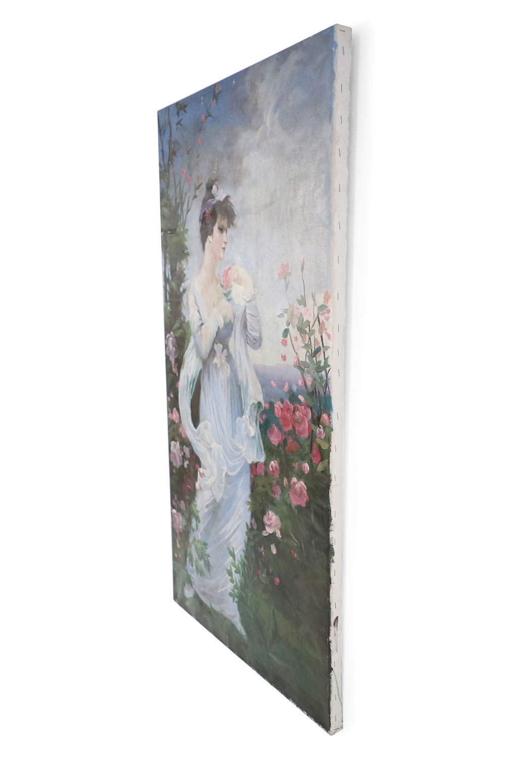 French Victorian style Neoclassical-style (20th Century) oil painting capturing a woman in a billowing white dress standing in a garden brimming with pink roses, with sea and sky in distant view. Painted on unframed canvas (Painting of similar subject/pose with differing details: NWL2271B).