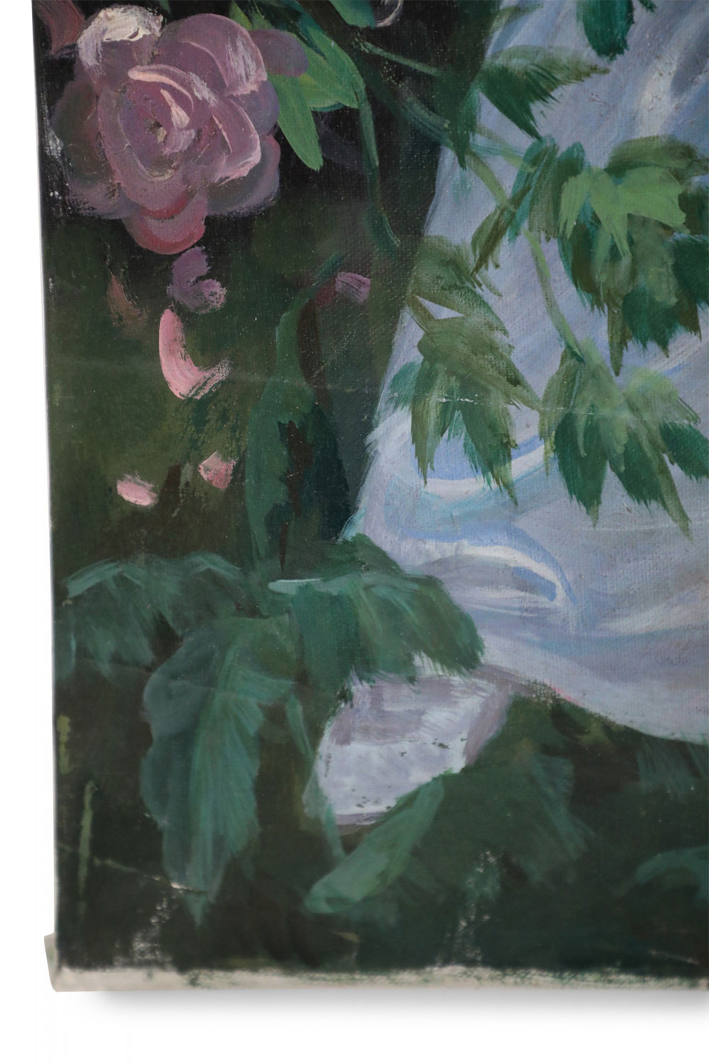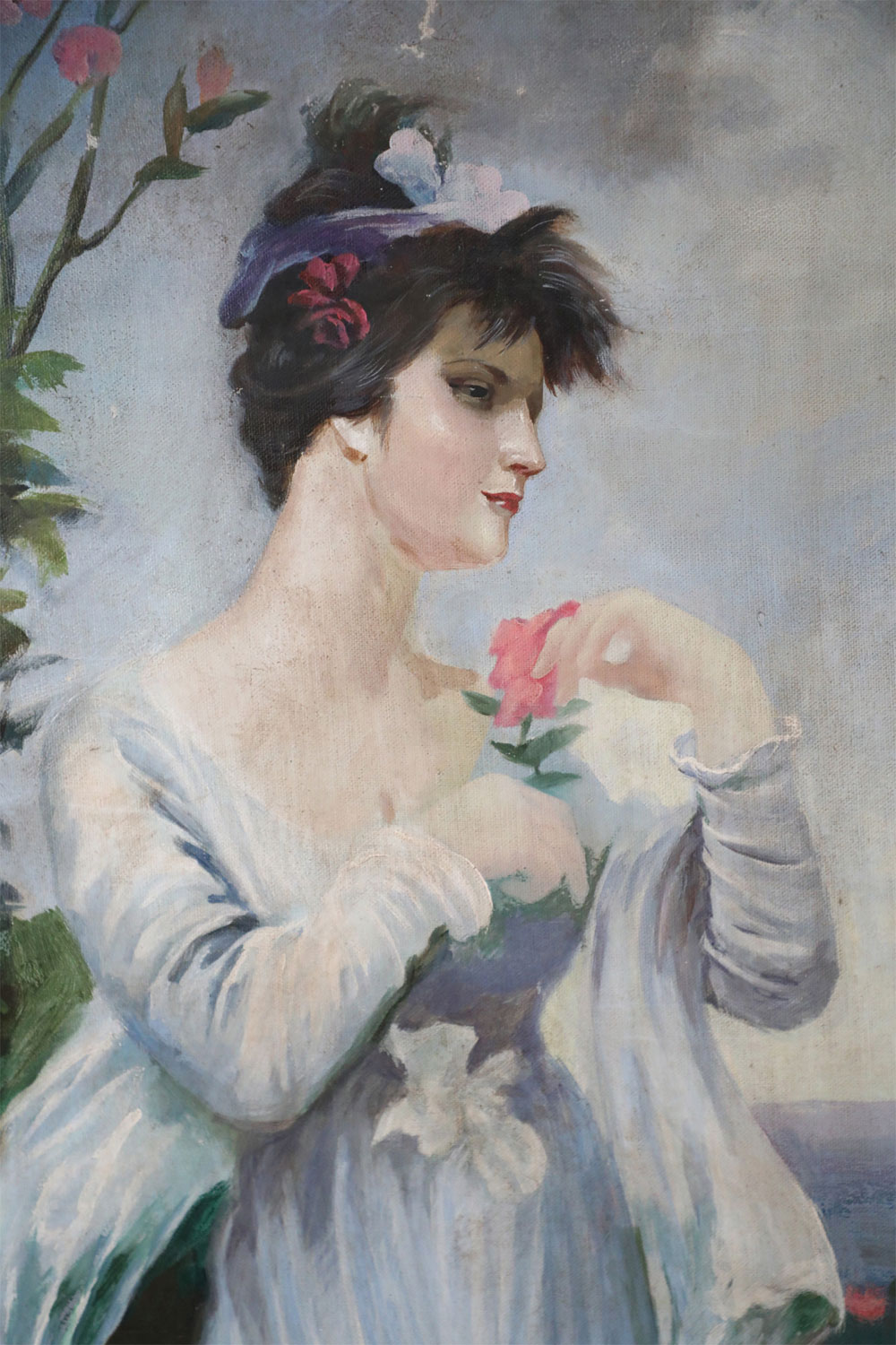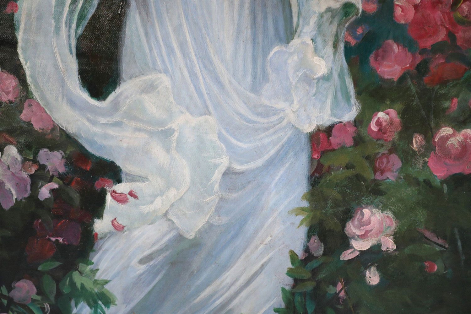 French Victorian style Neoclassical-style (20th Century) oil painting capturing a woman in a billowing white dress standing in a garden brimming with pink roses, with sea and sky in distant view. Painted on unframed canvas (Painting of similar subject/pose with differing details: NWL2271B).