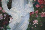 French Victorian style Neoclassical-style (20th Century) oil painting capturing a woman in a billowing white dress standing in a garden brimming with pink roses, with sea and sky in distant view. Painted on unframed canvas (Painting of similar subject/pose with differing details: NWL2271B)..