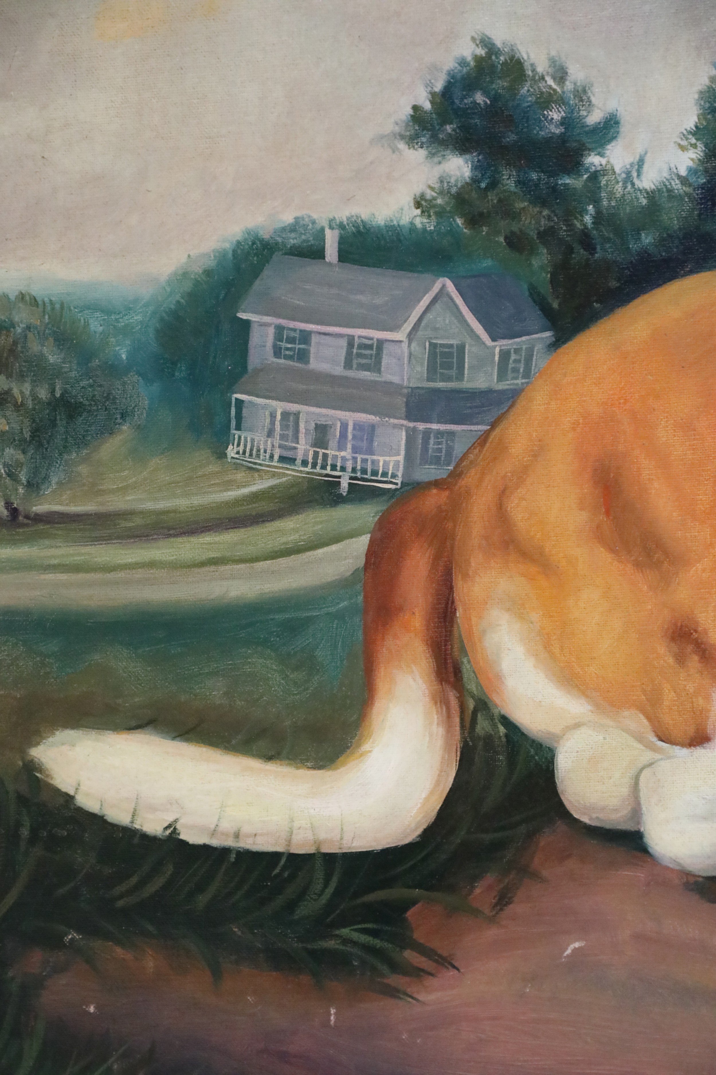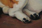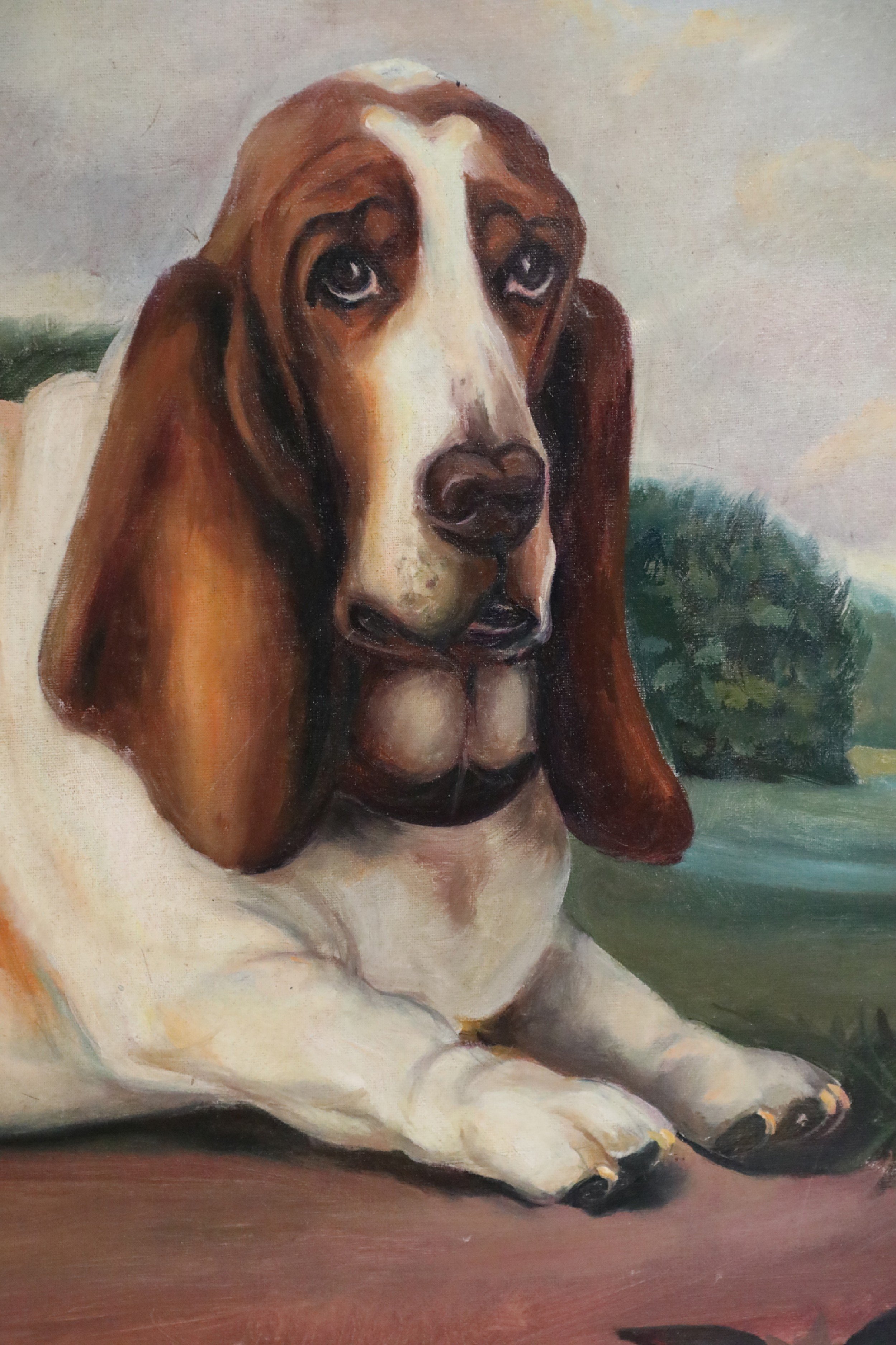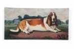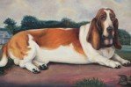 English Victorian style (20th Century) portrait of a brown and white basset hound captured lying on a path with a house and landscape scenery in the distance, on a large, rectangular unframed canvas (Similar copies with slight variations: NWL2274A, NWL2274B)..