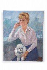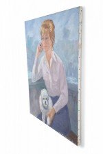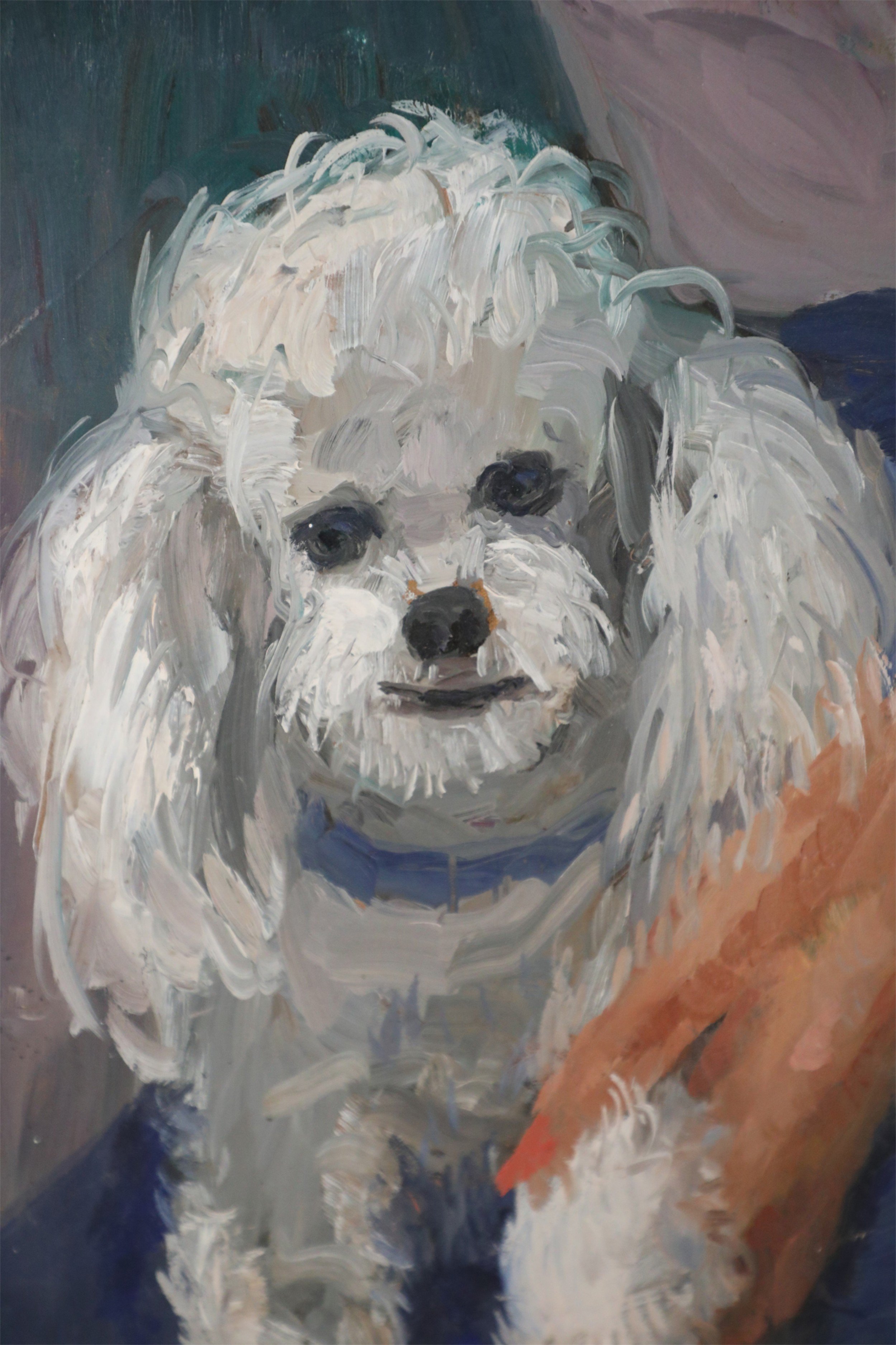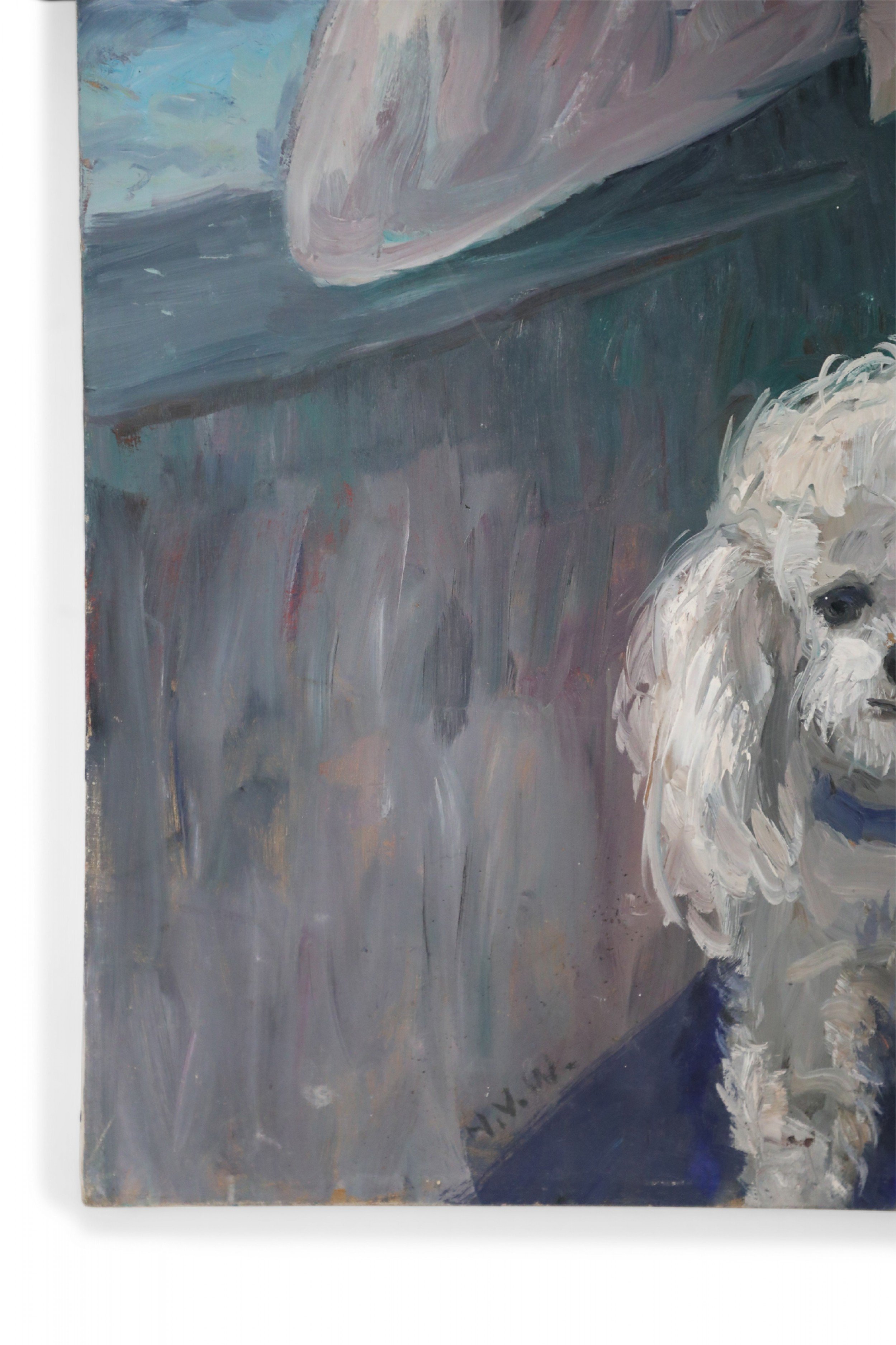 Vintage (20th Century) unframed canvas oil portrait of a woman seated with a small dog on her lap, leaning on her propped up arm as she gazes into the distance, amid a blue painterly abstract background..