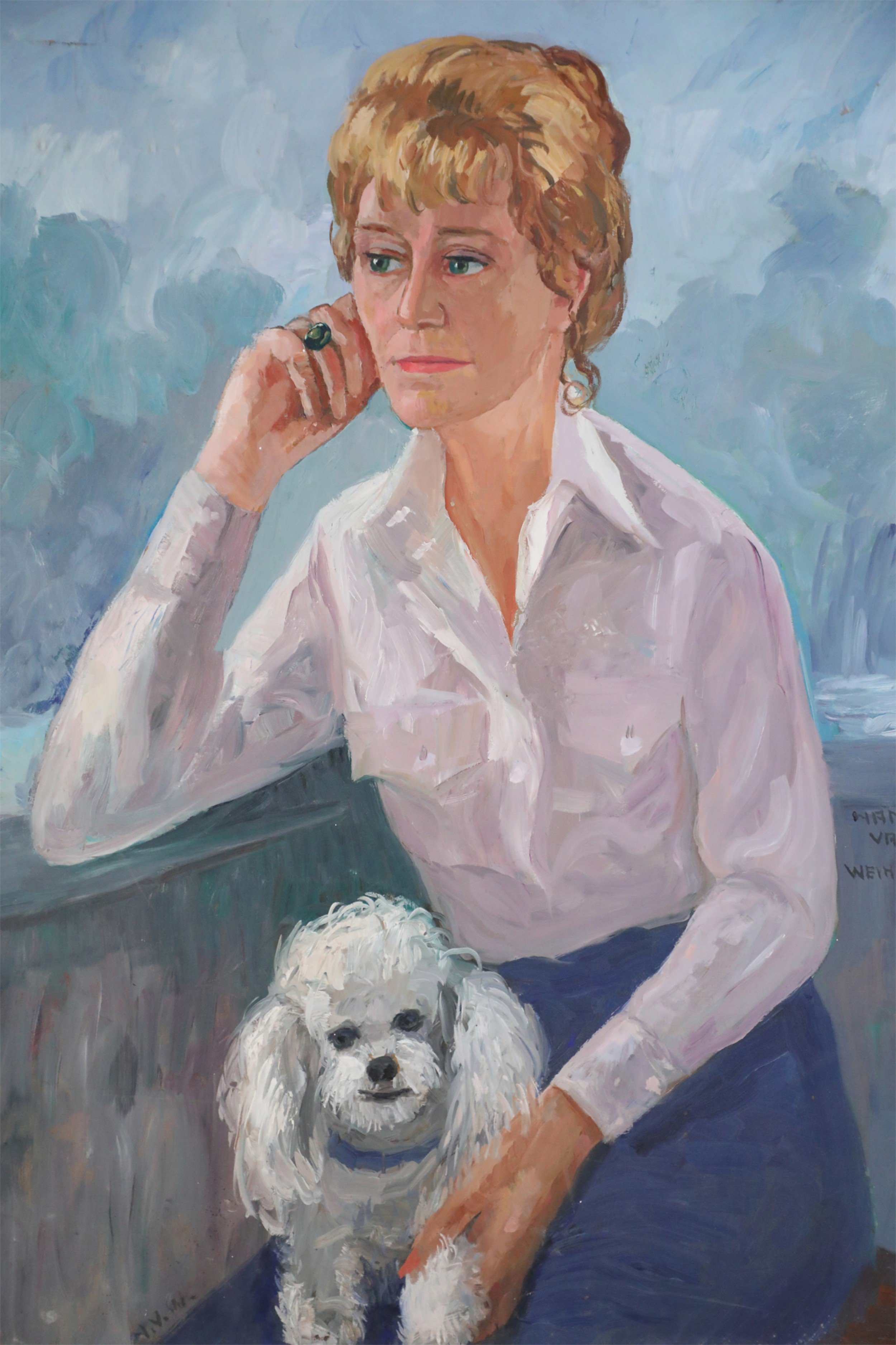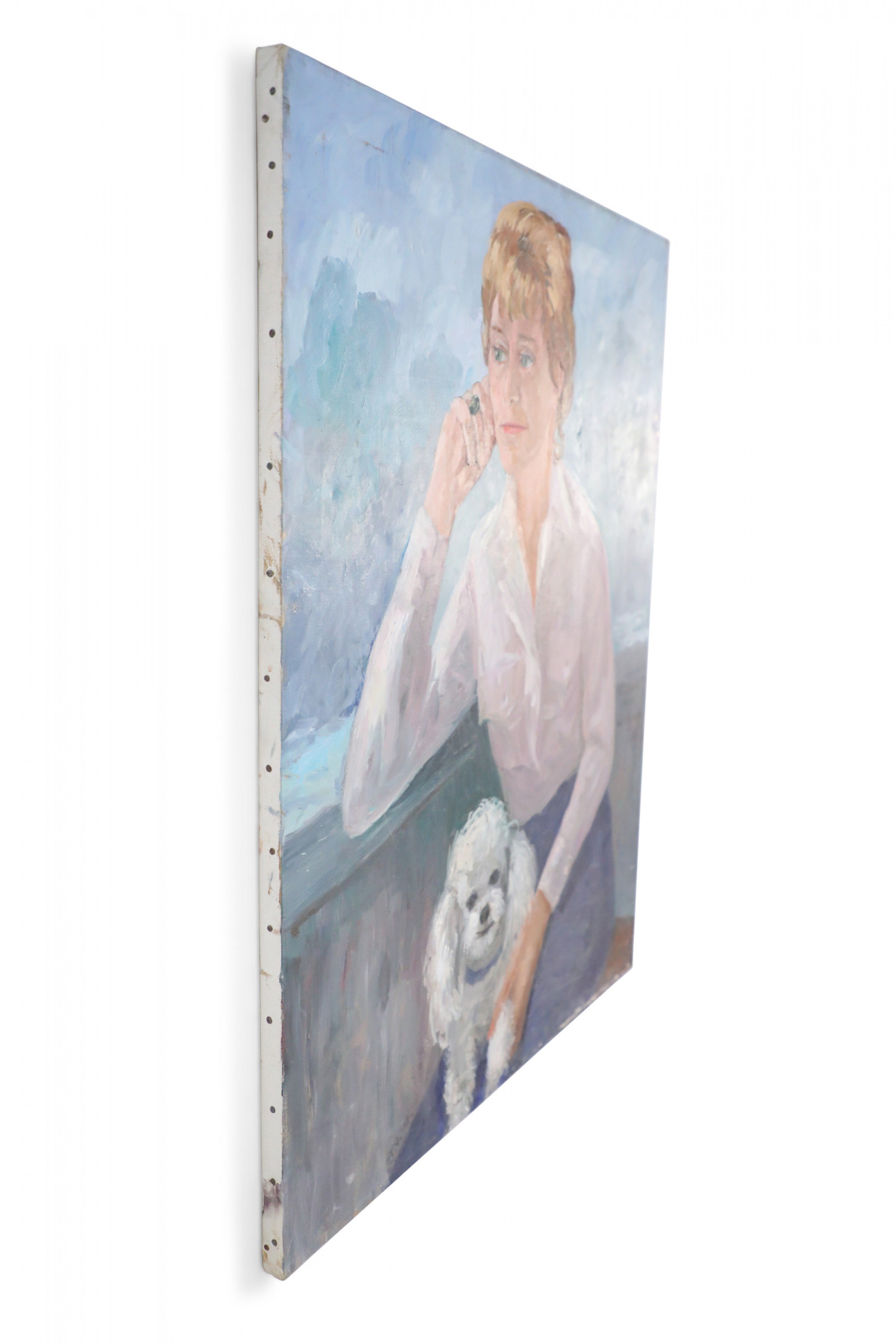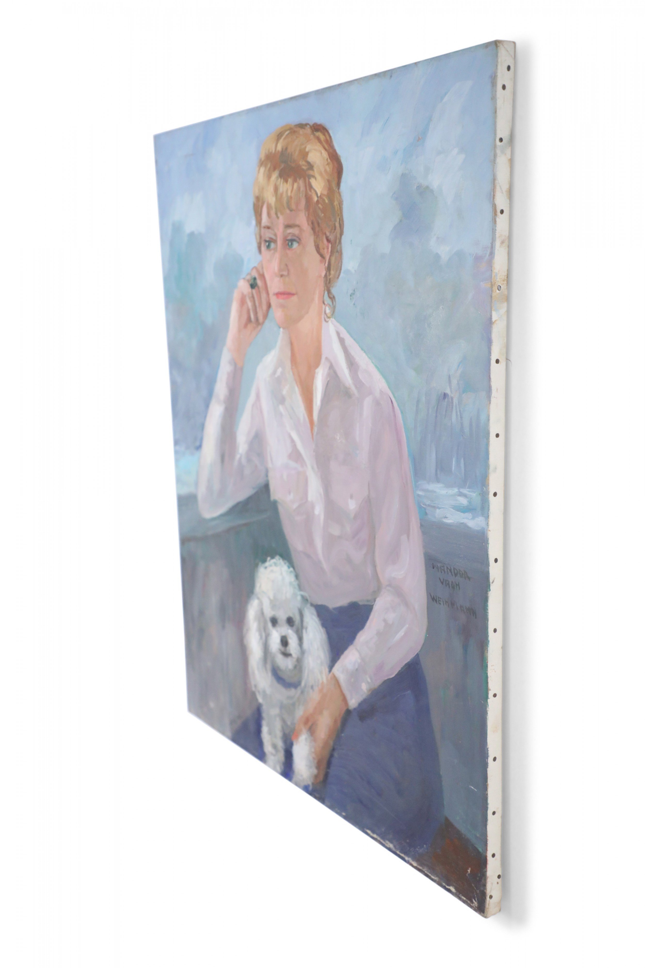 Vintage (20th Century) unframed canvas oil portrait of a woman seated with a small dog on her lap, leaning on her propped up arm as she gazes into the distance, amid a blue painterly abstract background.