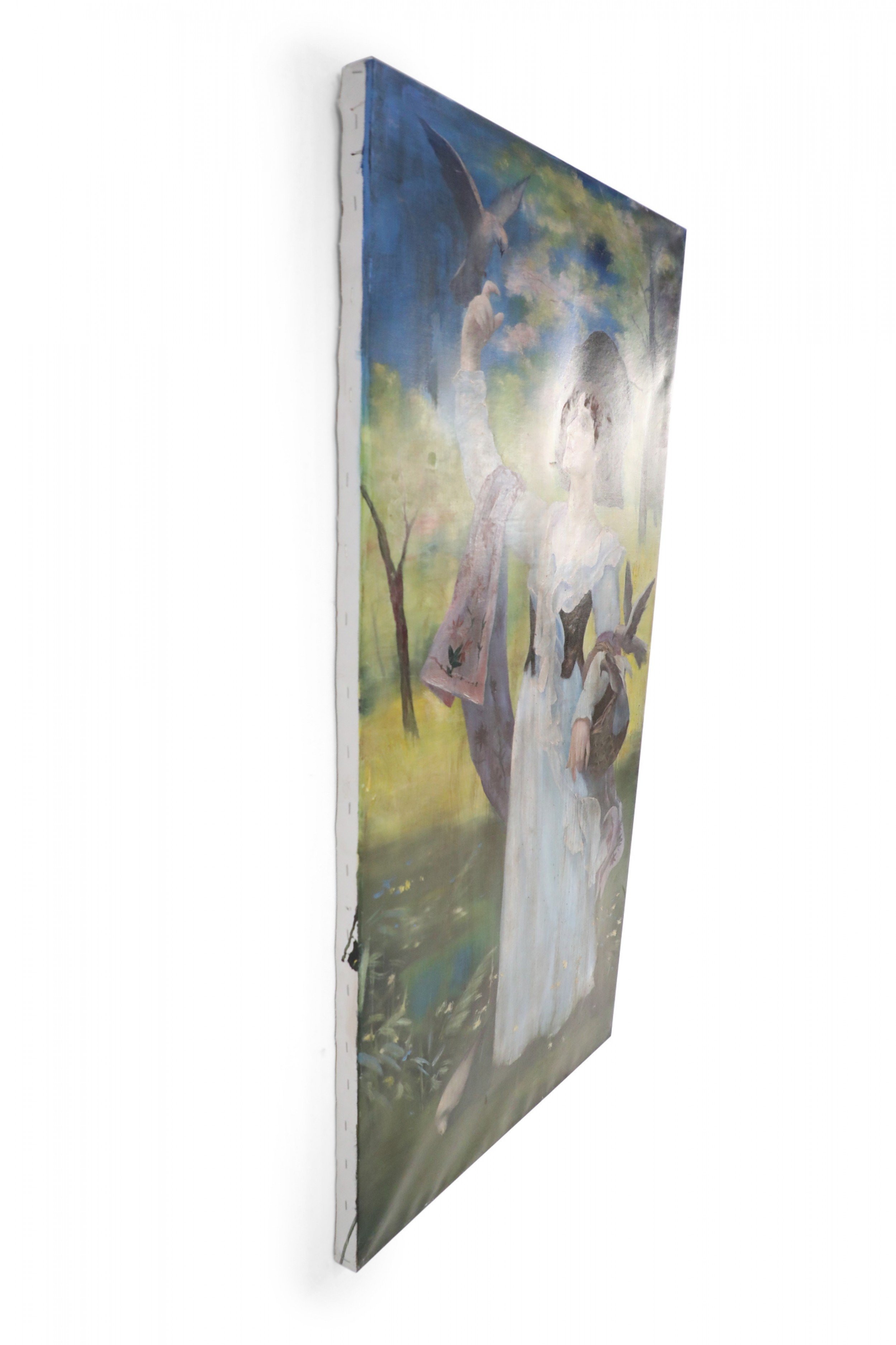 French Victorian style (20th Century) unframed painting of a woman wearing a white dress and mauve shawl in a natural setting, with a basket on one arm and a bird perched on her opposite, raised hand, painted on stretched canvas.