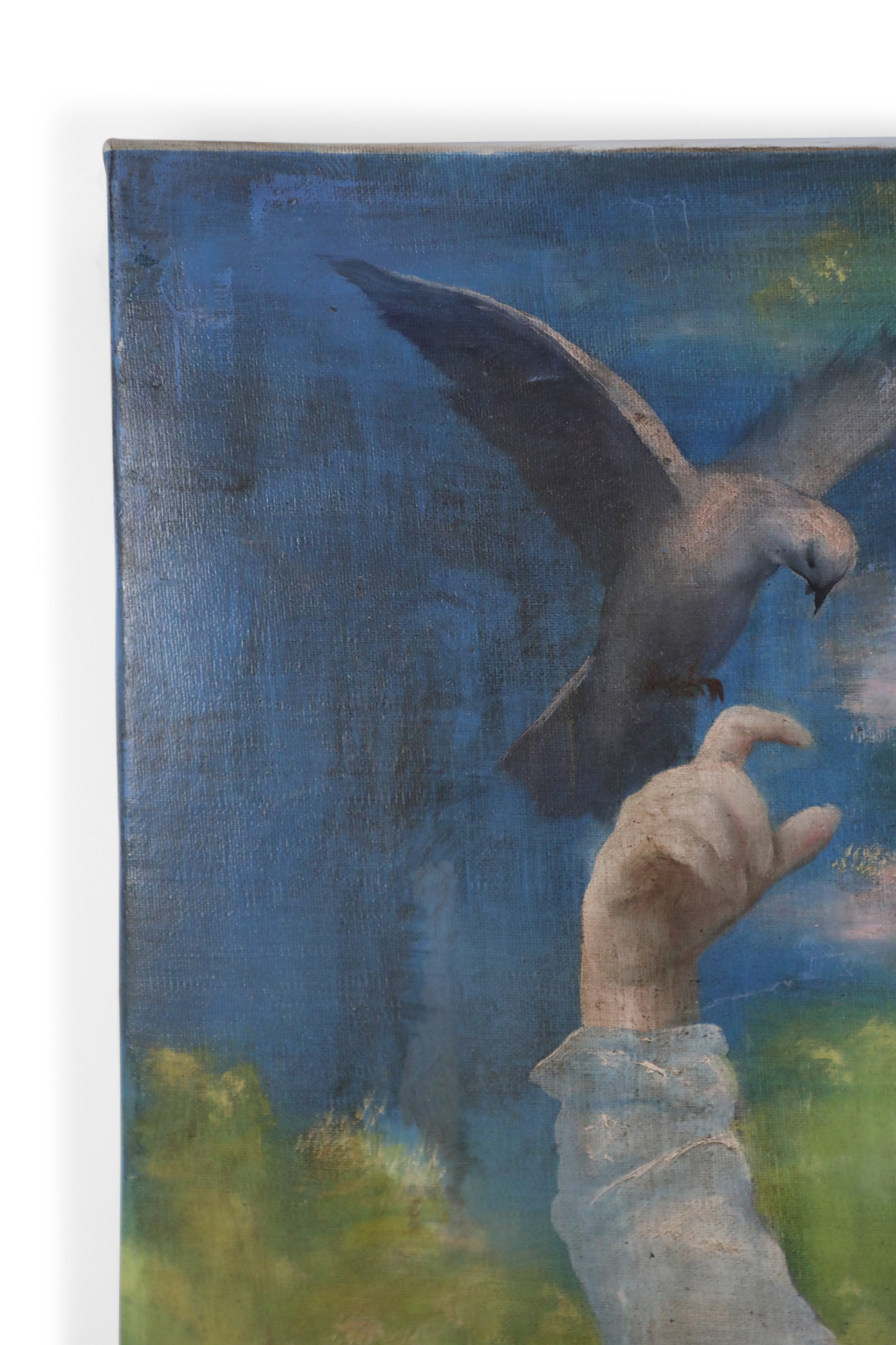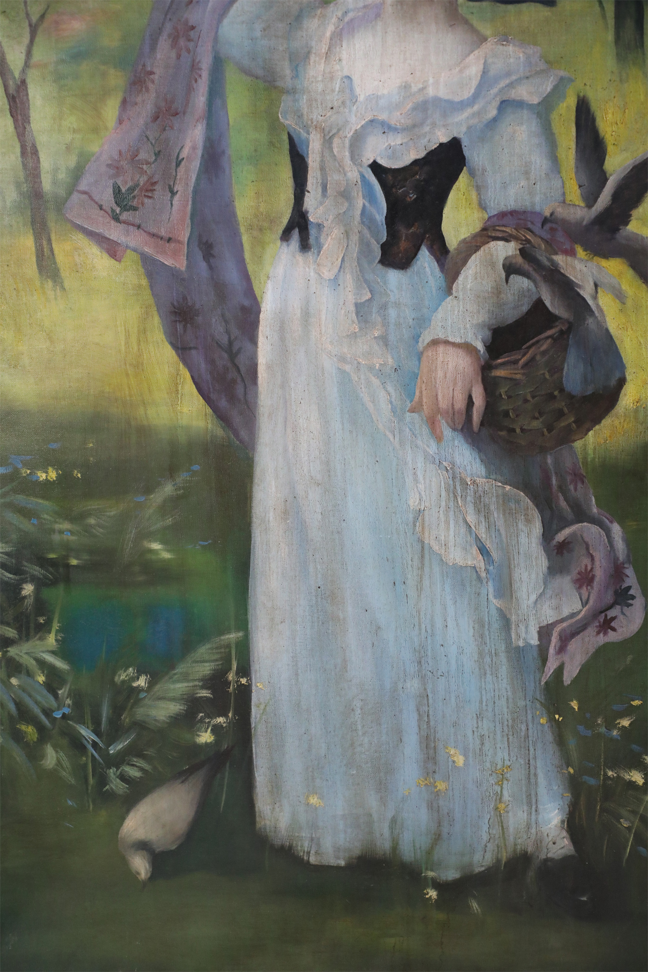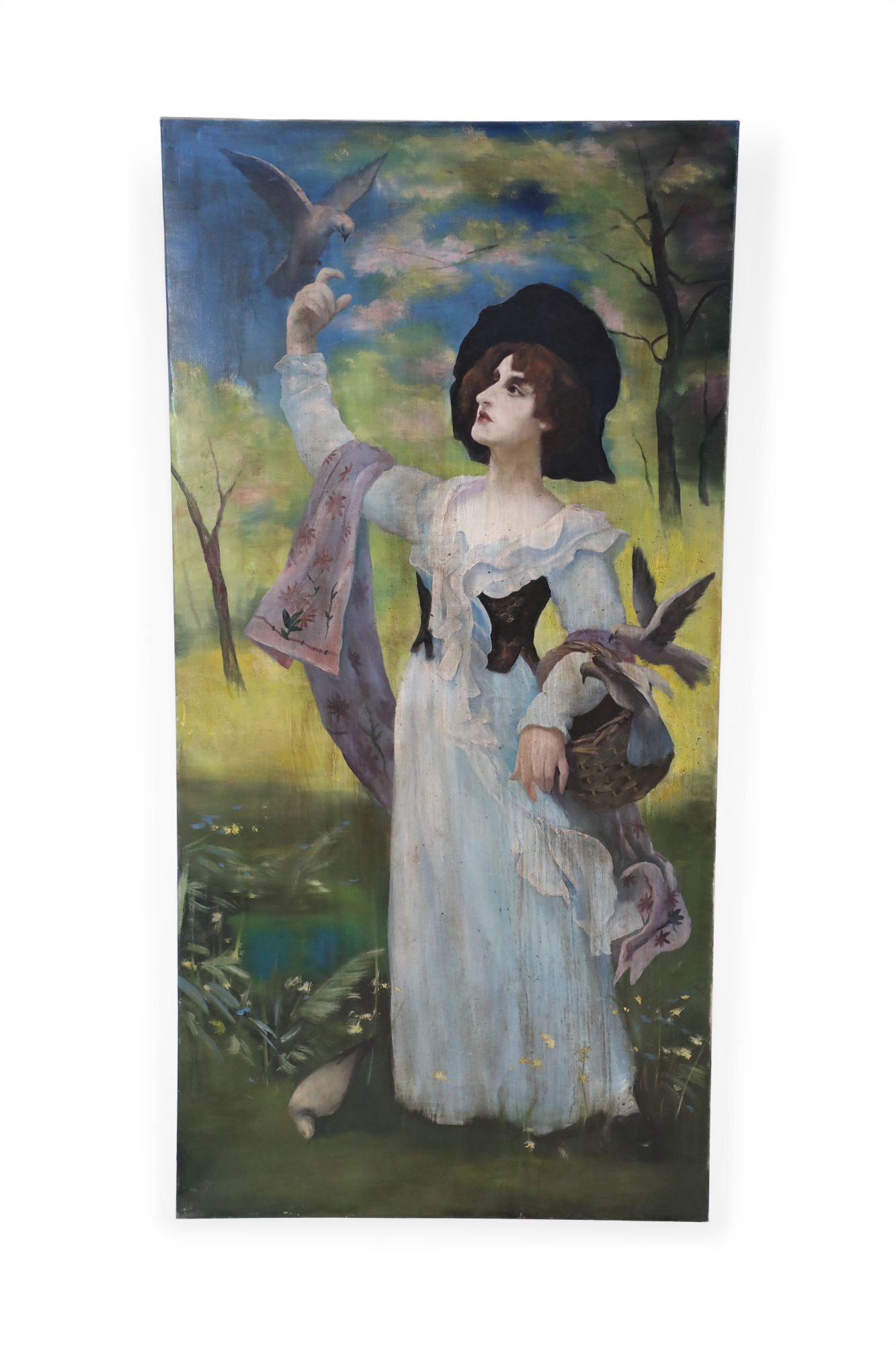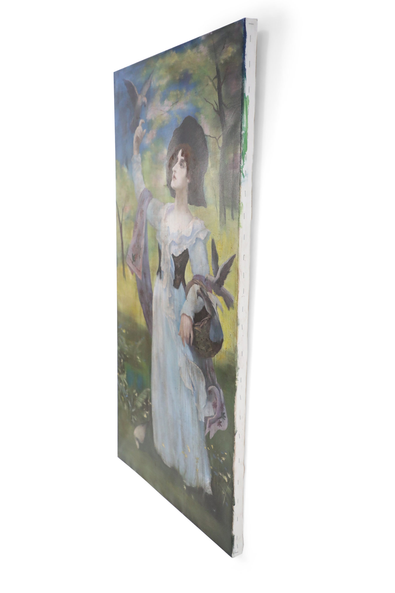 French Victorian style (20th Century) unframed painting of a woman wearing a white dress and mauve shawl in a natural setting, with a basket on one arm and a bird perched on her opposite, raised hand, painted on stretched canvas..