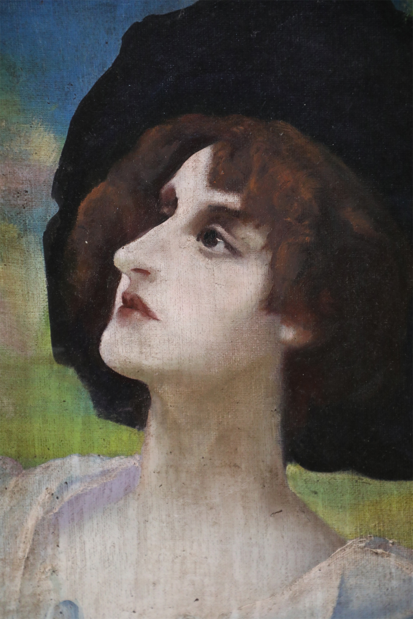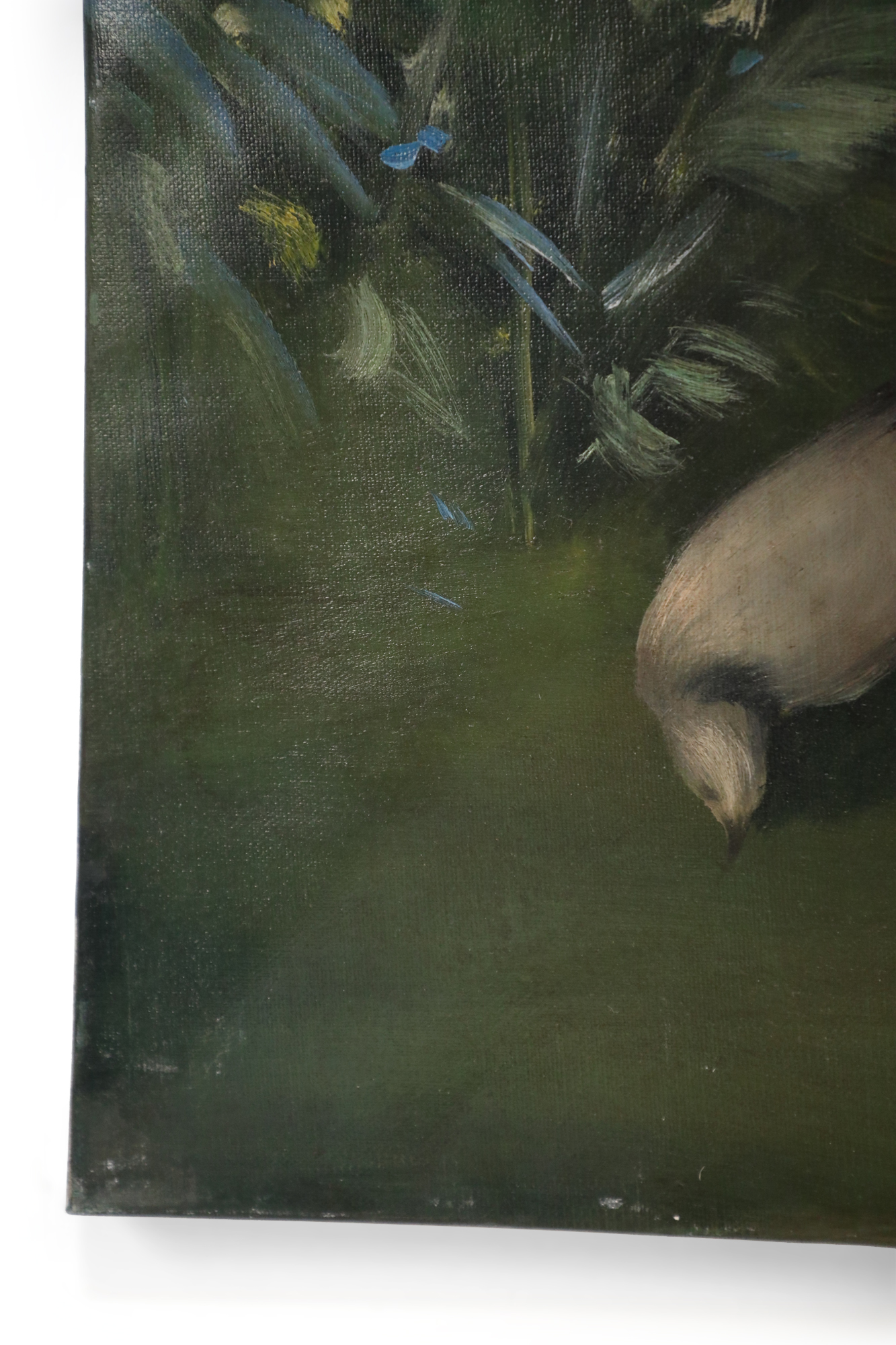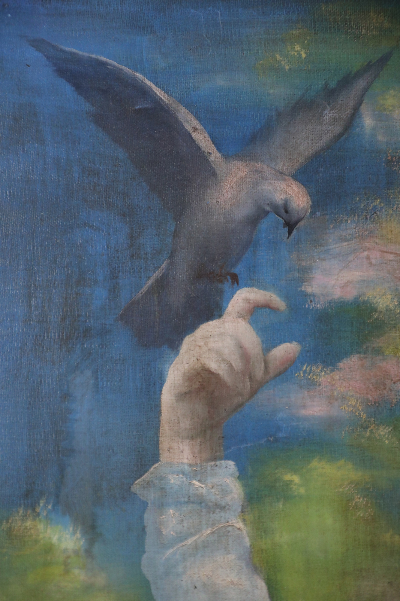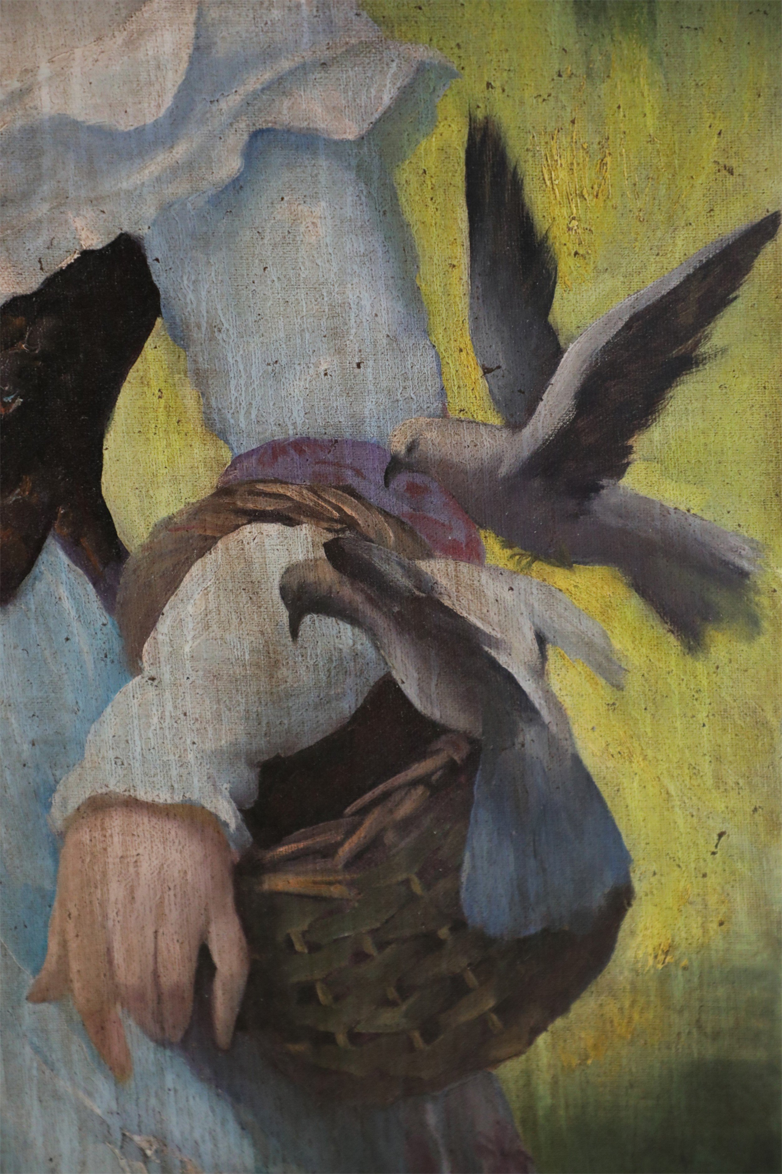 French Victorian style (20th Century) unframed painting of a woman wearing a white dress and mauve shawl in a natural setting, with a basket on one arm and a bird perched on her opposite, raised hand, painted on stretched canvas..