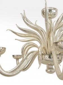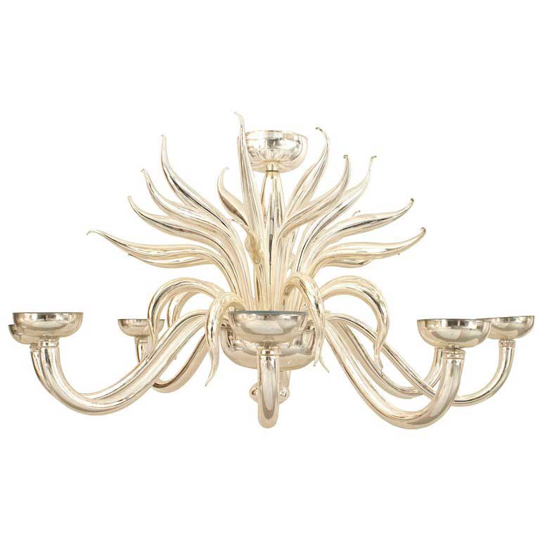 Post-War Design Italian Venetian Murano silvered glass chandelier with multiple scroll 8 arms and multiple scrolls emanating from a center shaft with a final and bowl bottom.